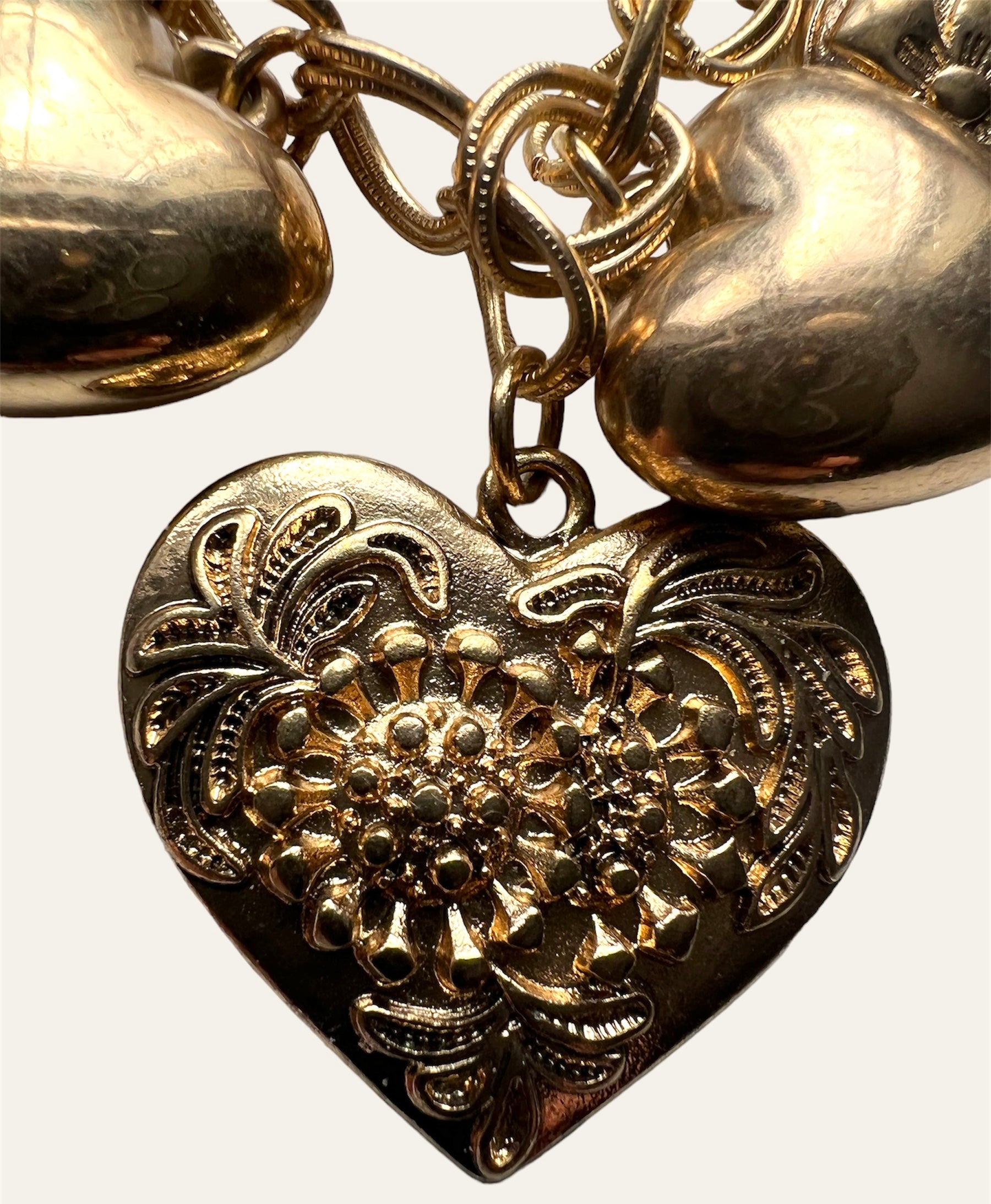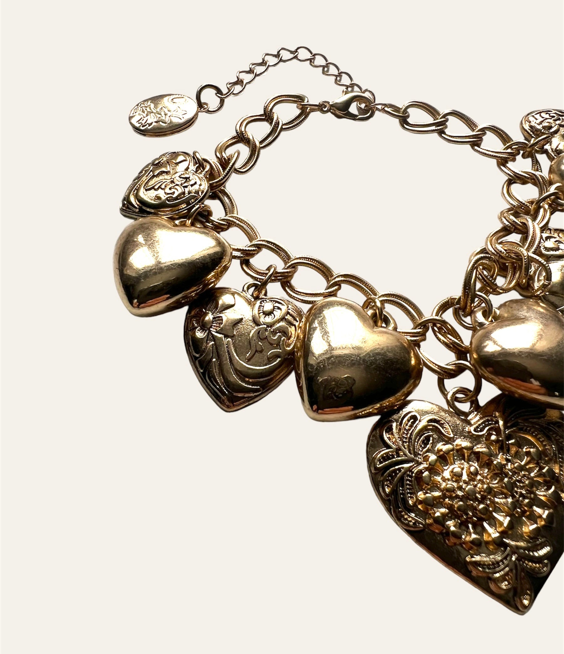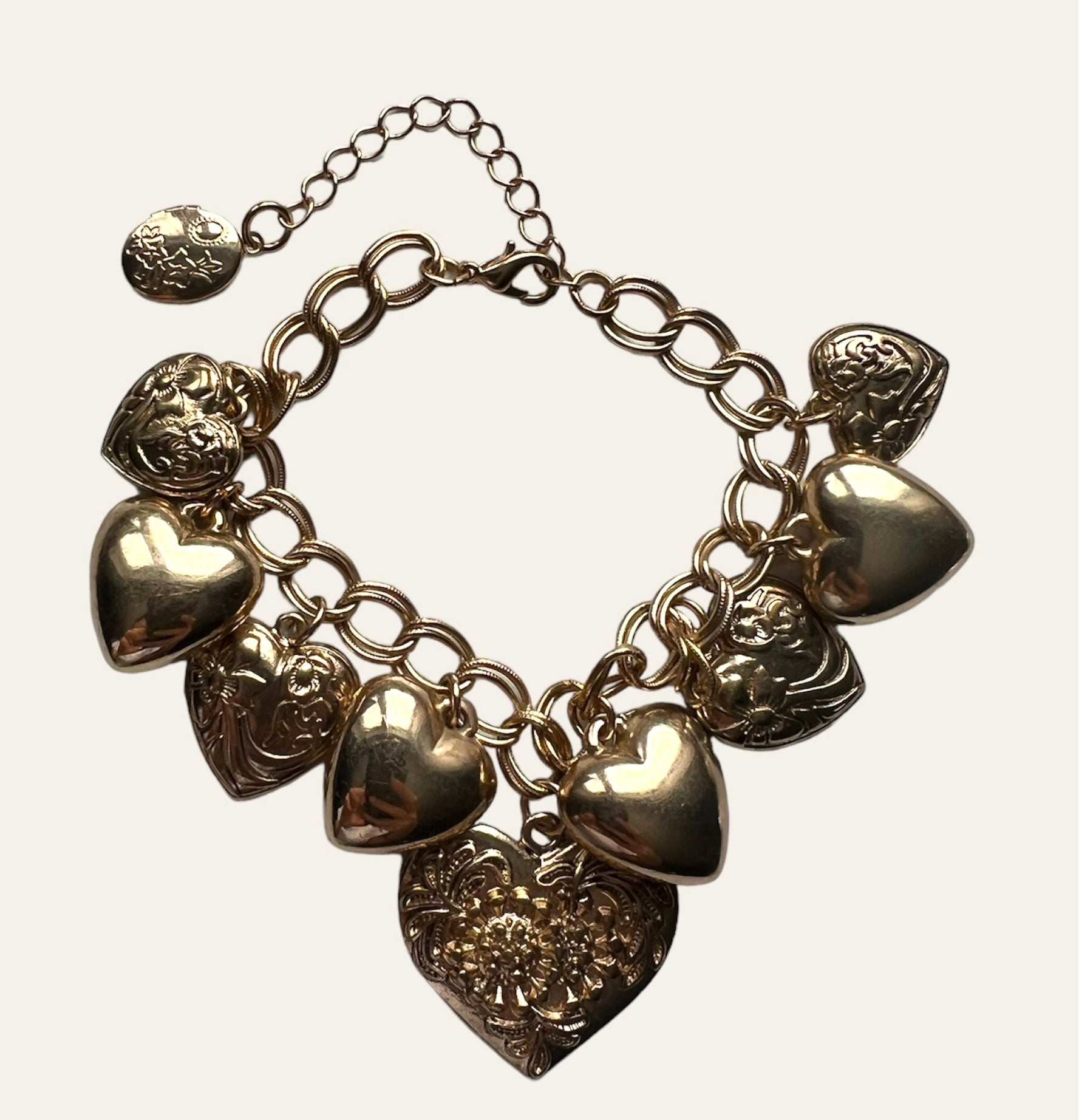 Unmarked beautiful charm bracelet with textured hearts. It has 9 hearts in total. It's really charming. Makes me think of the perfect Italian Summer. SO CUTE!