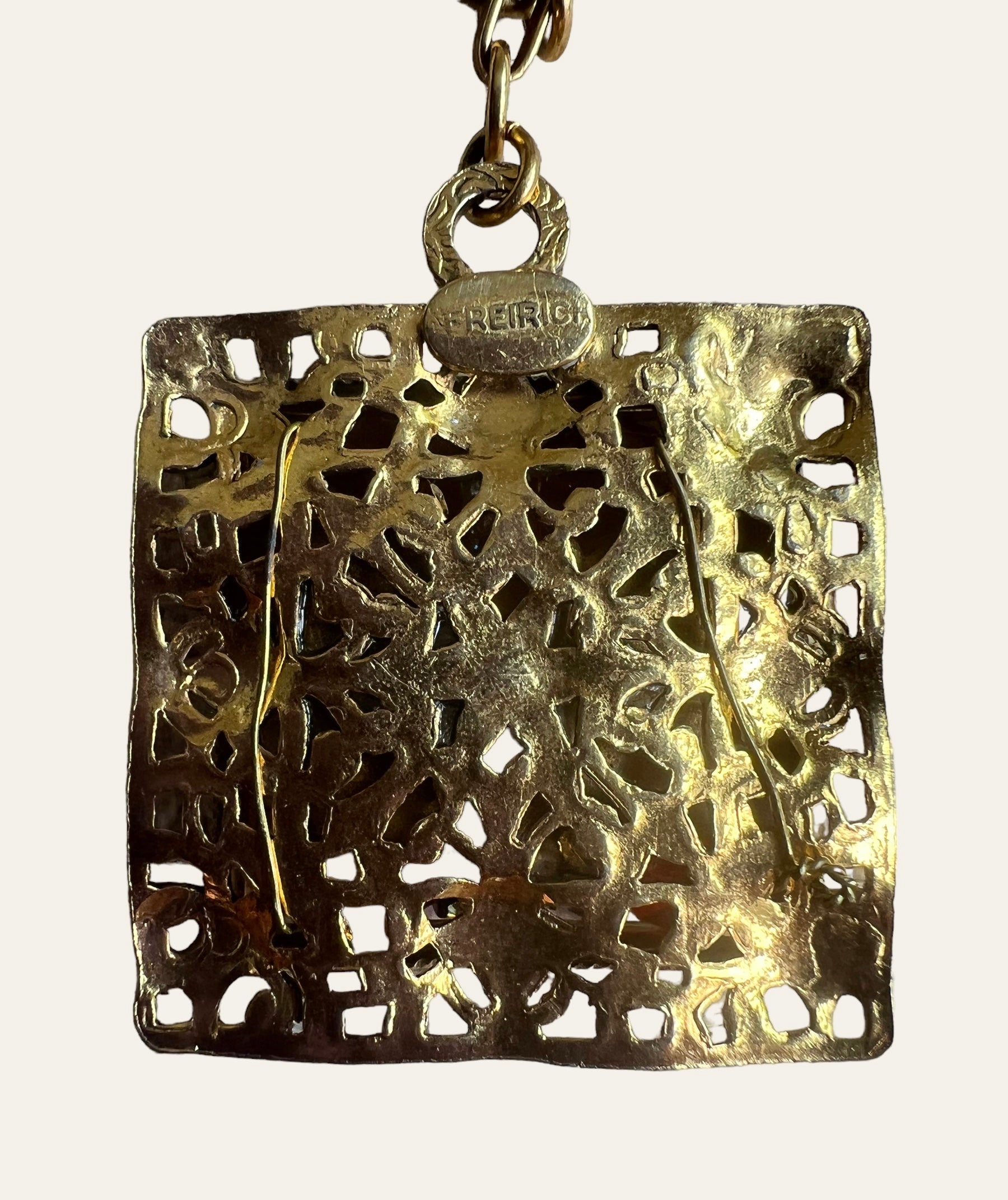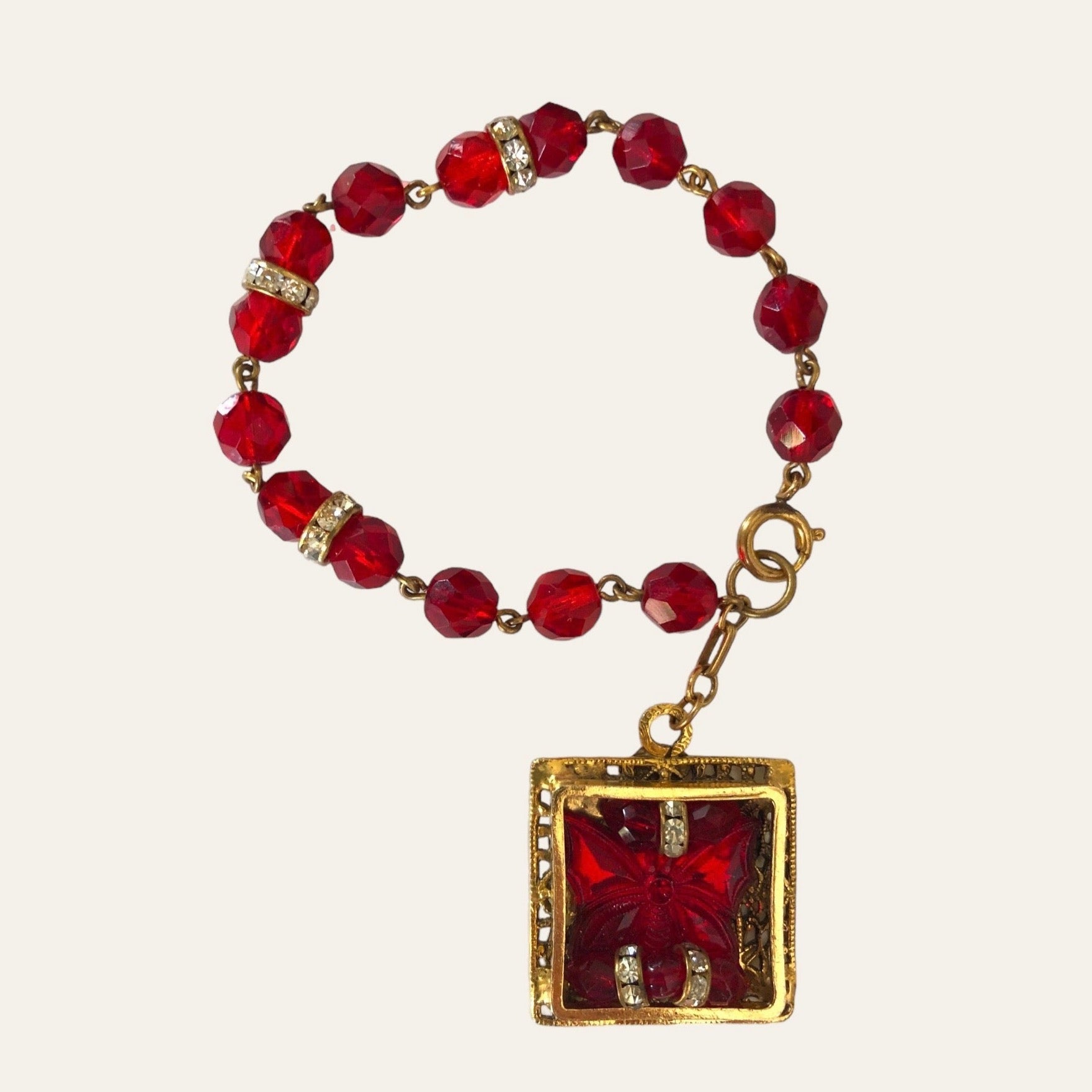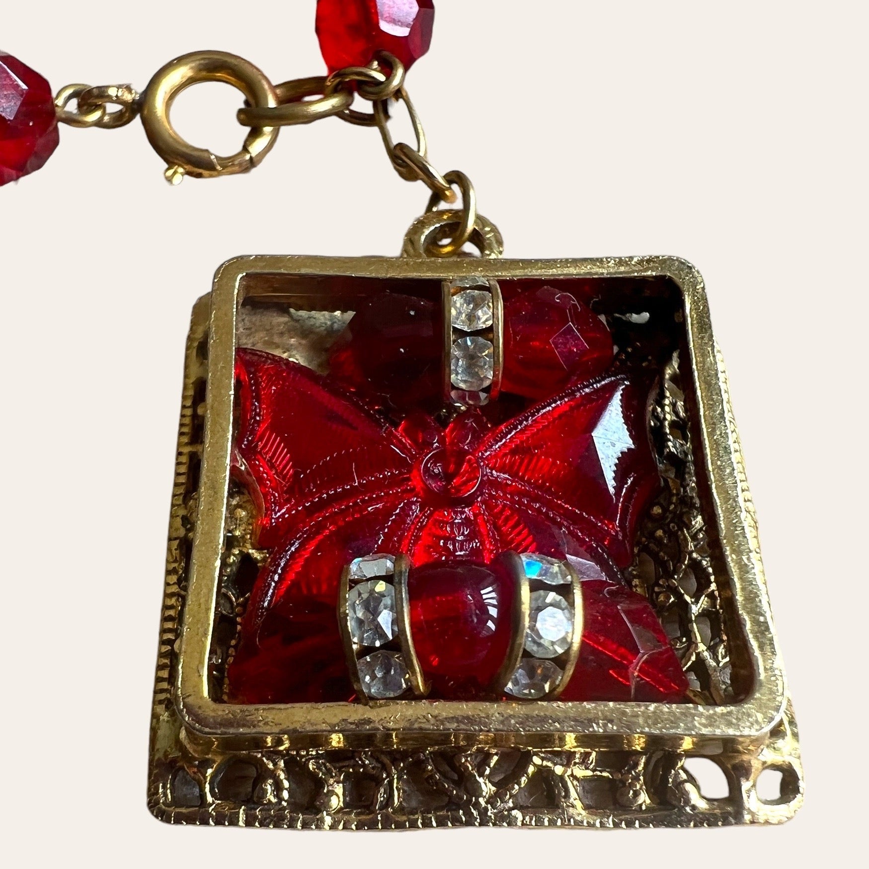 This a rare and UNIQUE piece signed by Freirich. This is the most romantic piece I own and it features ruby red glass crystals and large charm accented with crystals and a butterfly. It is so beautiful! Freirich jewelry have an excellent quality and have this fine antique Victorian look. They used to make millinery and dress ornaments for Chanel and Dior.