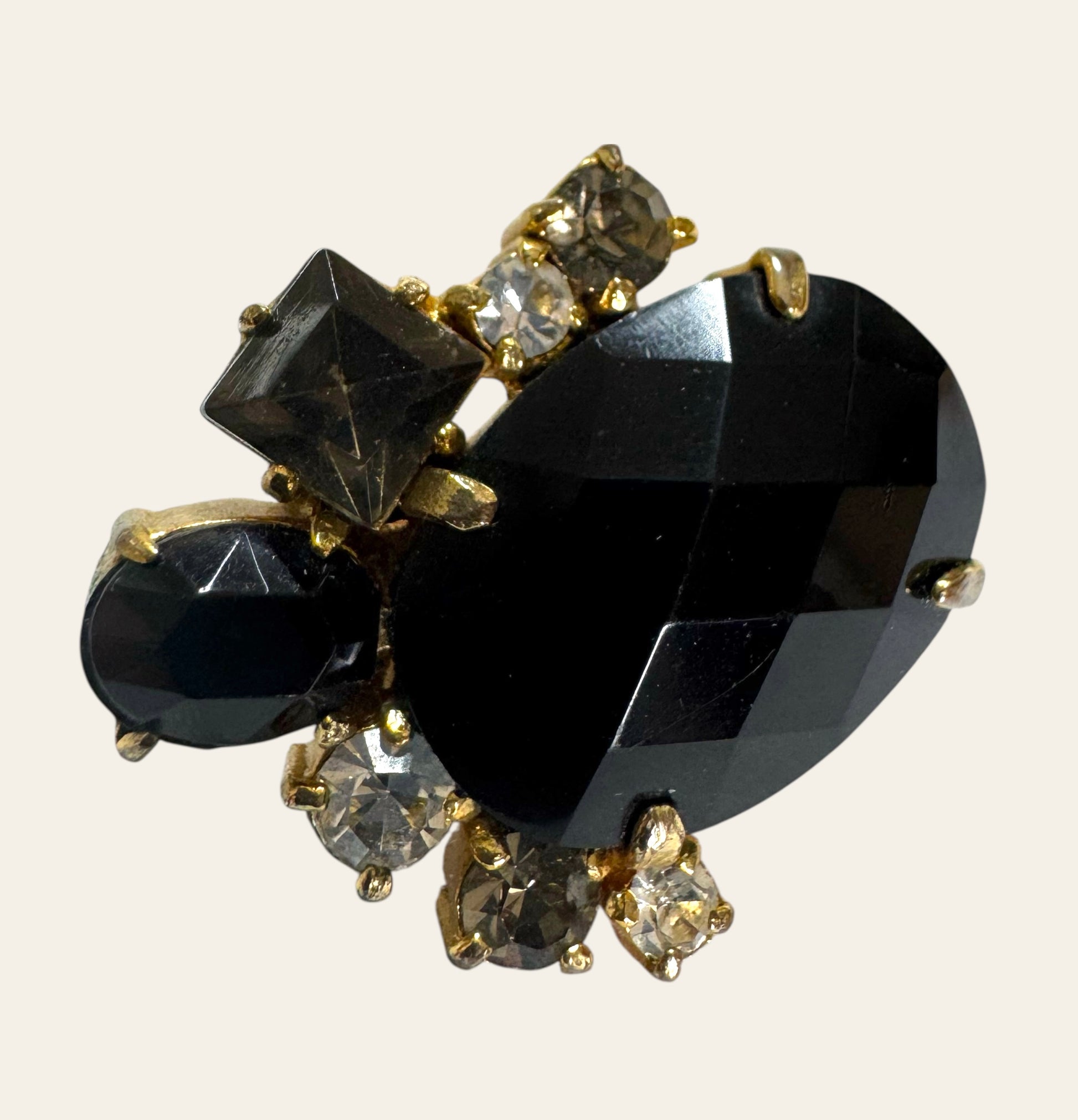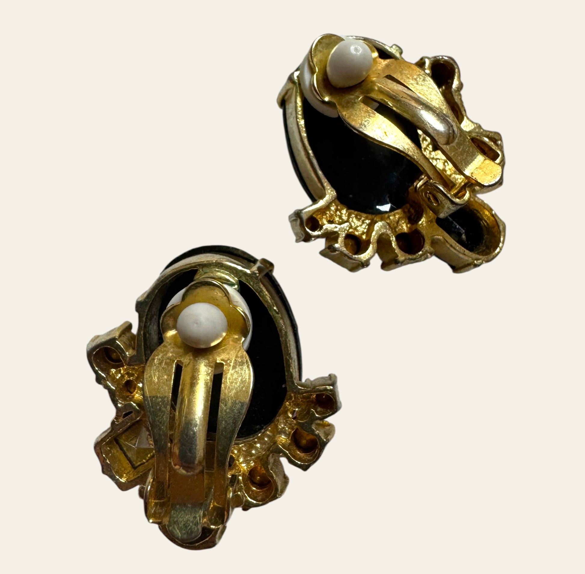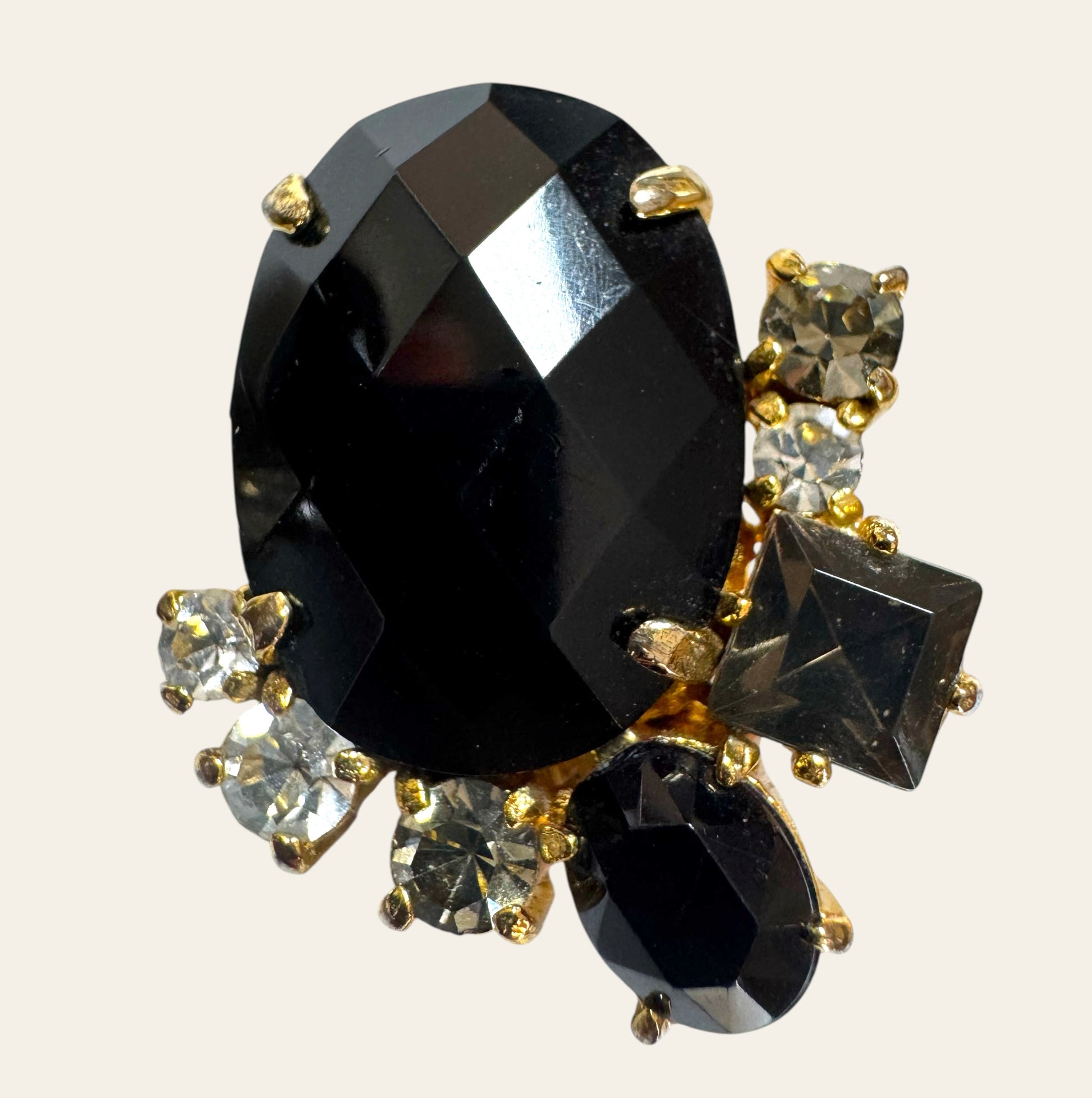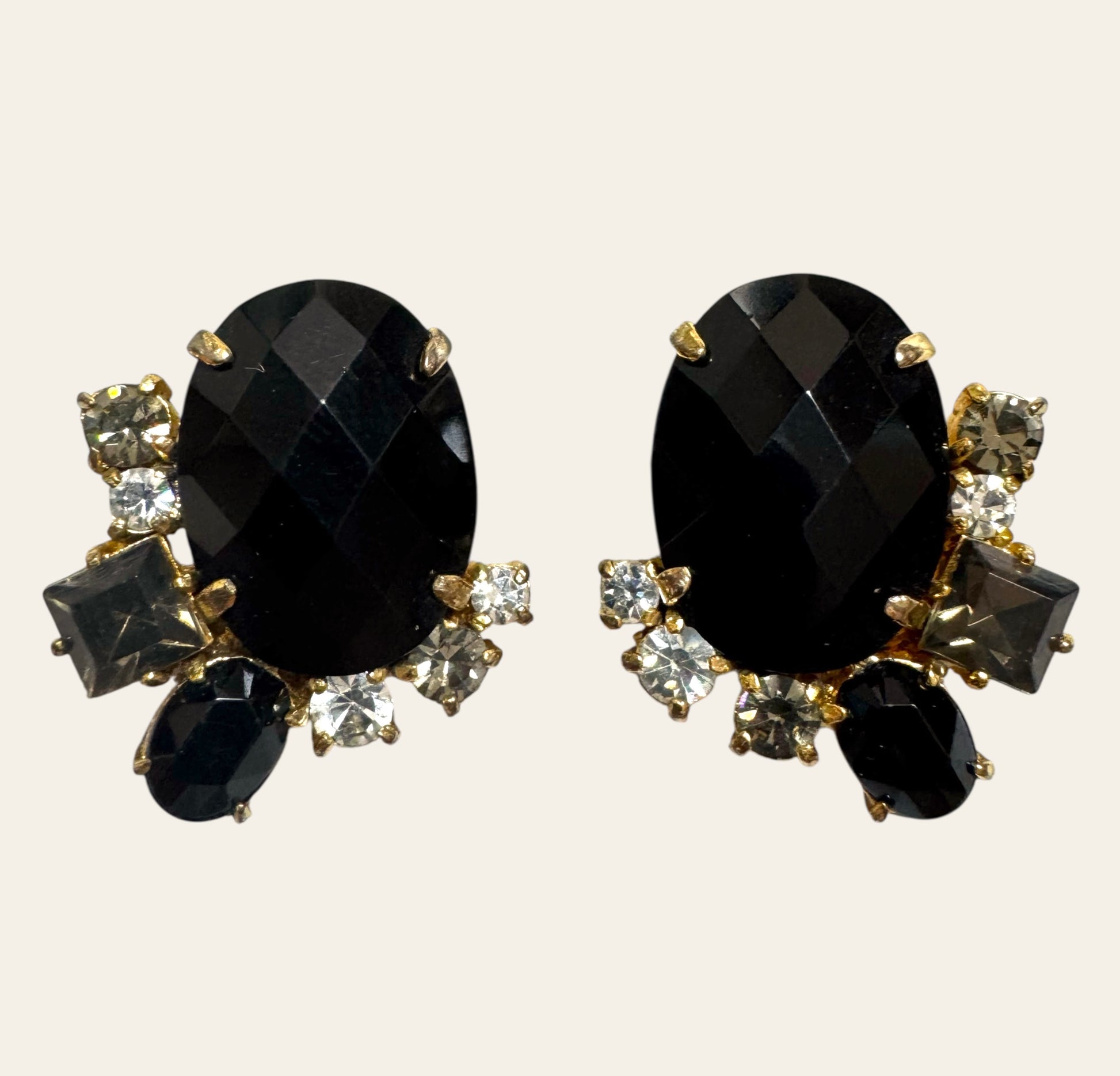 Timeless and seductive, these unsigned vintage clip-on earrings feature a faceted black oval stone at the center, surrounded by a dynamic arrangement of sparkling clear and smoky rhinestones in varied cuts. The mix of round, square, and pear-shaped crystals creates an elegant contrast of sharp edges and soft sparkle—like a midnight sky studded with diamonds.
