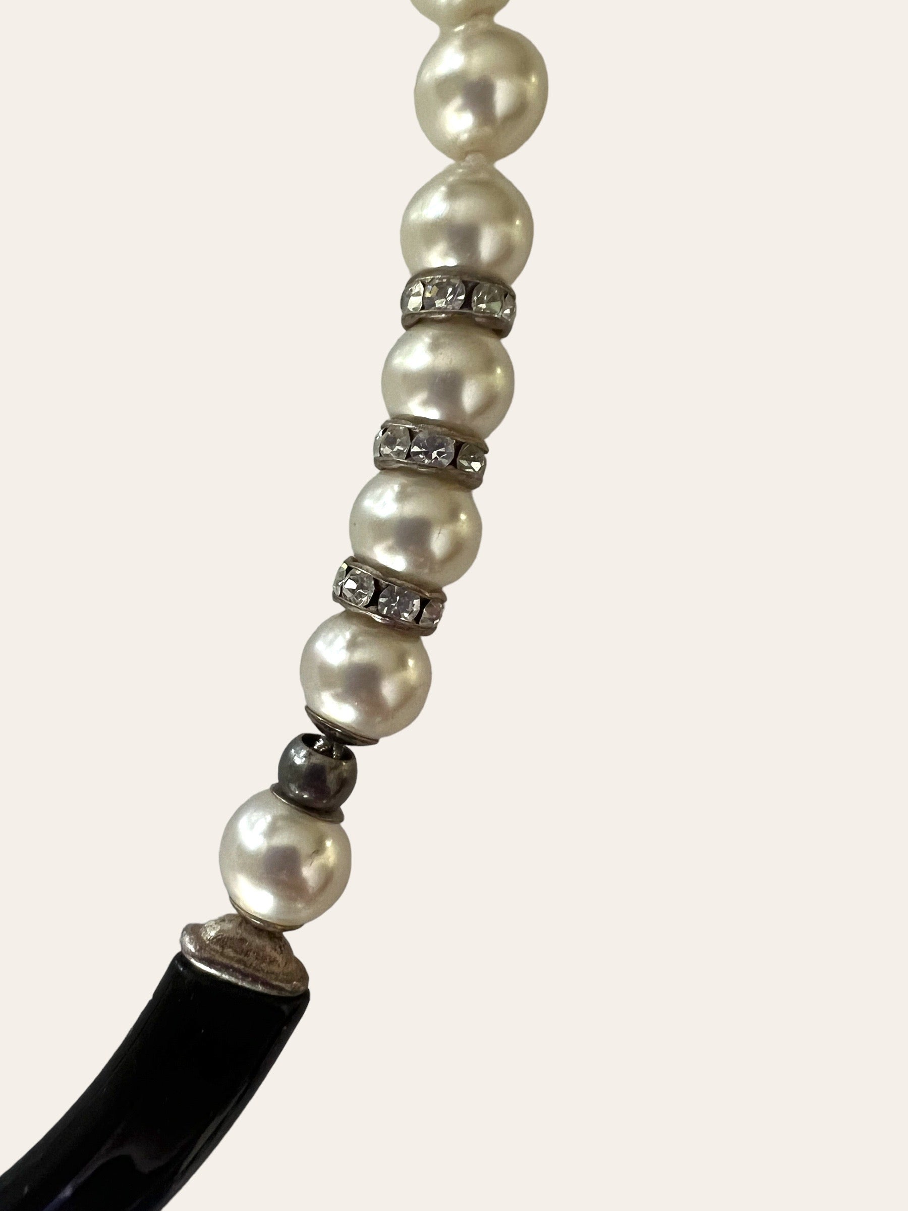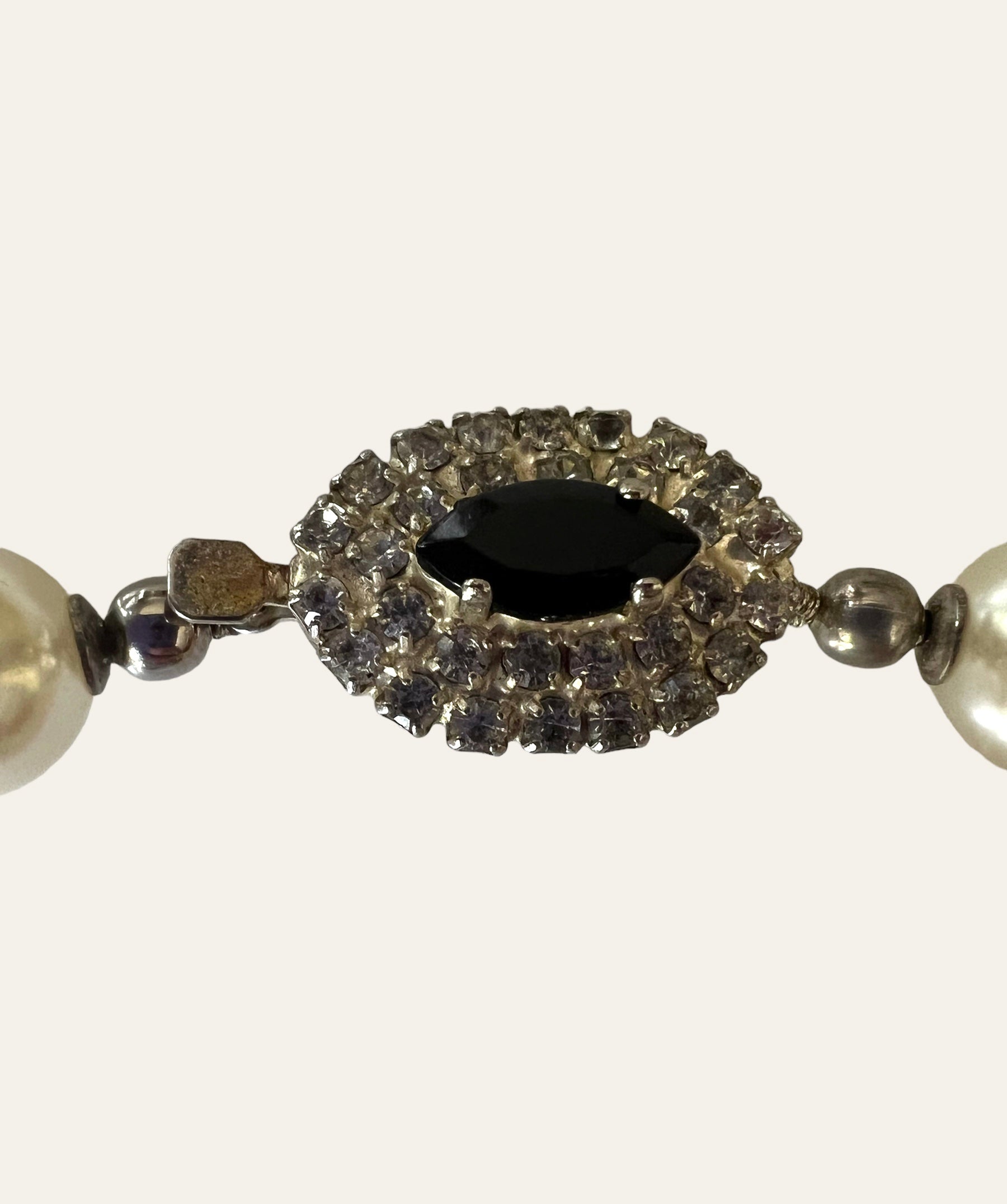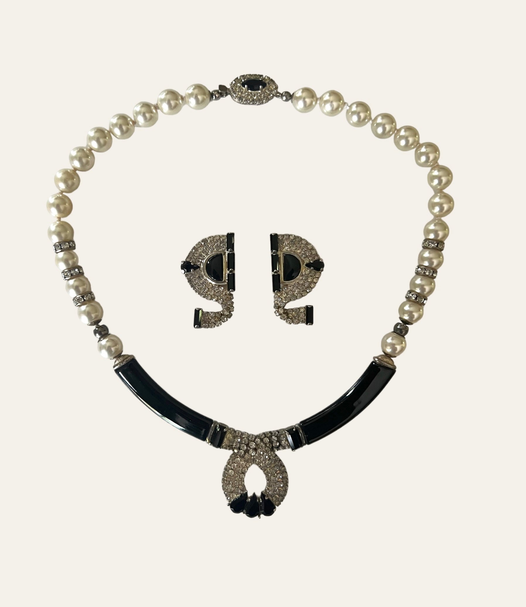 Unsigned magnificent 1970's Italian black and white demi set that will glow up your looks. It features white faux pearls with black and clear crystals. It has large glass elements in a glossy black meeting the knot of clear rhinestones embellished by three black crystals. The necklace has an elegant crystal oval clasp featuring a pave of sparkling clear rhinestones and a Marquise black crystal. The details are stunning and add that shimmer sparkle and shine effect.