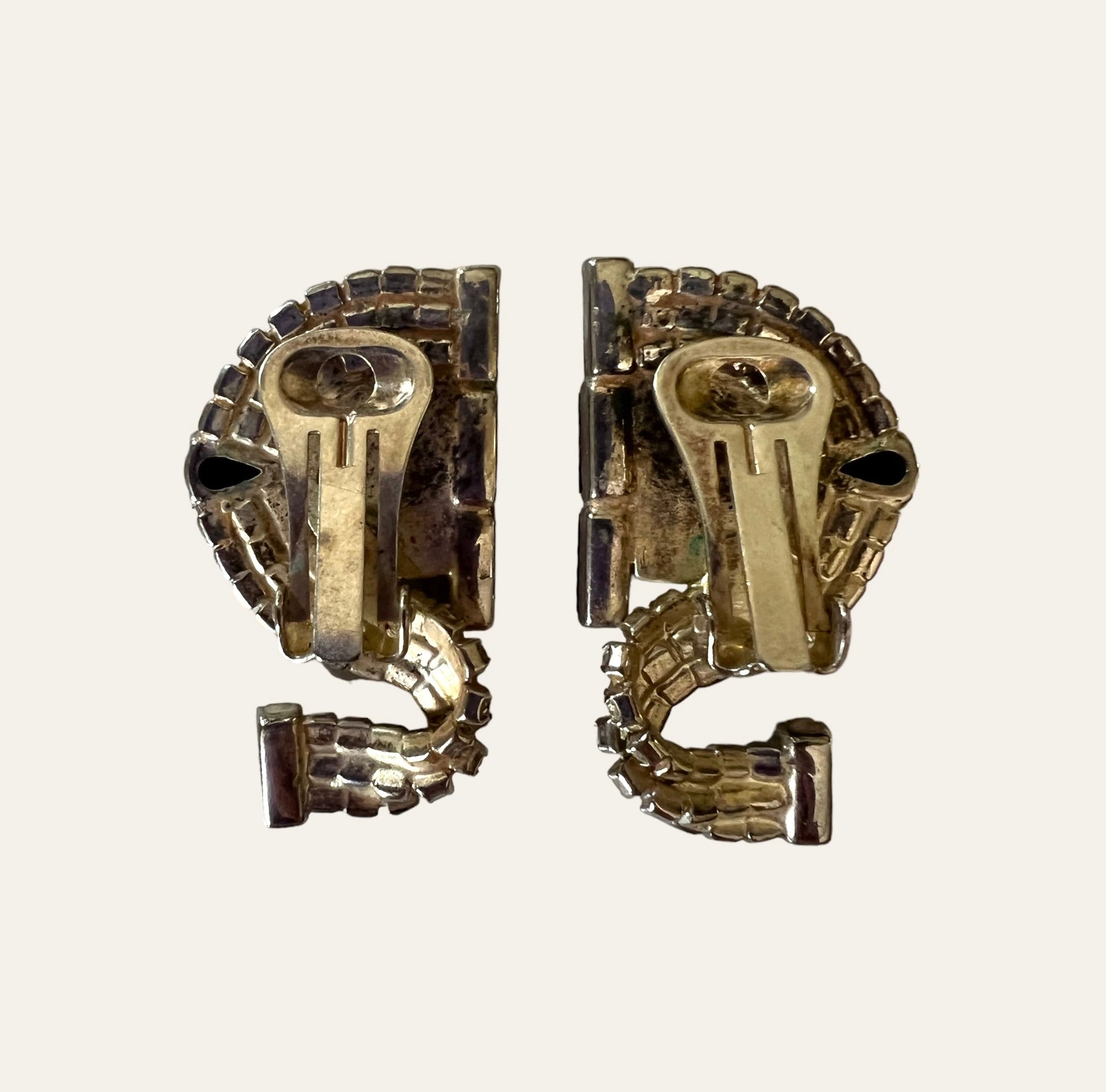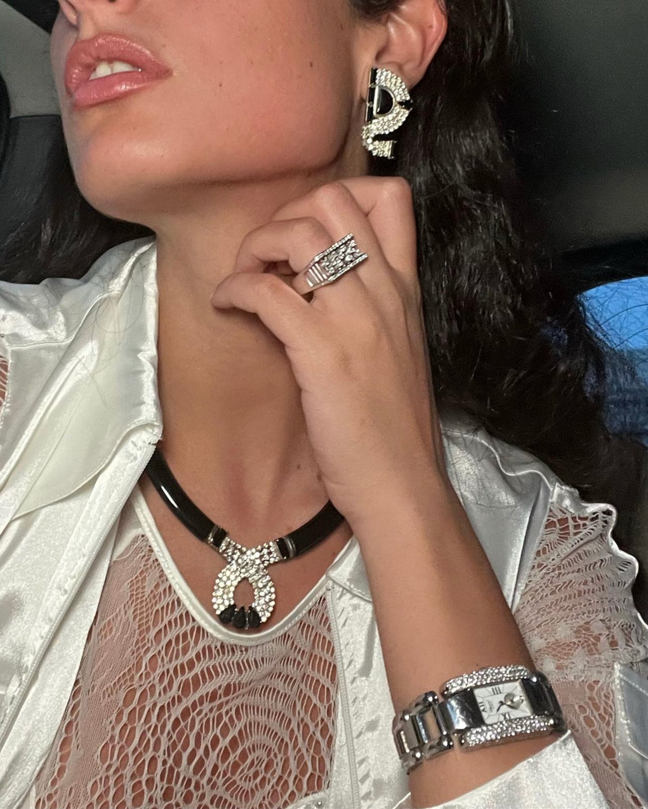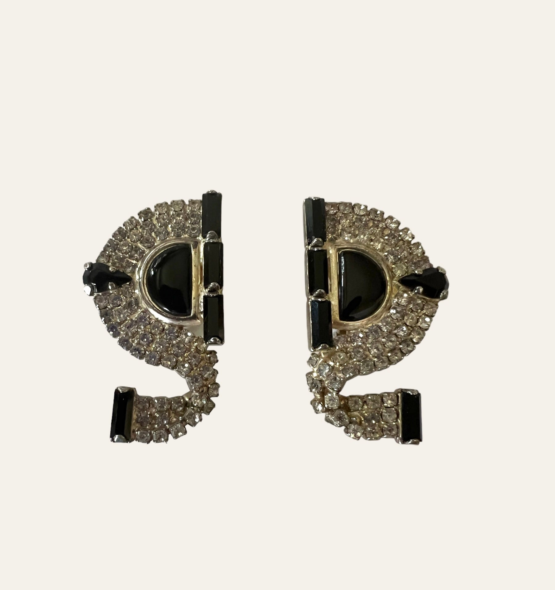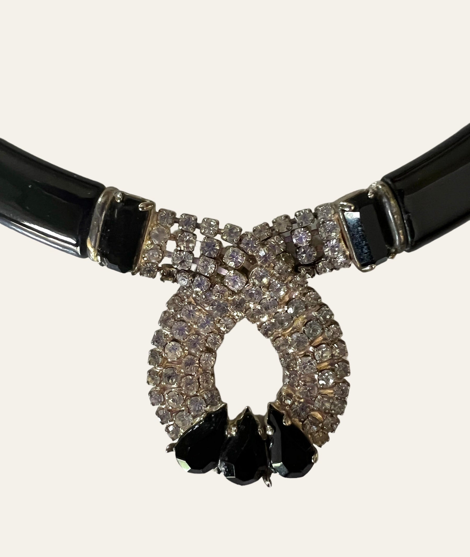 Unsigned magnificent 1970's Italian black and white demi set that will glow up your looks. It features white faux pearls with black and clear crystals. It has large glass elements in a glossy black meeting the knot of clear rhinestones embellished by three black crystals. The necklace has an elegant crystal oval clasp featuring a pave of sparkling clear rhinestones and a Marquise black crystal. The details are stunning and add that shimmer sparkle and shine effect.