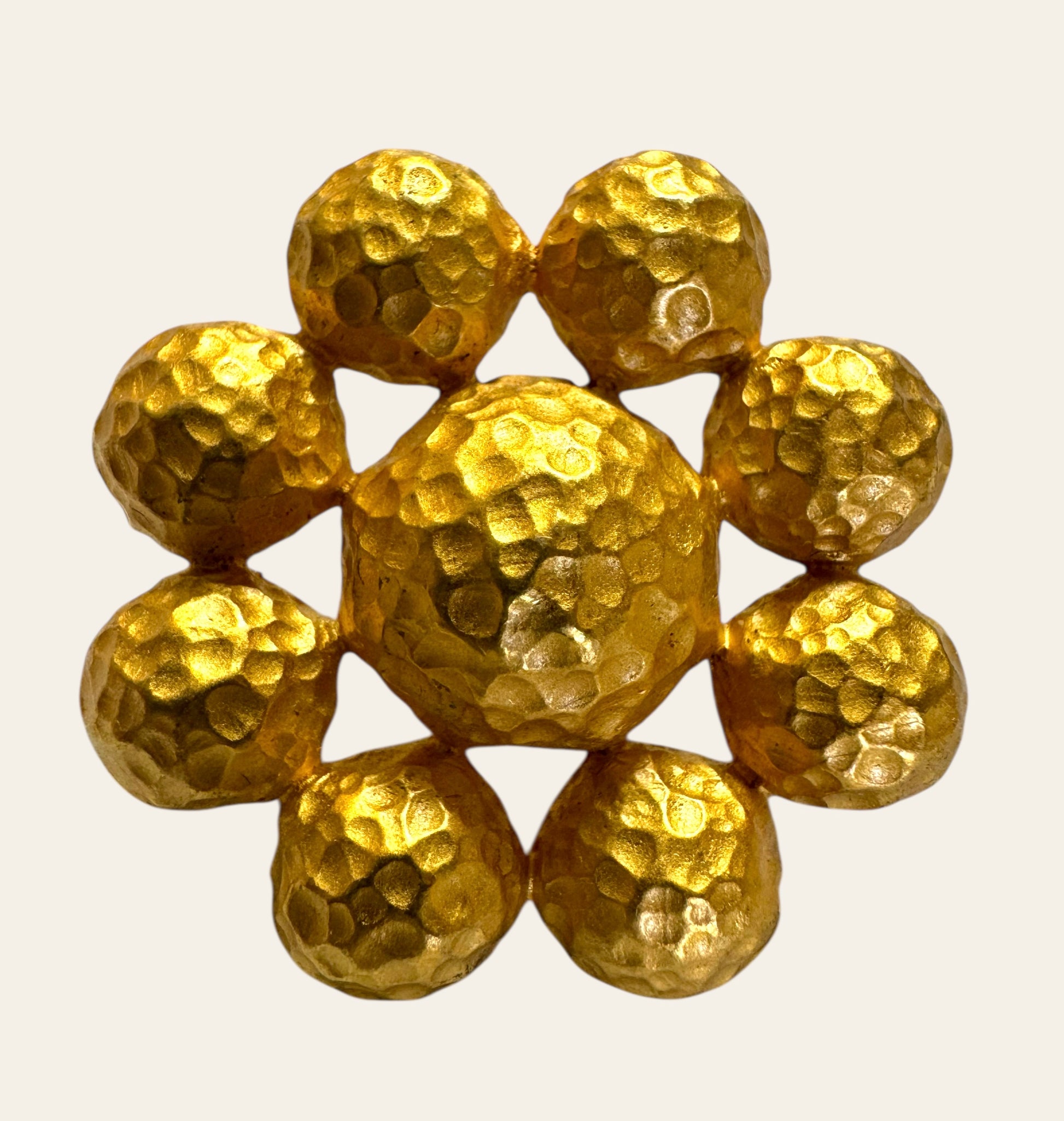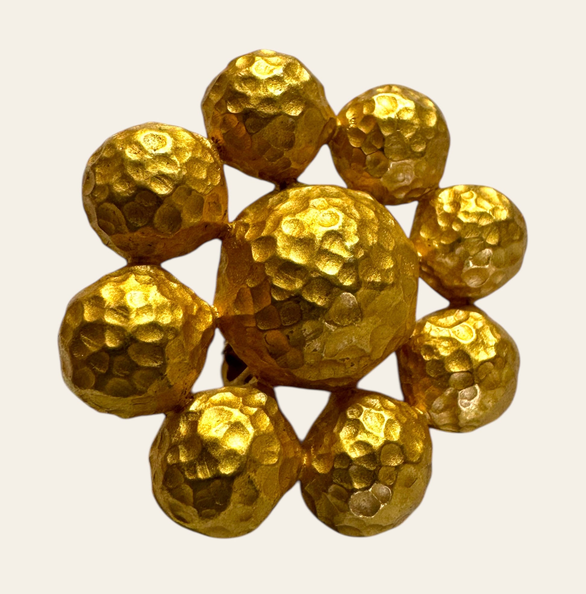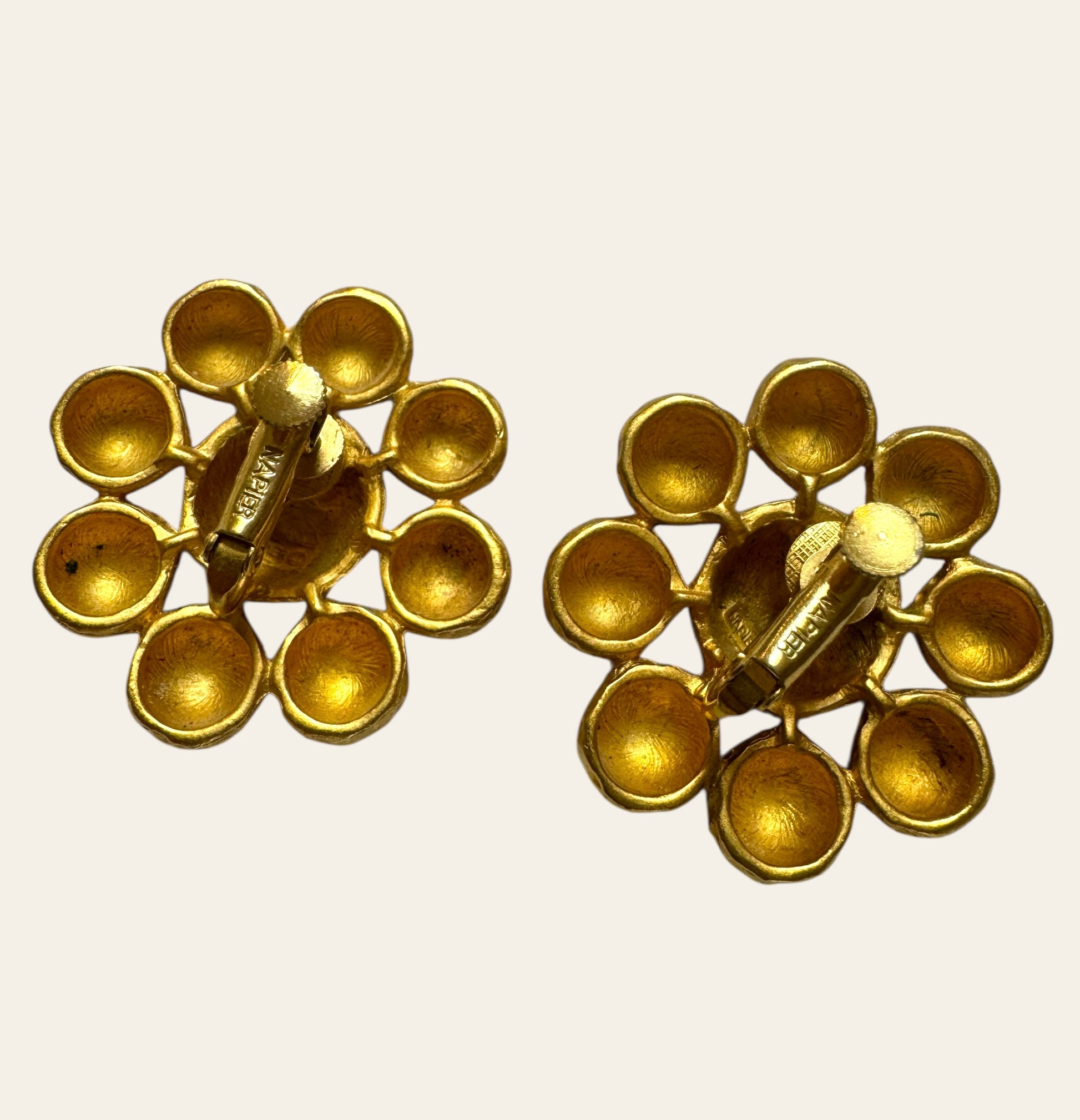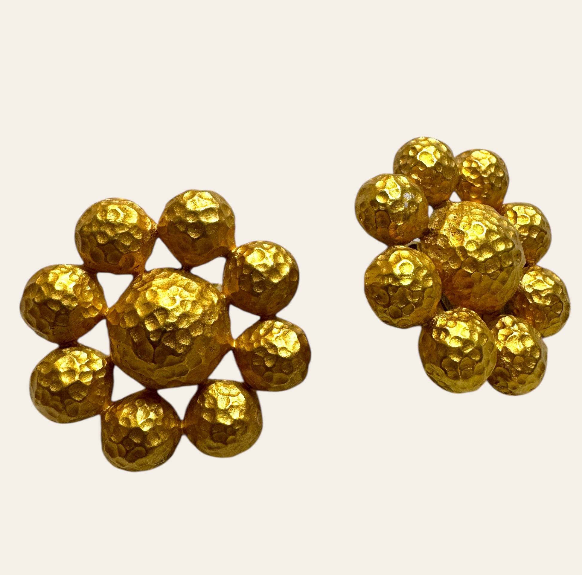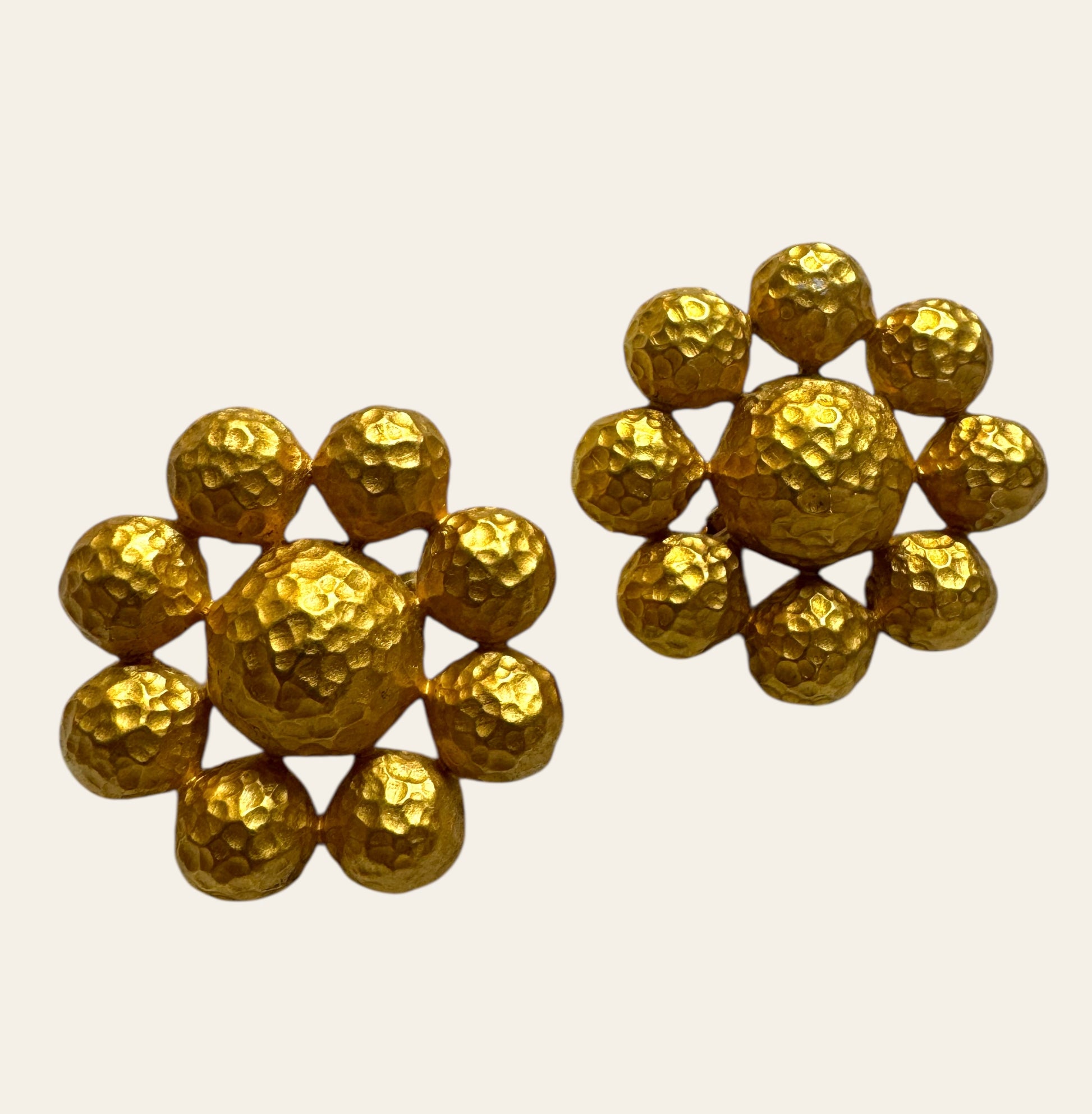 These earrings are bold and distinctive, featuring a hammered rich gold tone metal base in a symmetrical Etruscan design making them versatile statement pieces, evoking a mid-century modern or retro aesthetic. The design is structured around a central, dome-shaped element surrounded by a radiating arrangement or smaller domes, creating a floral starburst effect. The hammered finish adds so much dimension and character to the metallic surface.