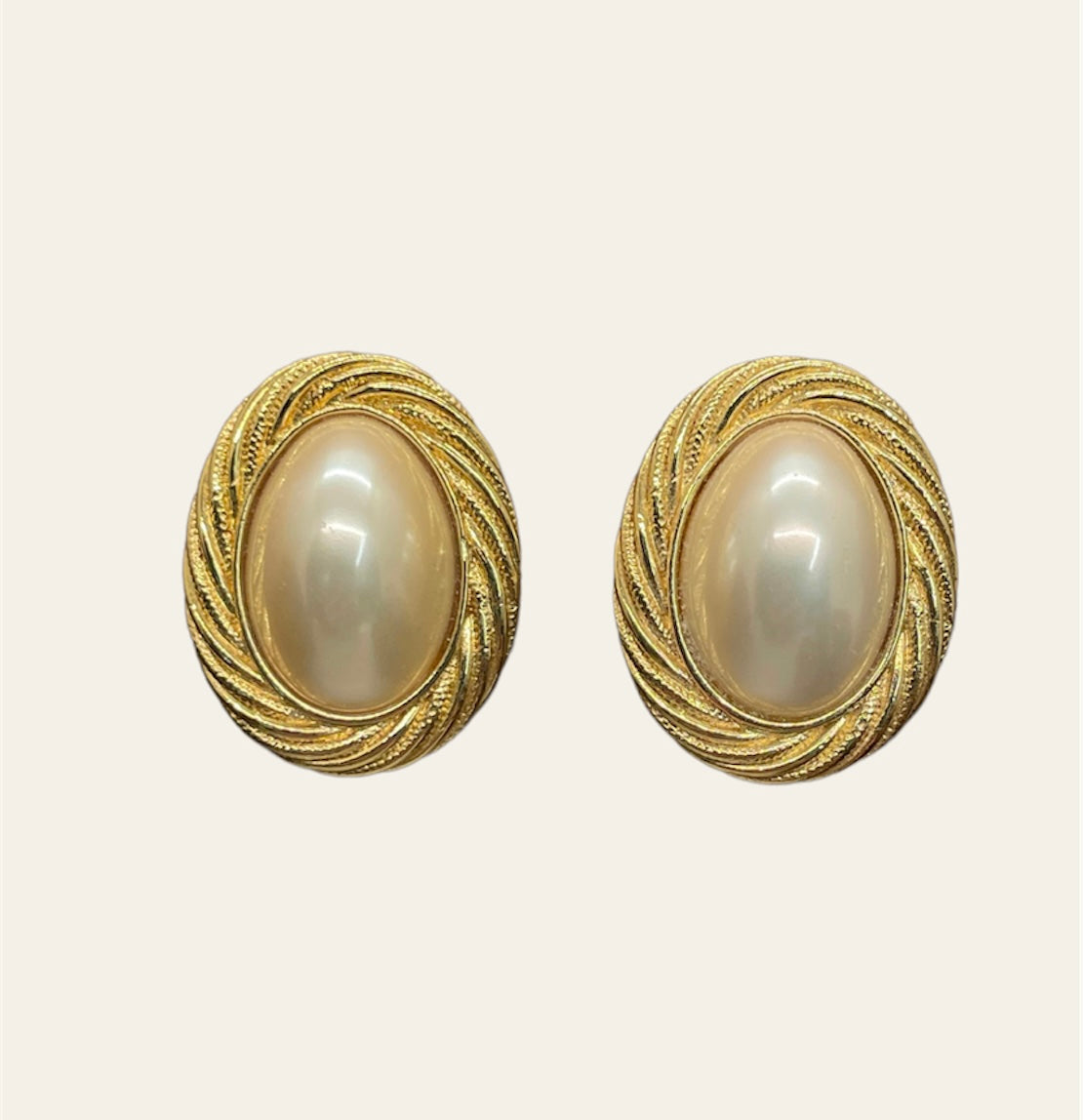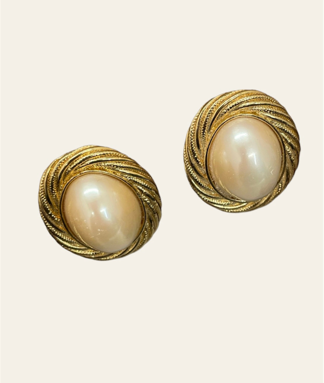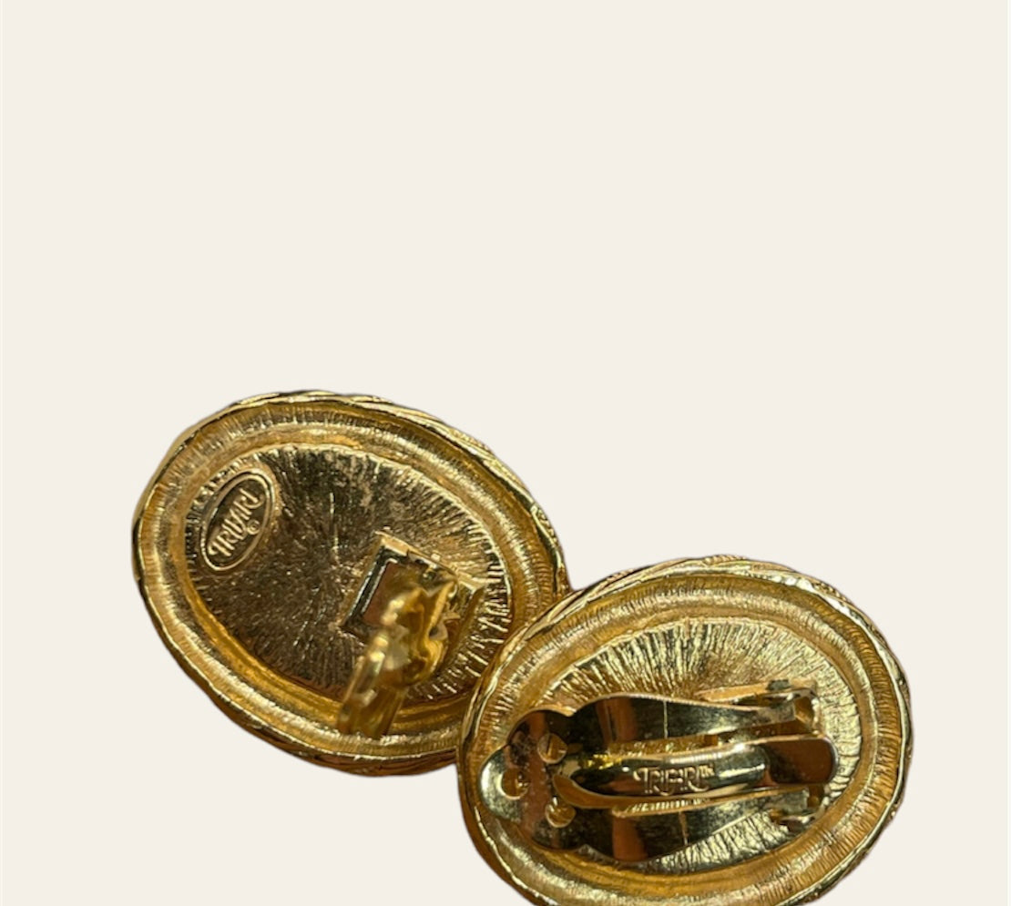 Vintage signed Trifari faux pearl with gold tone bezel.
