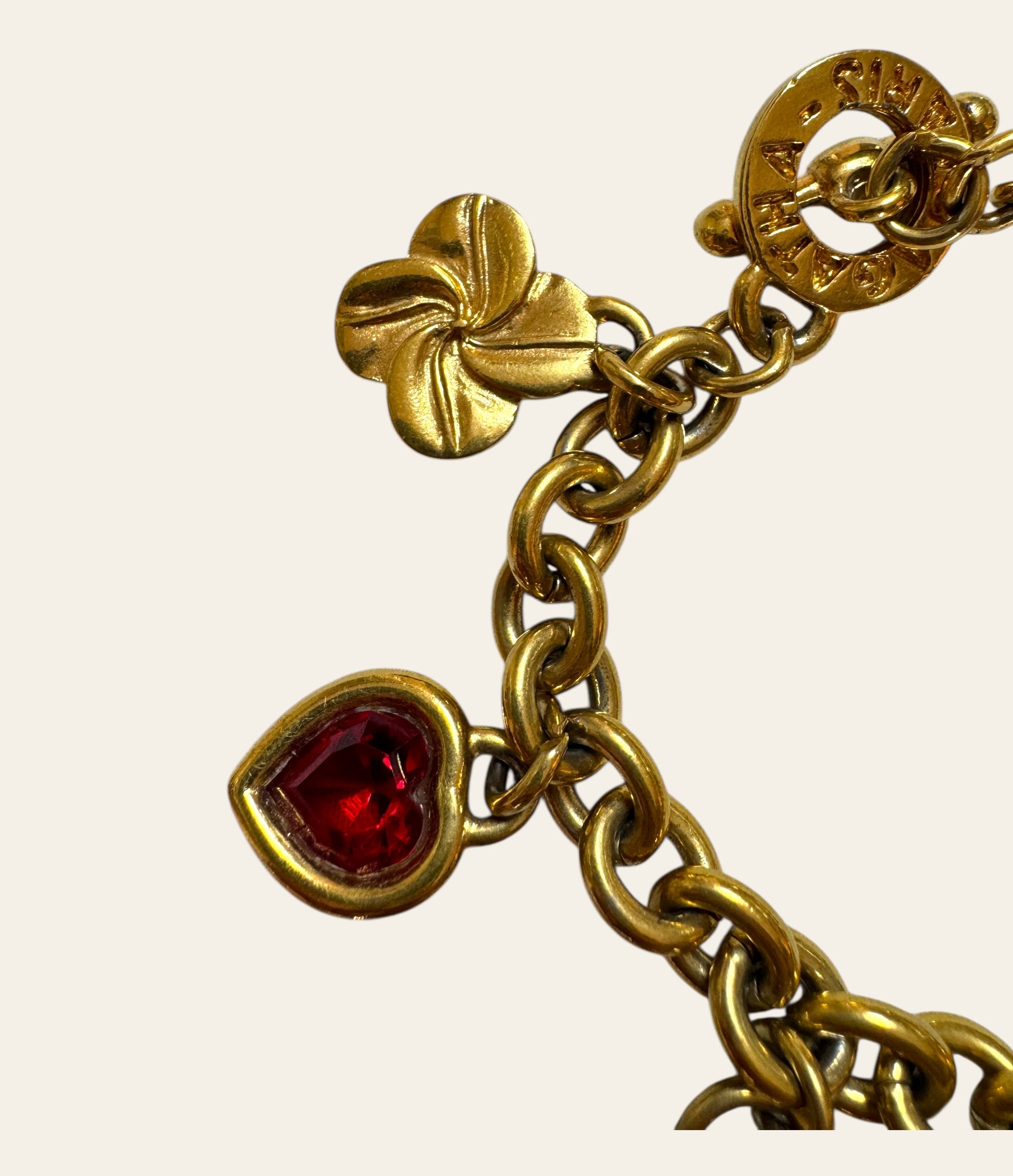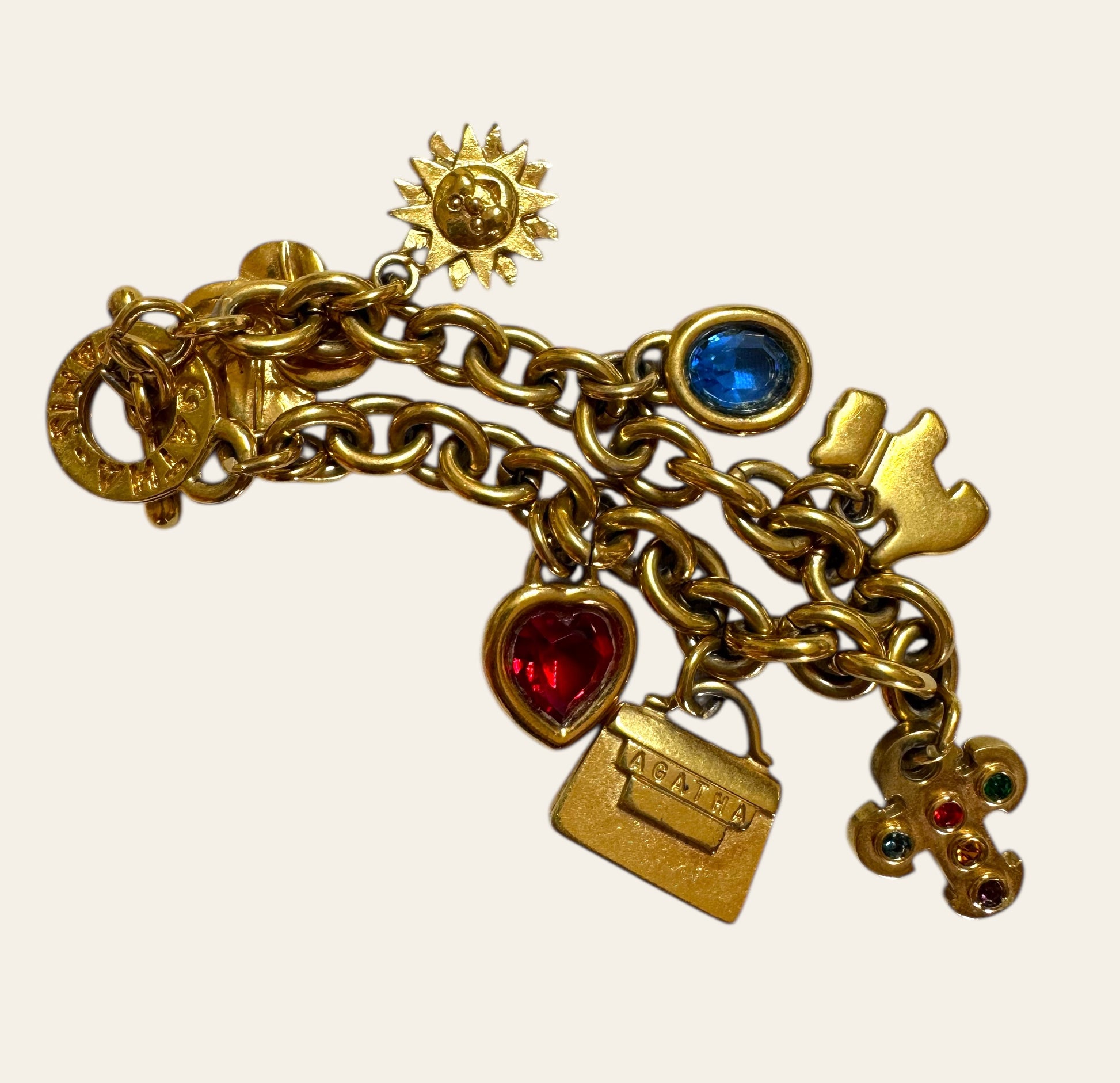 A radiant vintage Agatha Paris charm bracelet from the 1980s, crafted in signature matte gold-tone metal. It features an enchanting array of charms — a four-leaf clover, sunburst, ruby-red heart, sapphire-blue crystal, Scottie dog, gem-set cross, and the iconic Agatha handbag — each symbolizing luck, love, and lighthearted French chic.