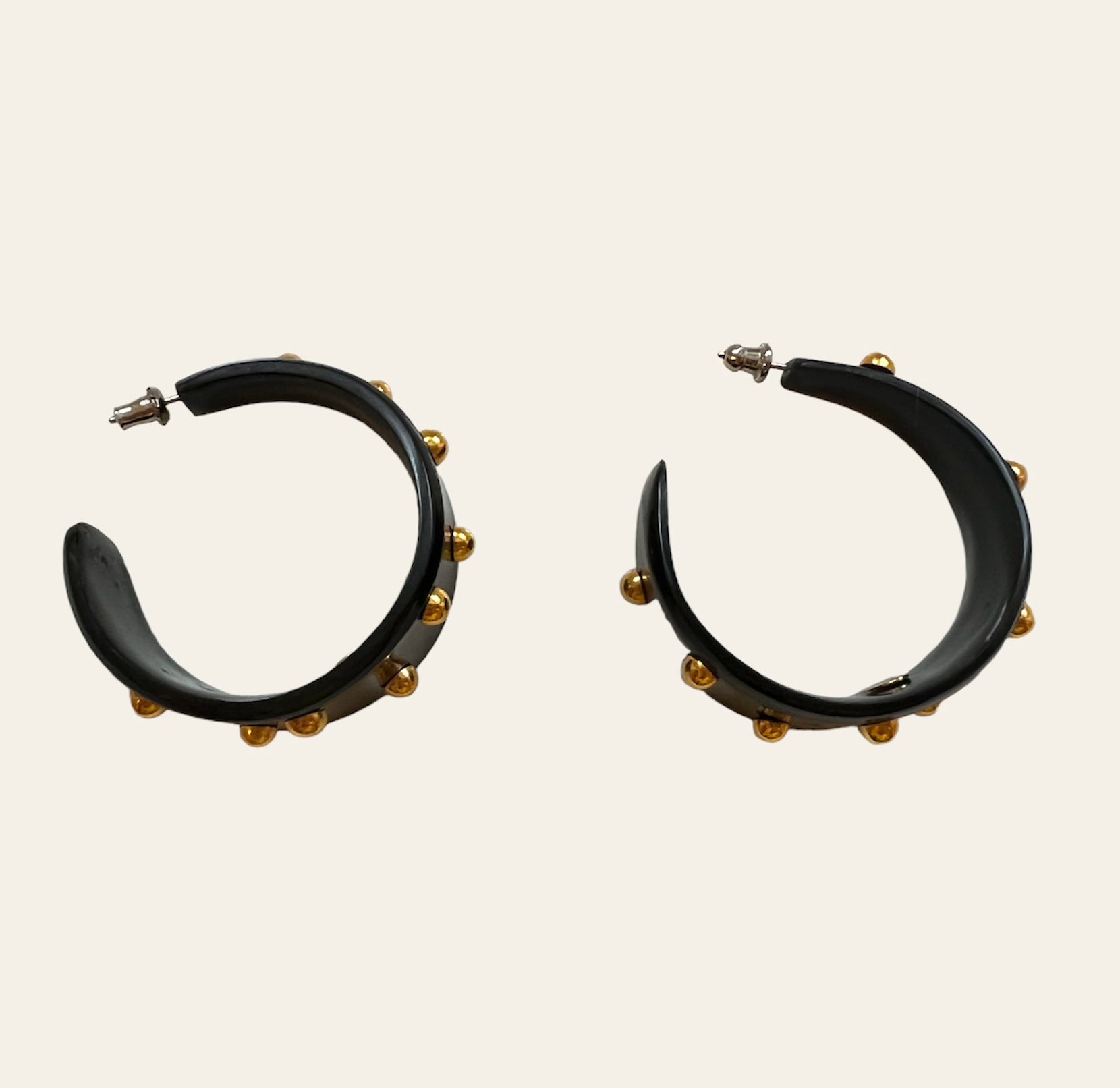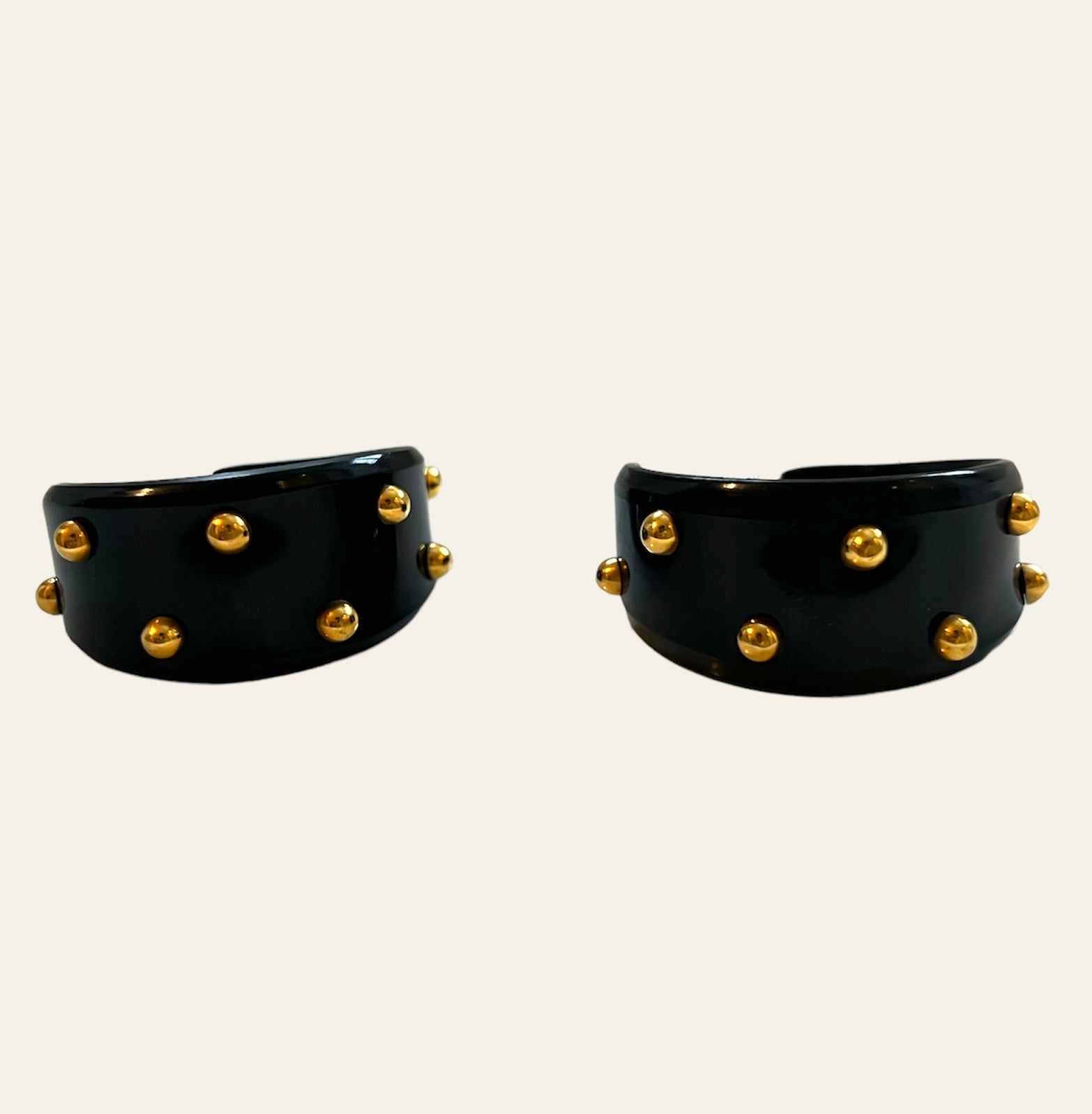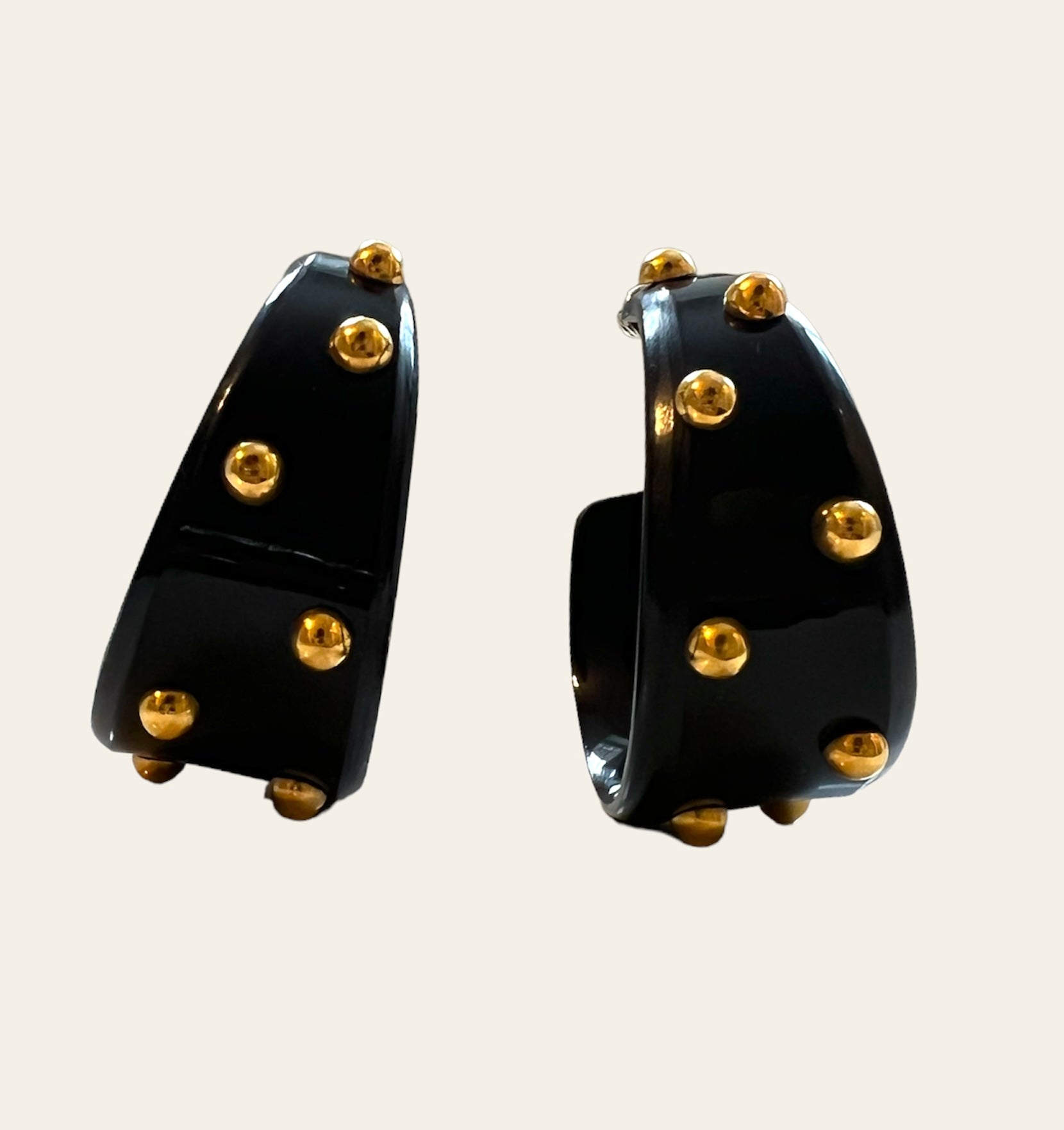 STUNNING Signed "Alexis Bitar" Black enamel thick chunky pierced earrings with gold polka dots.