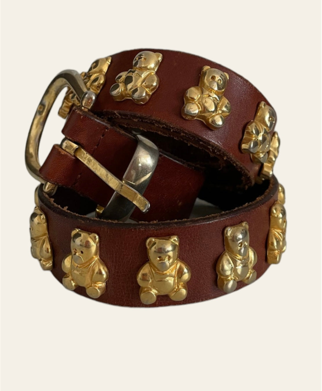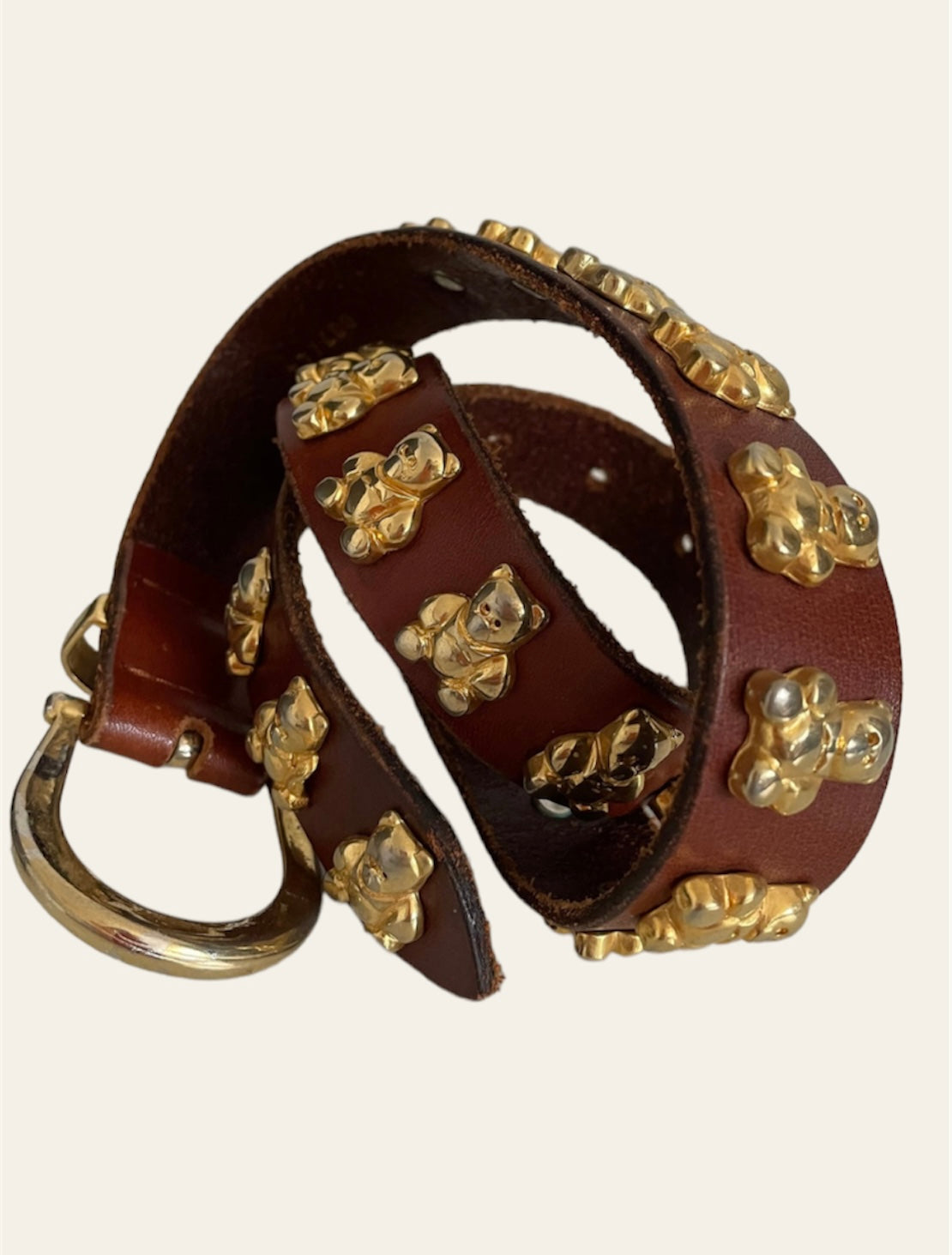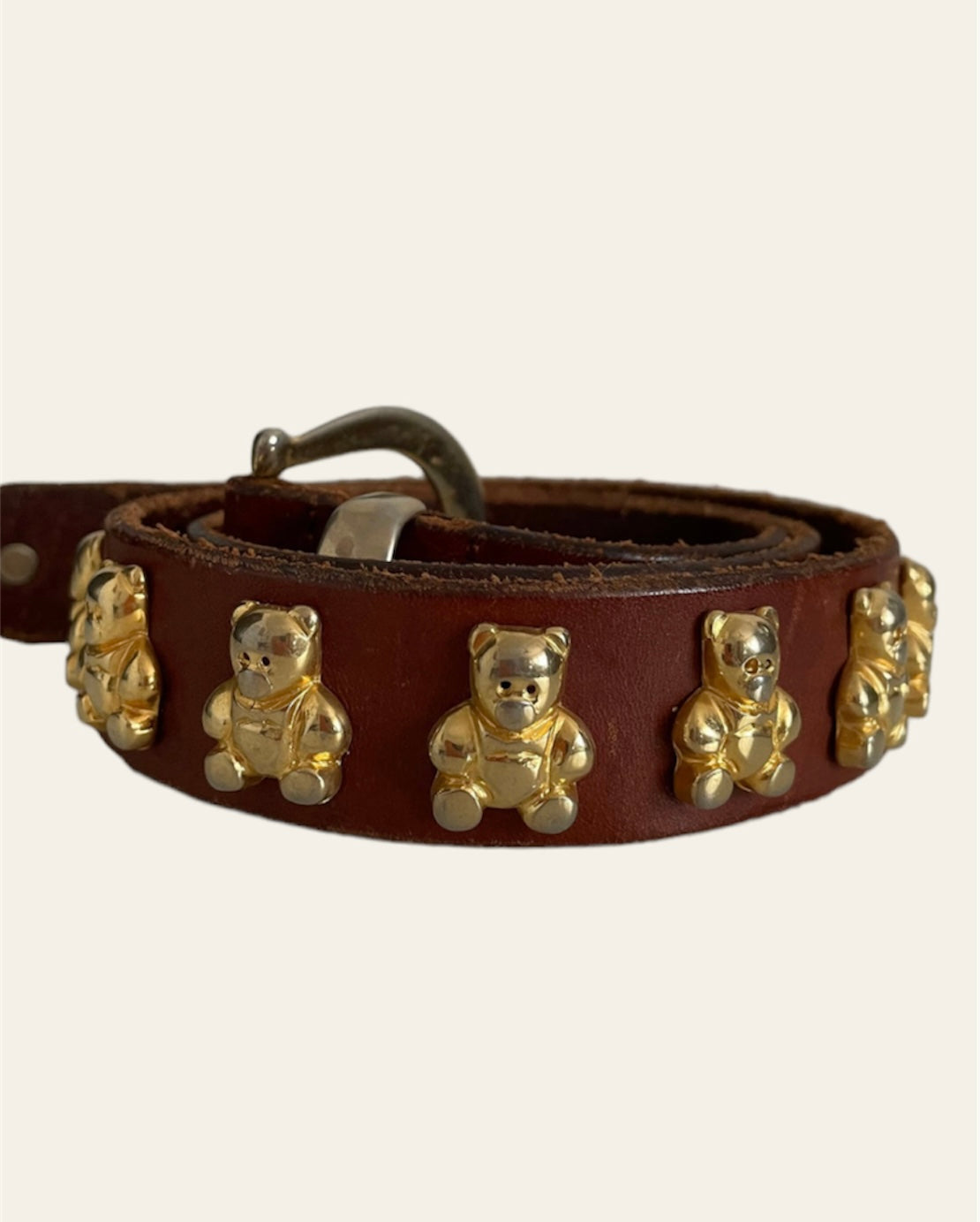 Unsigned Vintage Unique 100% leather belt with shiny gold tone bears.