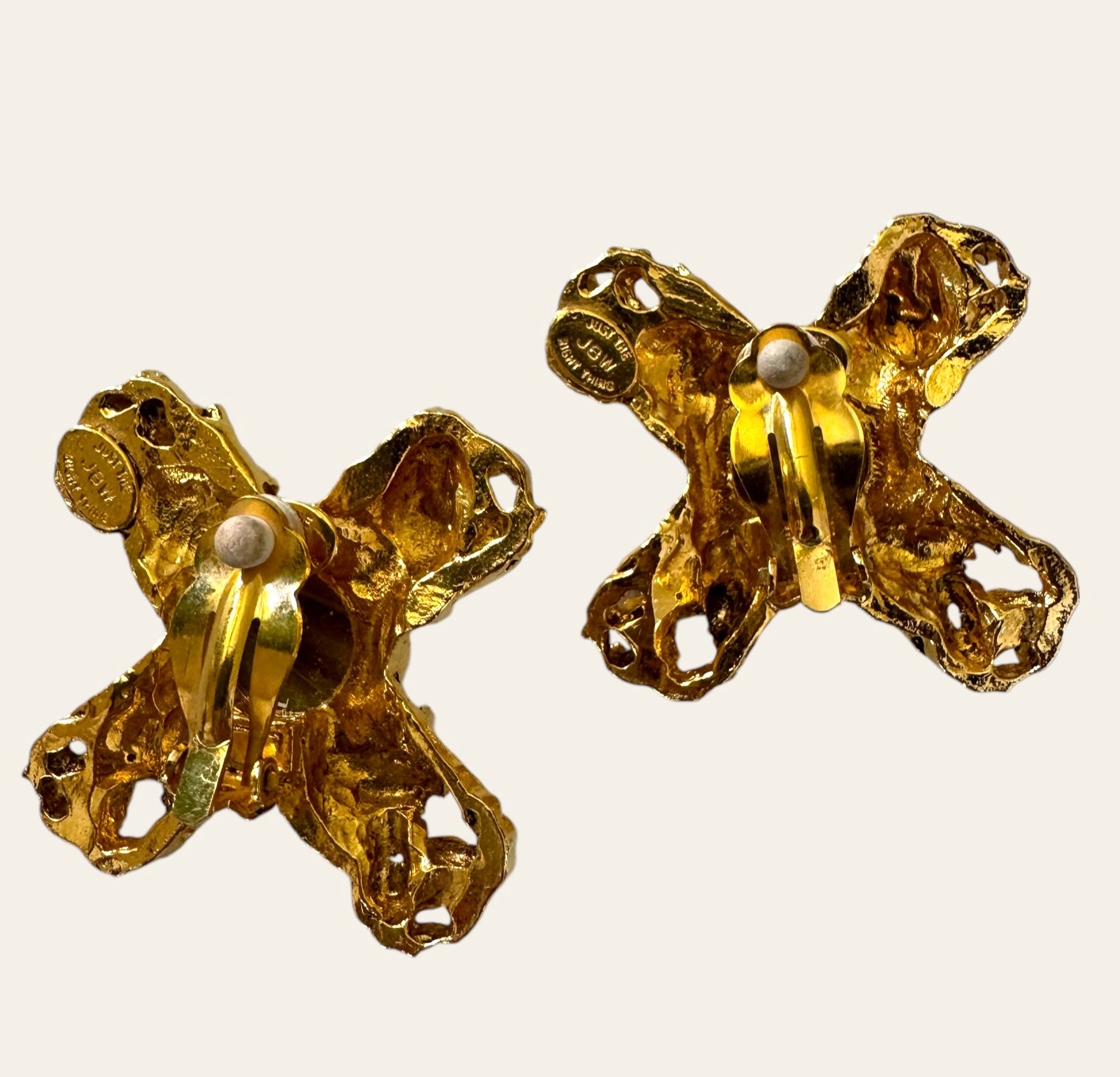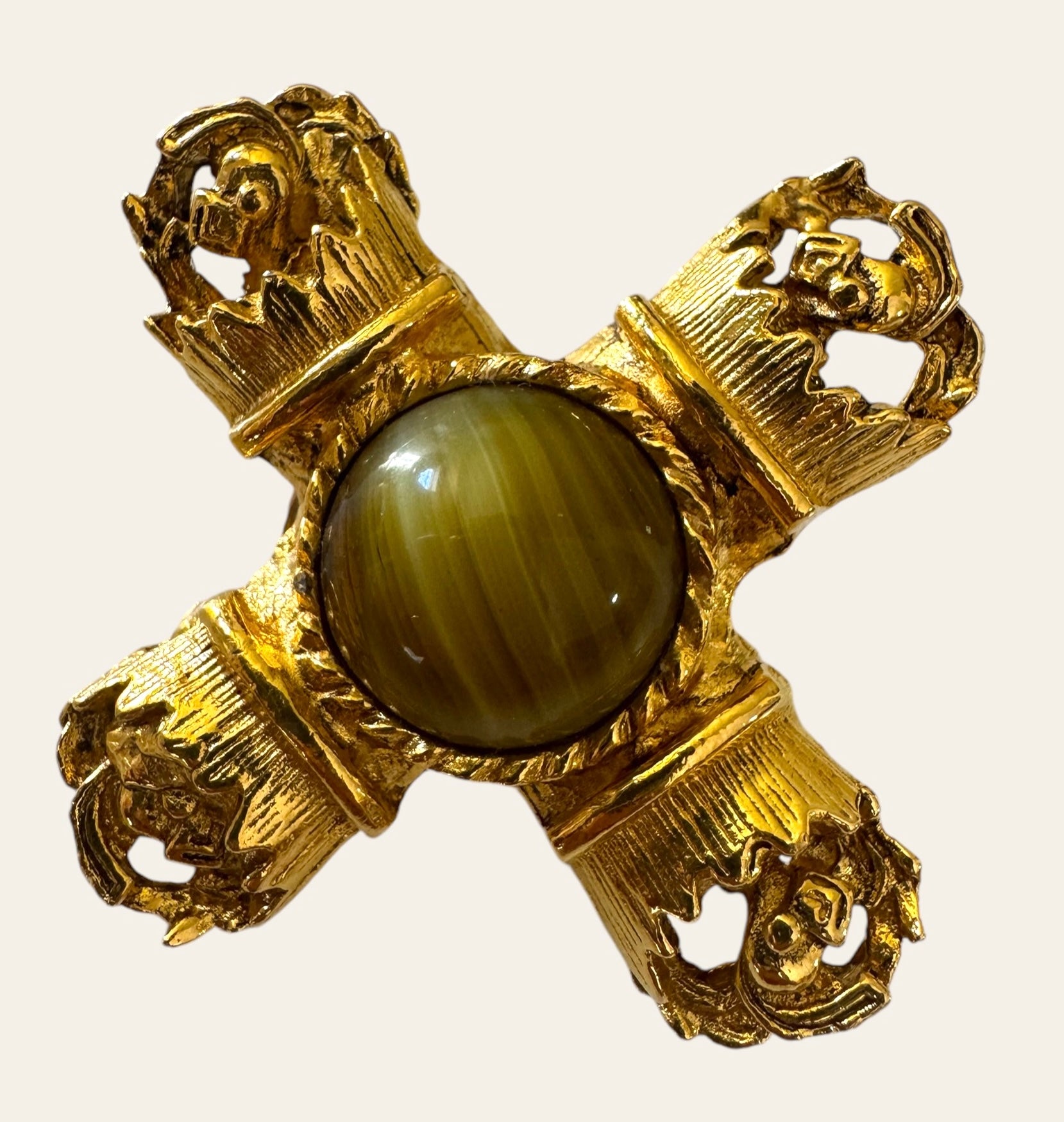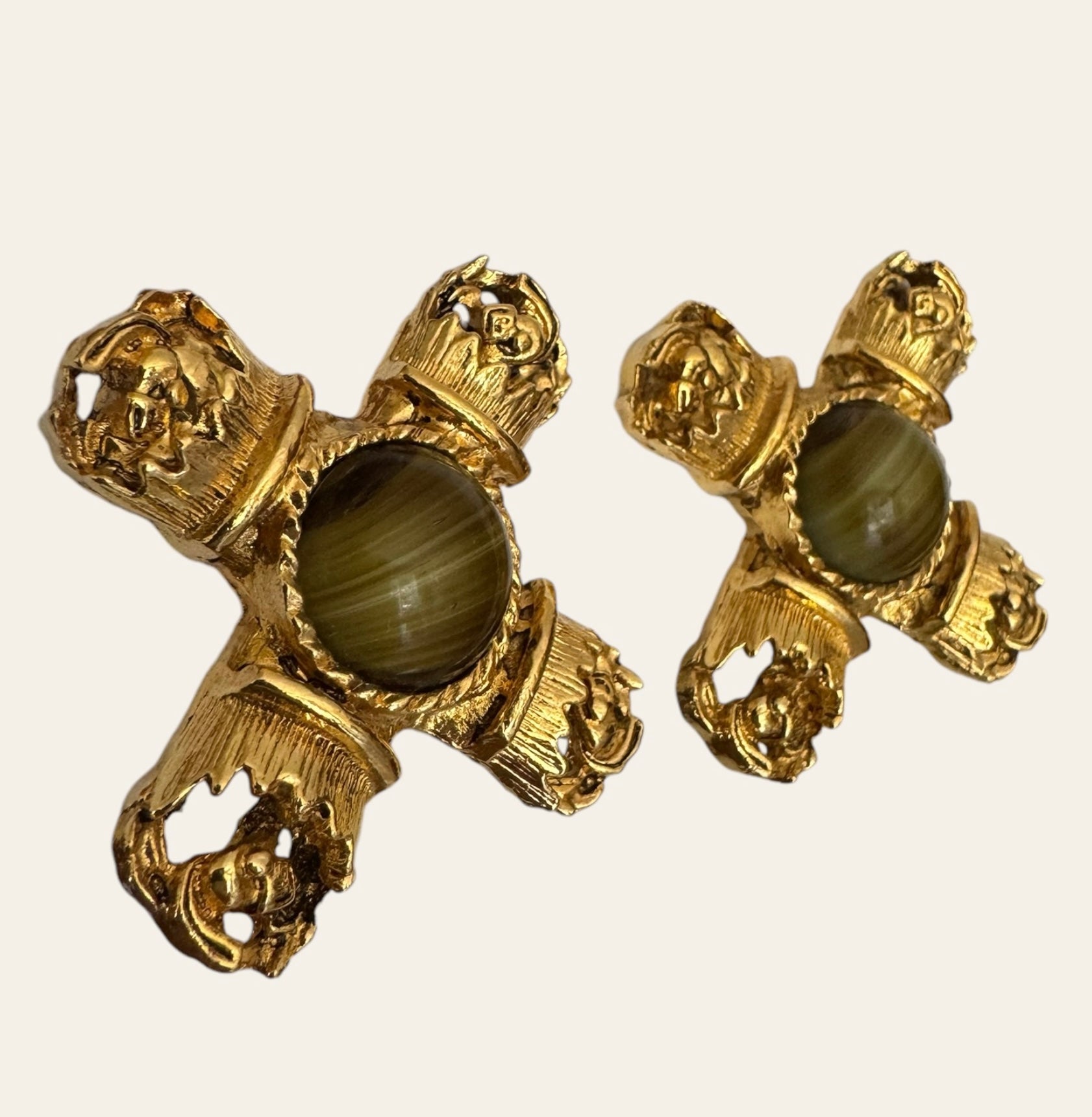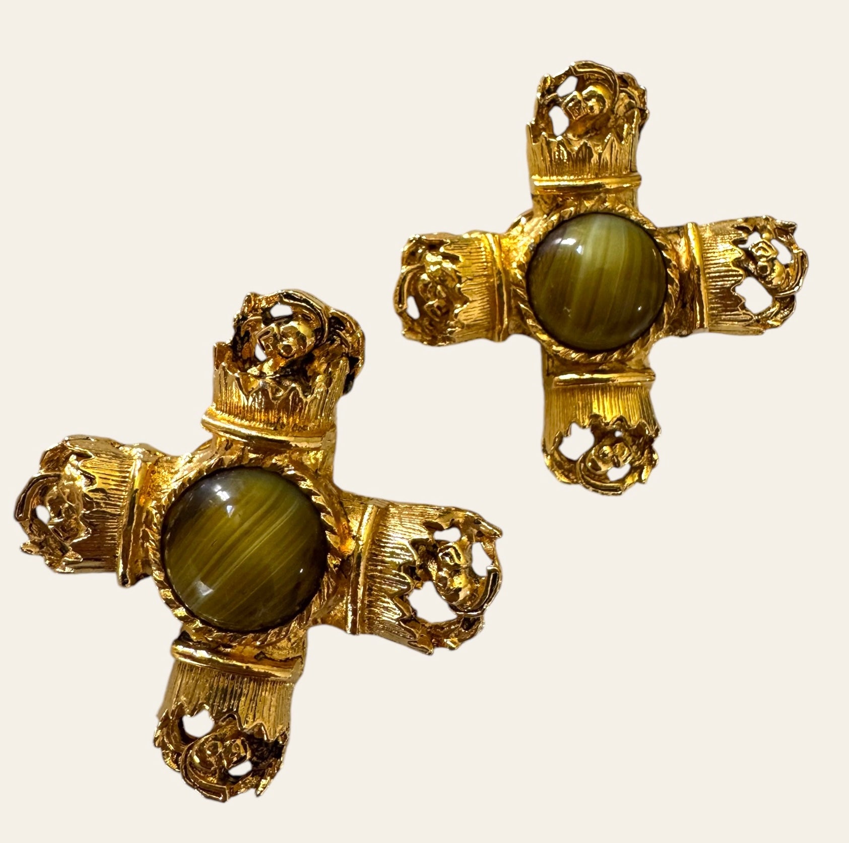 Massive gold tone Byzantine Revival X Cross clip ons with faux tiger's eye cabochons. Unique, rare, and one of a kind. They look so expensive and the craftsmanship is so expensive and refined. A Romy's fav!