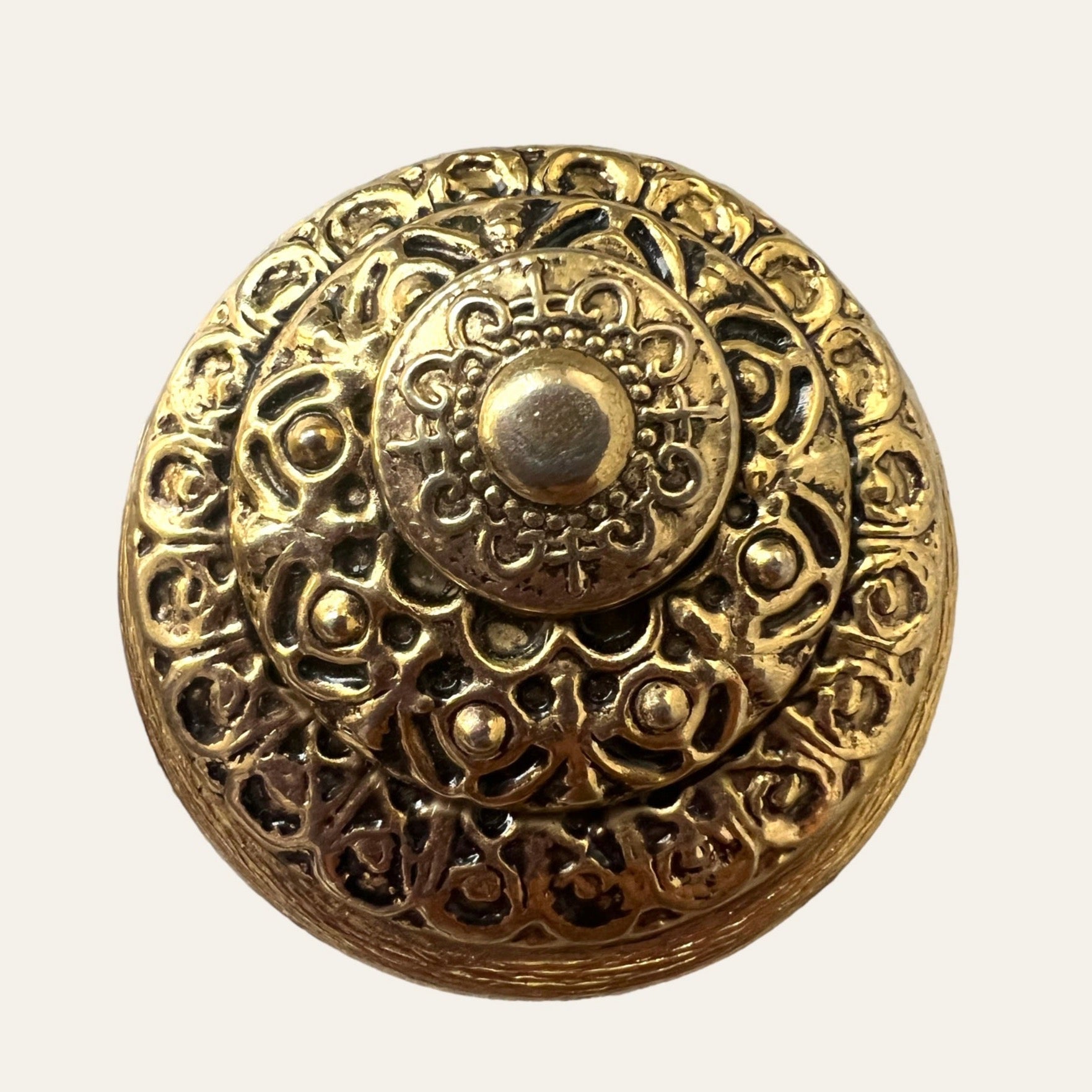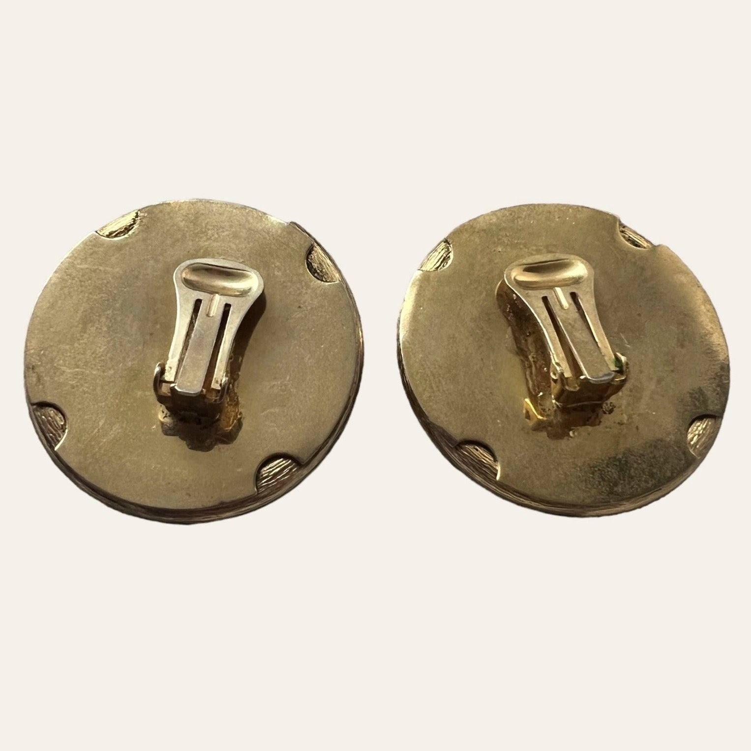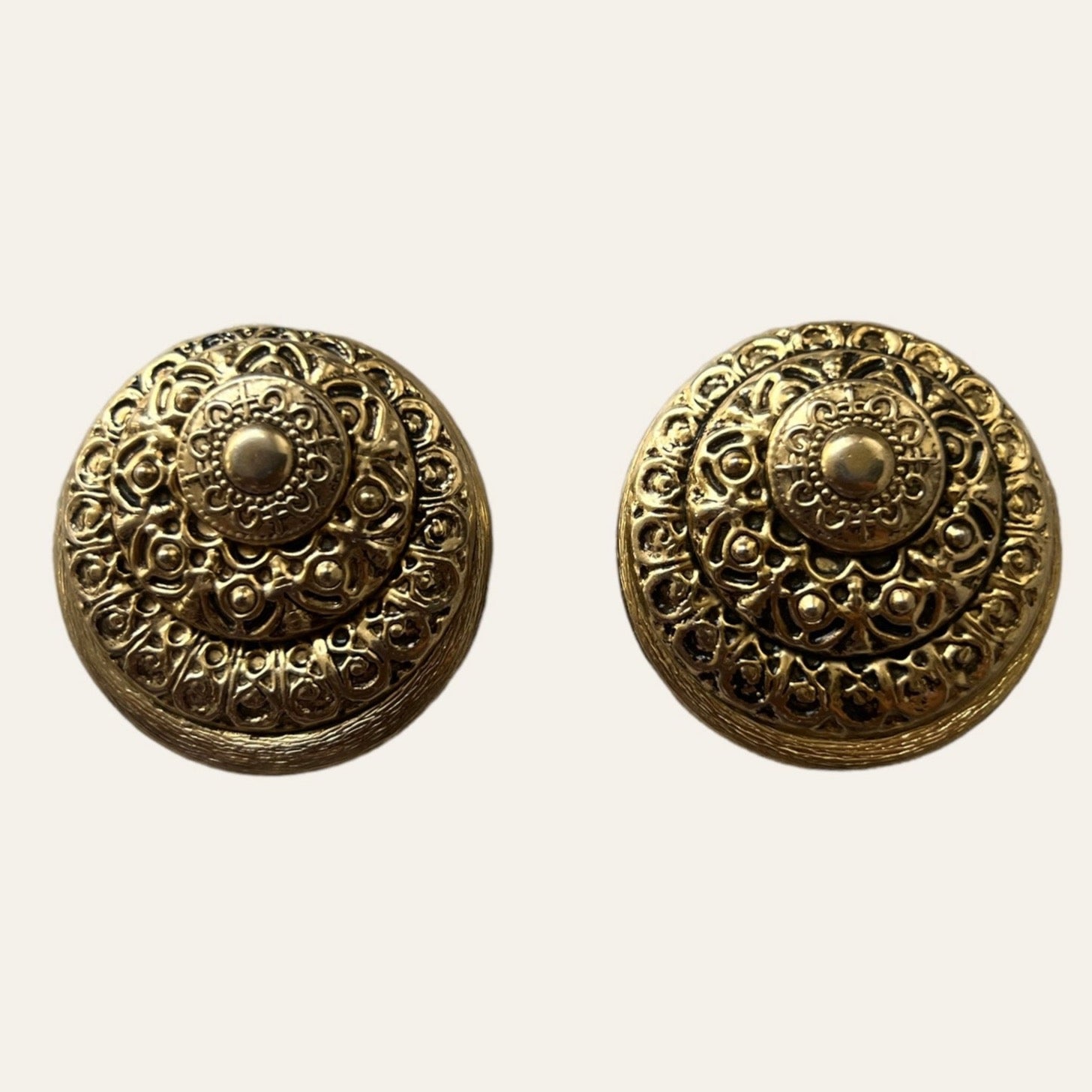 1980's large round champagne gold tone button style clip on earrings featuring intricate embossed baroque design all over.