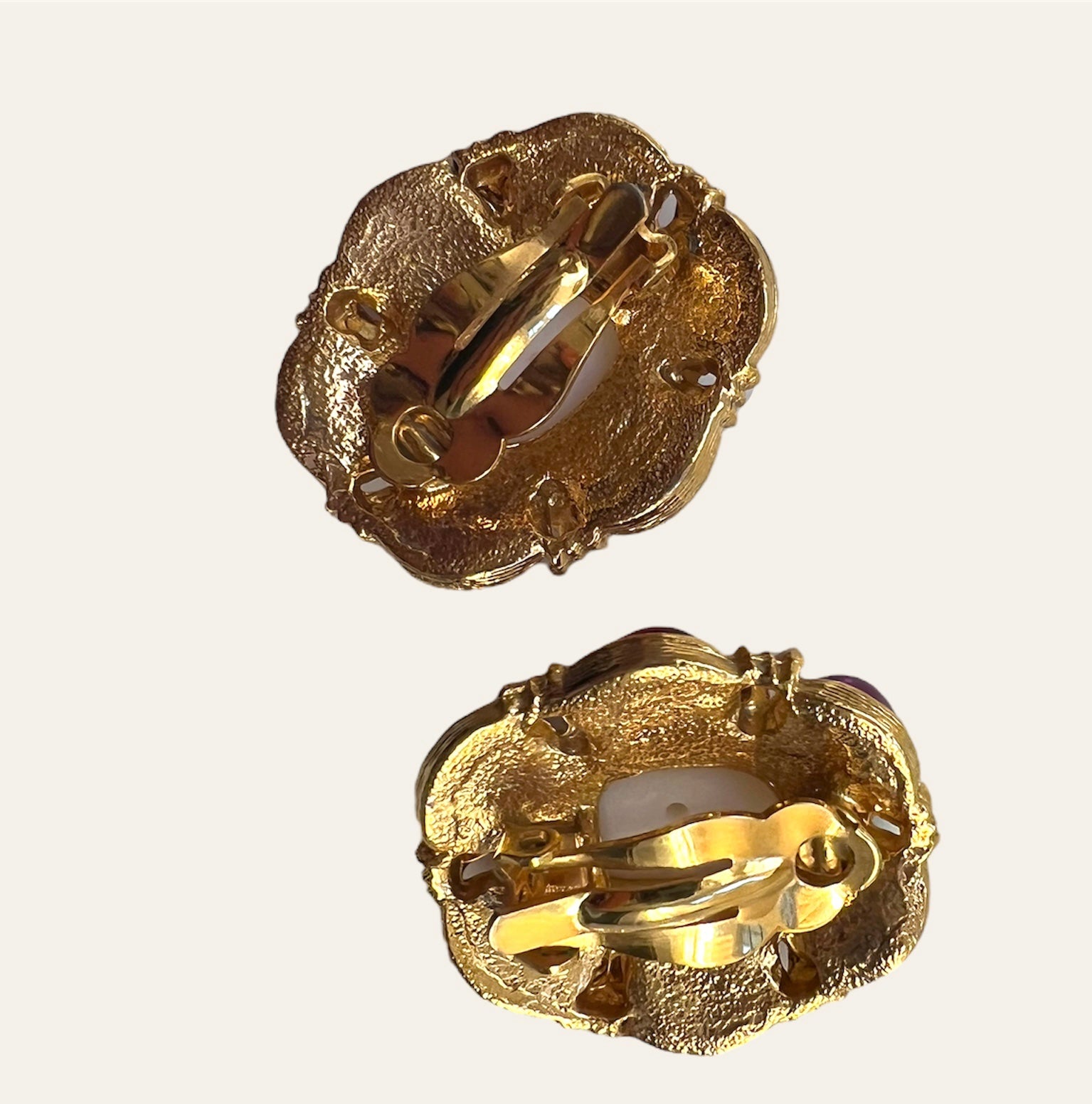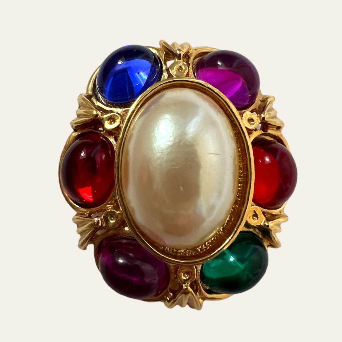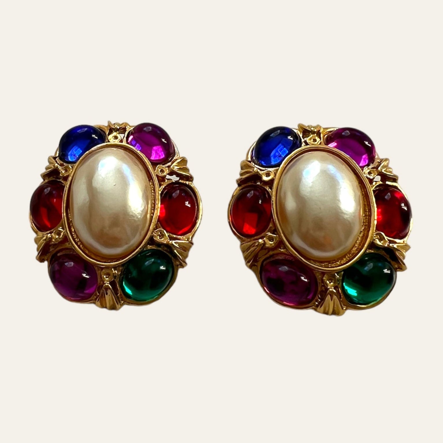 Fresh clip on earrings in a shiny gold and two faux pearls and red, green, blue and purple lucite beads. So pretty!