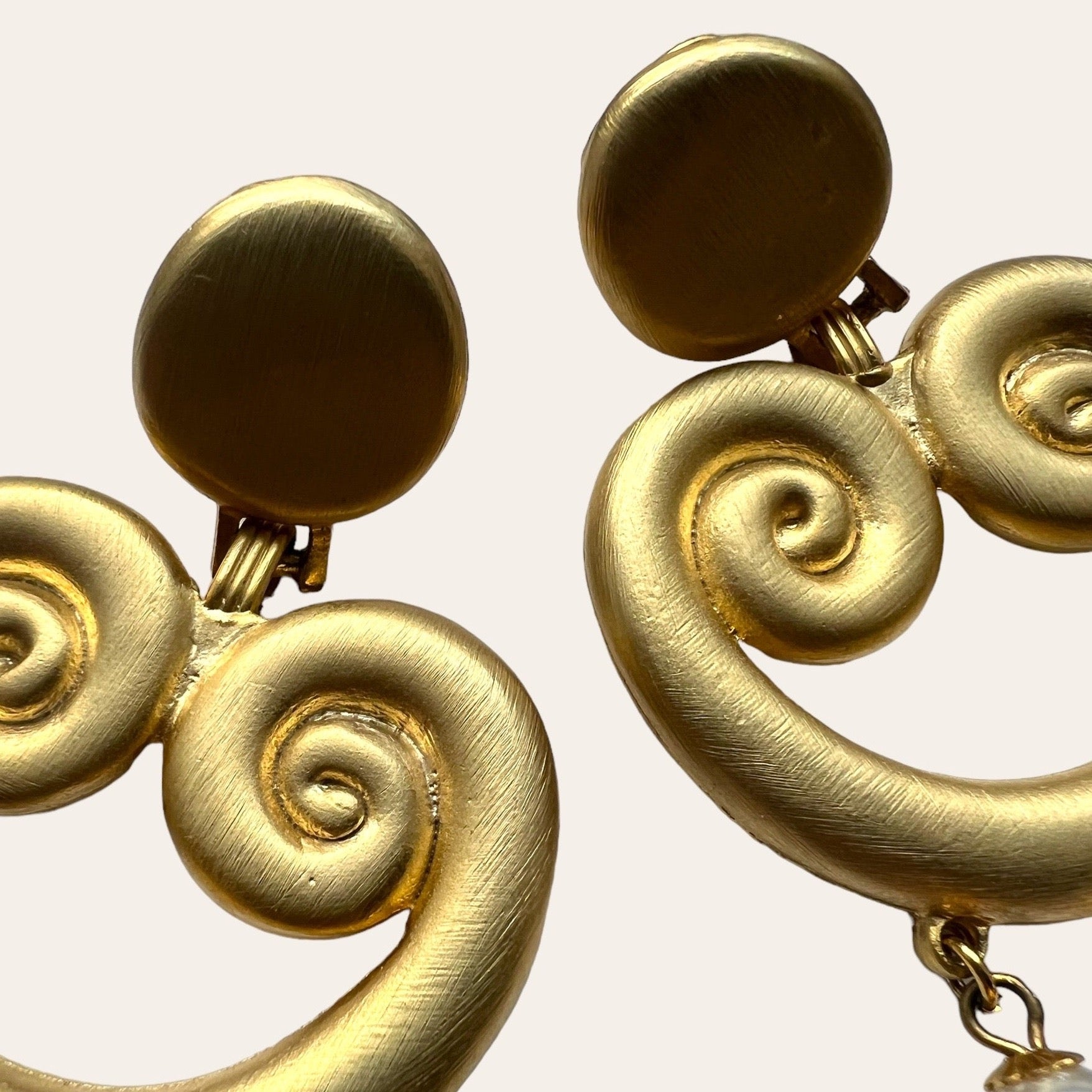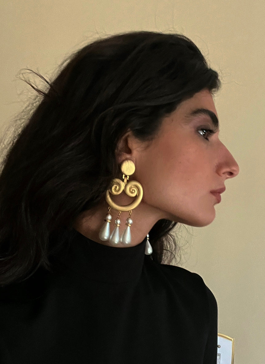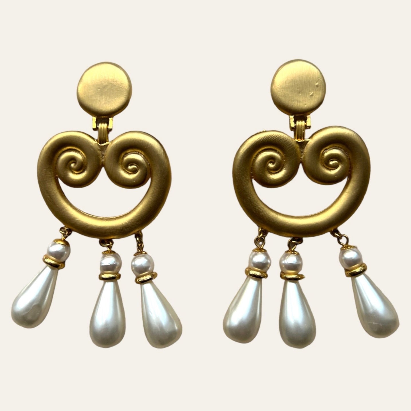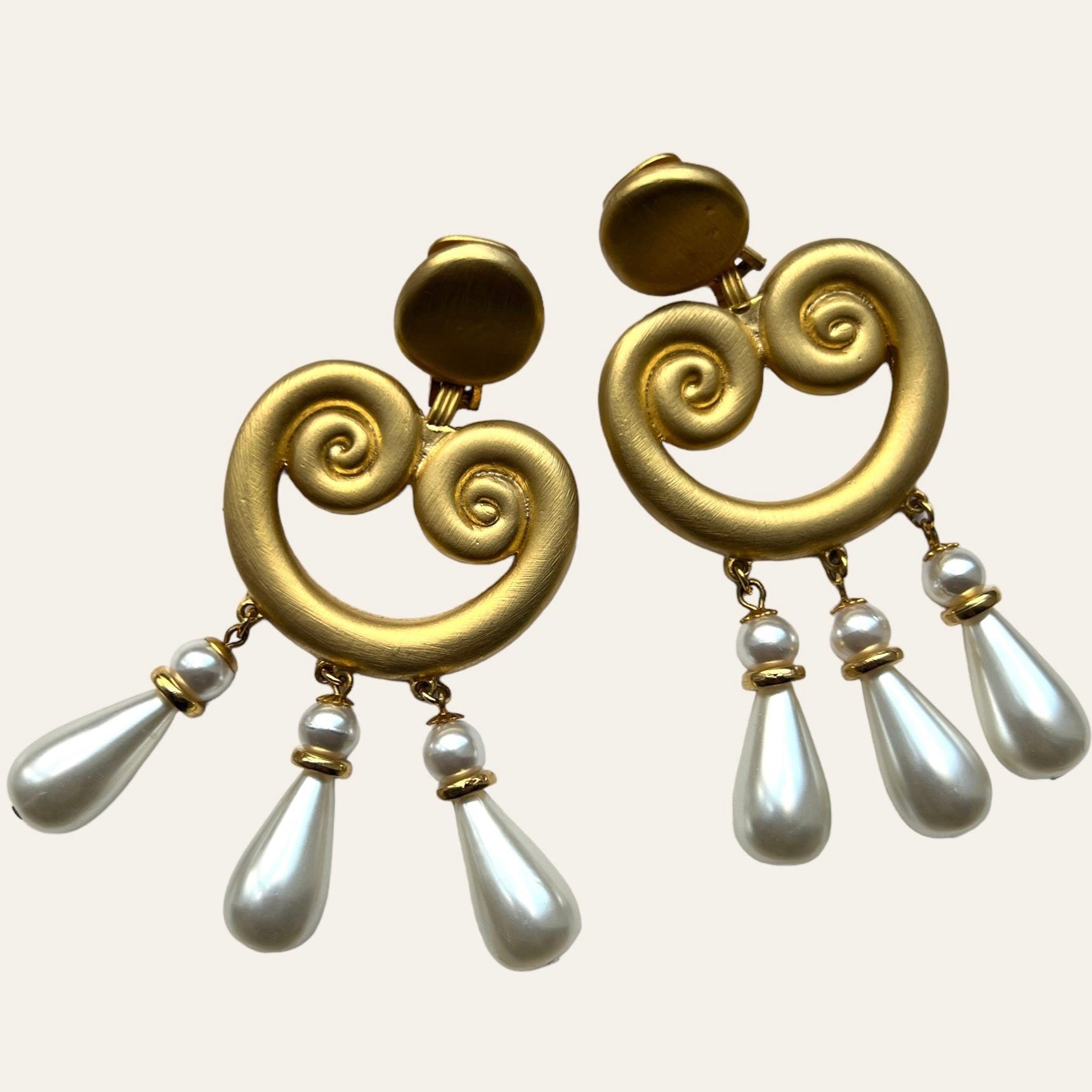 Most fashionable, unique, runway worthy XXL statement clip on earrings featuring a brushed matte gold tone double spirals with faux pearls dangles. A Romy's favourite! The clips are secure and they are so light on the ears despite their size.