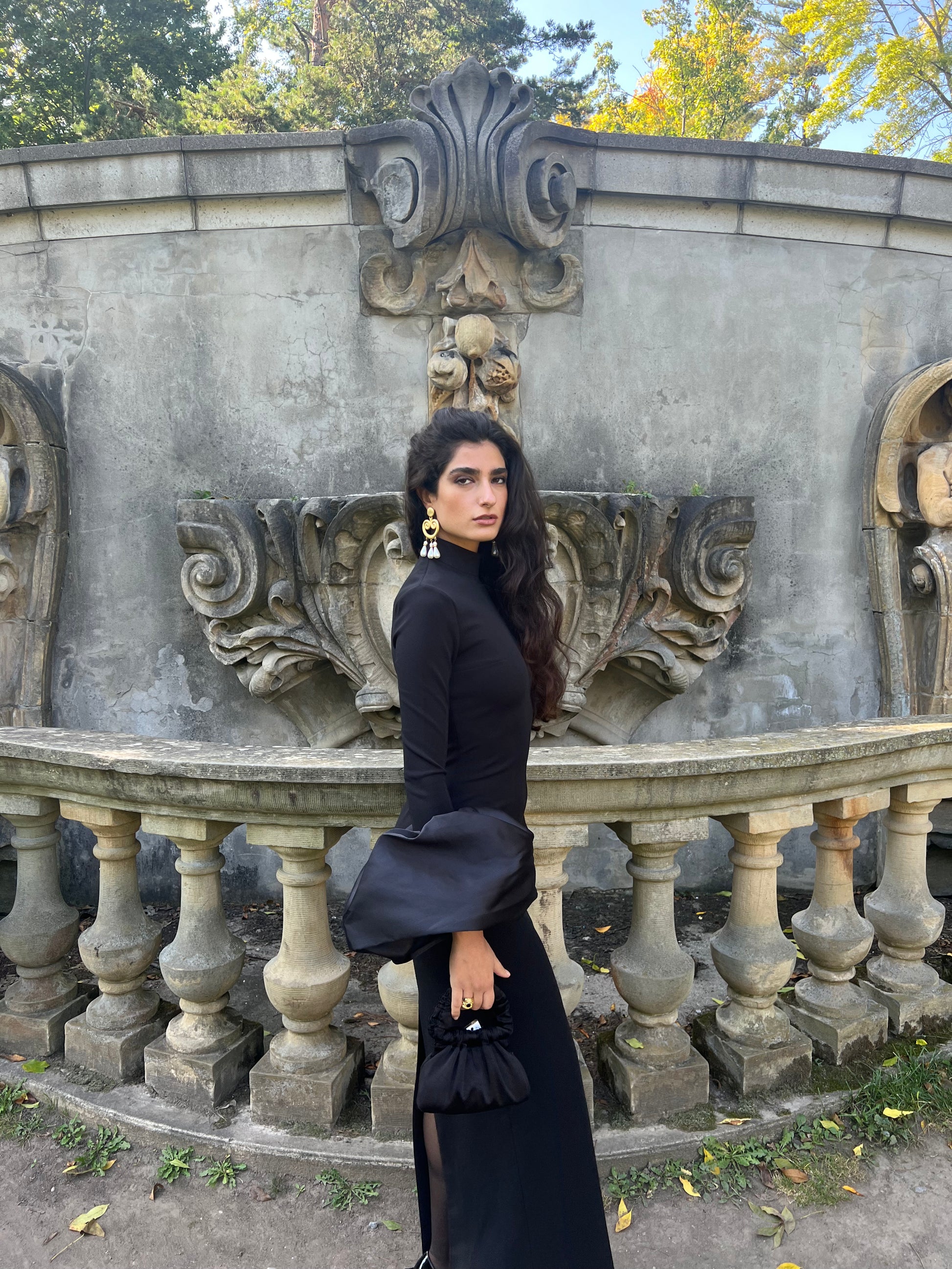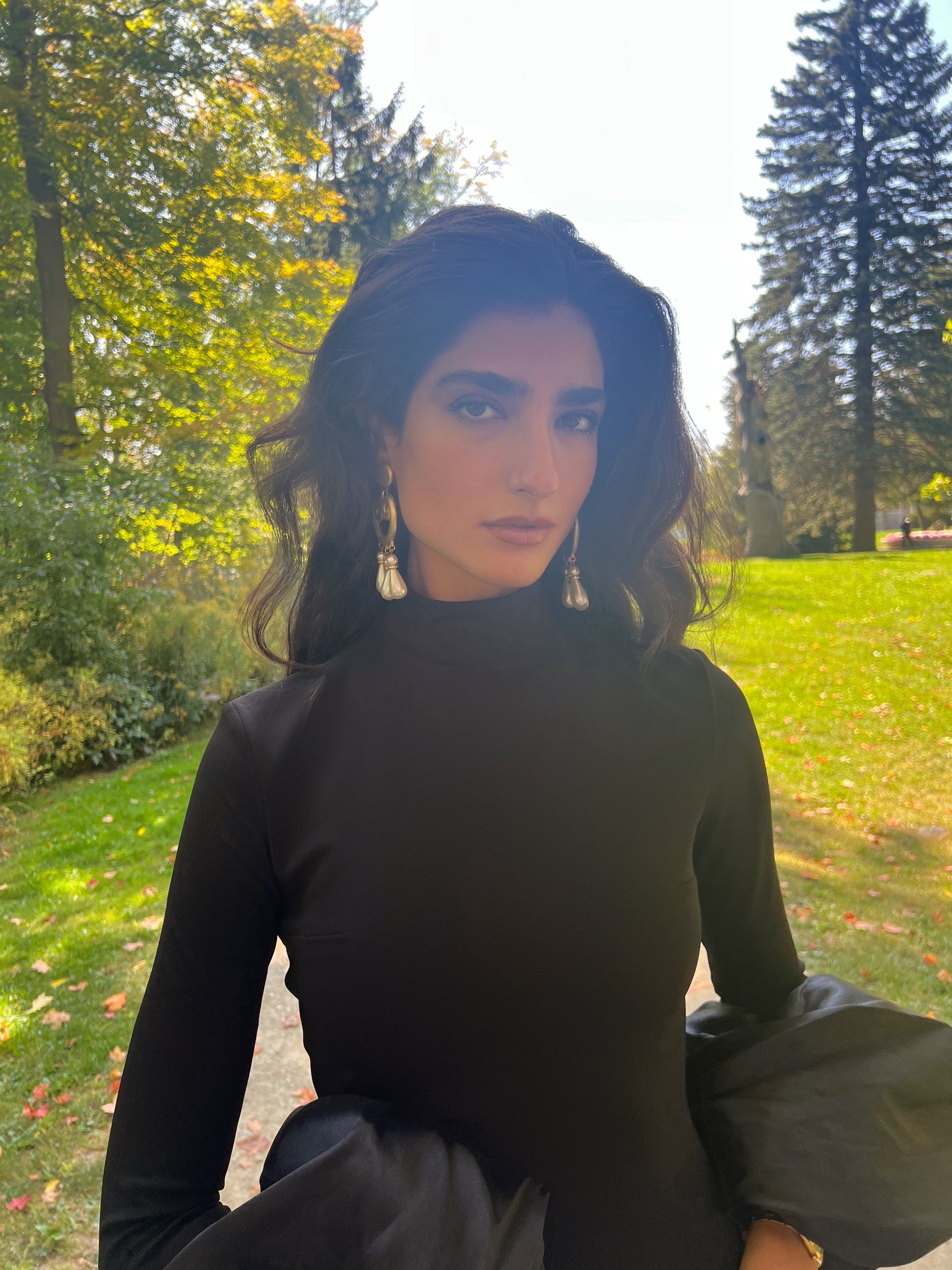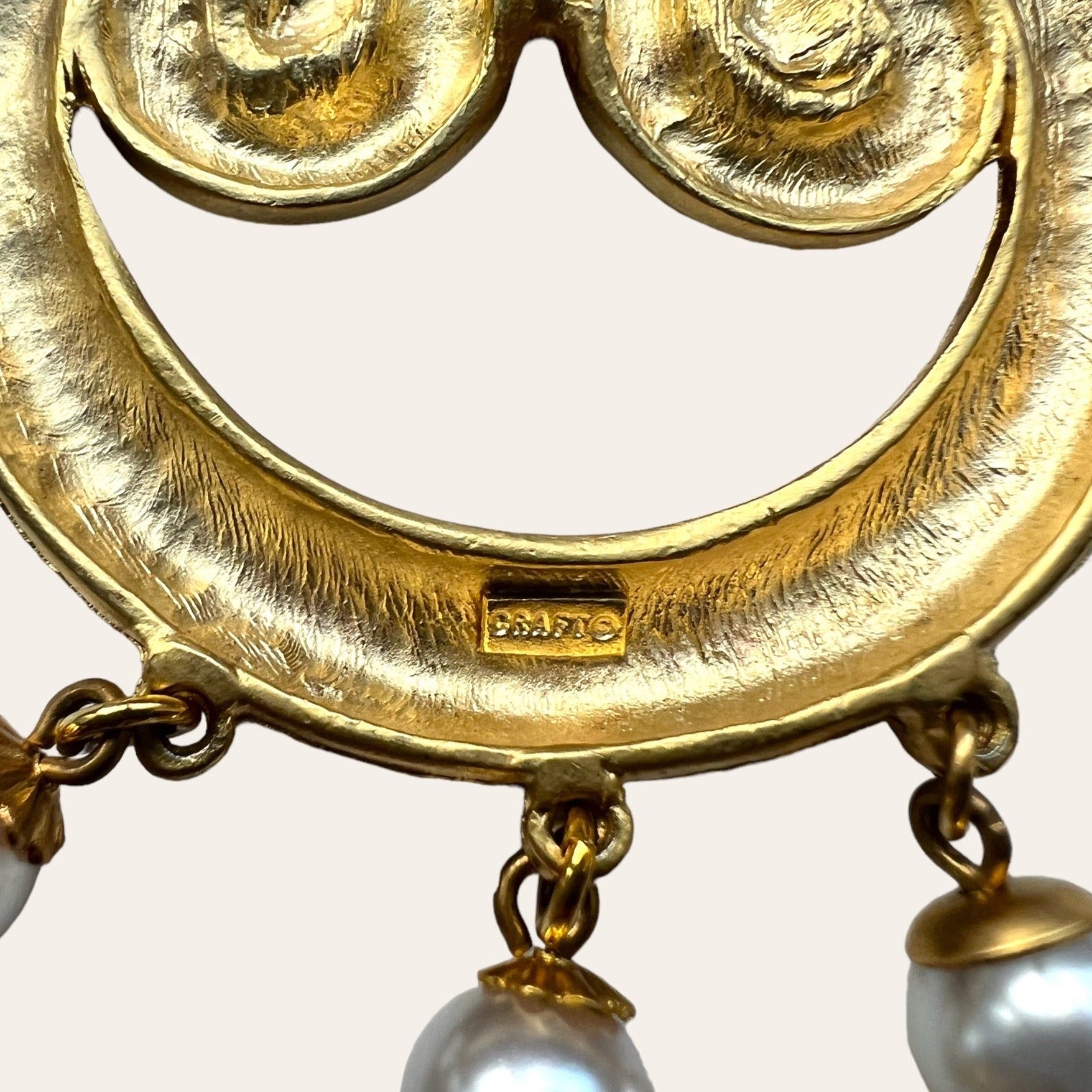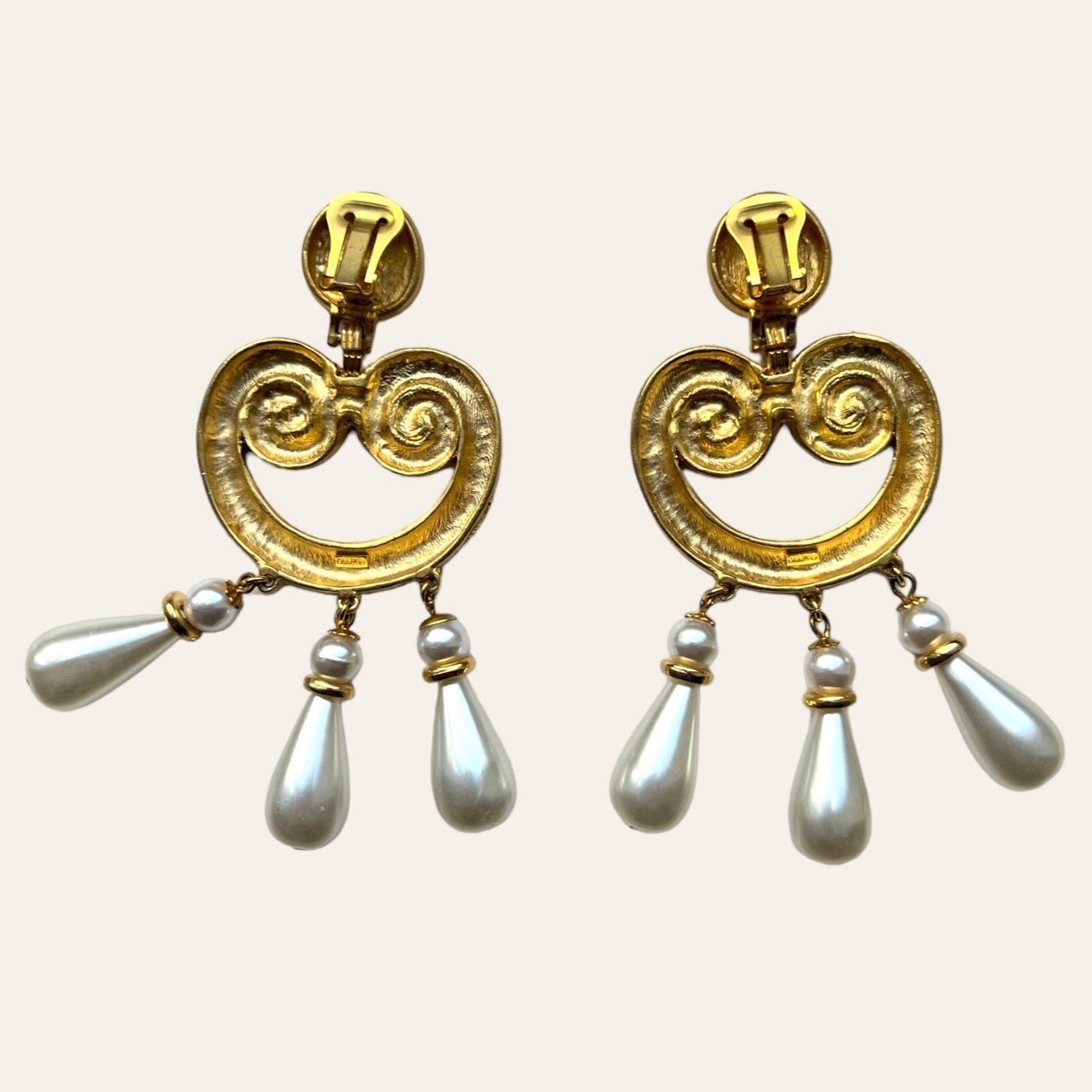 Most fashionable, unique, runway worthy XXL statement clip on earrings featuring a brushed matte gold tone double spirals with faux pearls dangles. A Romy's favourite! The clips are secure and they are so light on the ears despite their size.