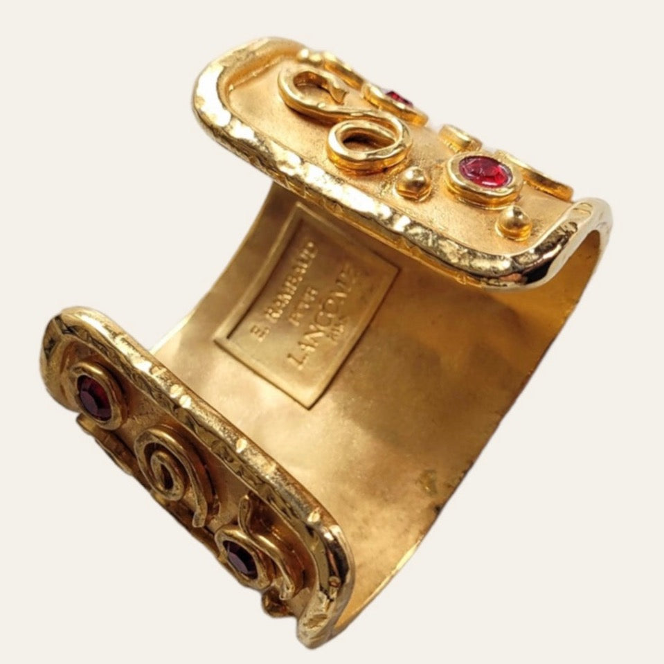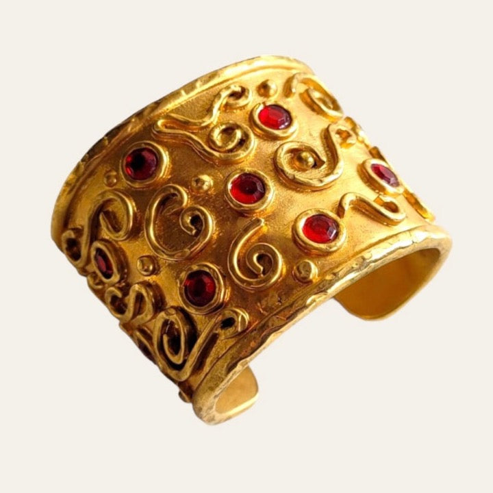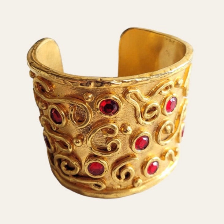 Magnificent signed Edouard Rambaud for Lancome cuff bracelet in a rich gold tone gilt metal decorated with red rhinestones.
