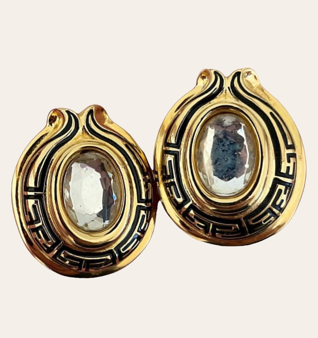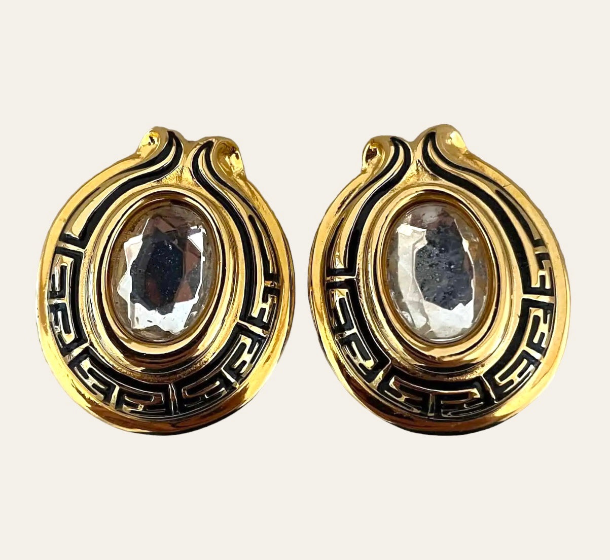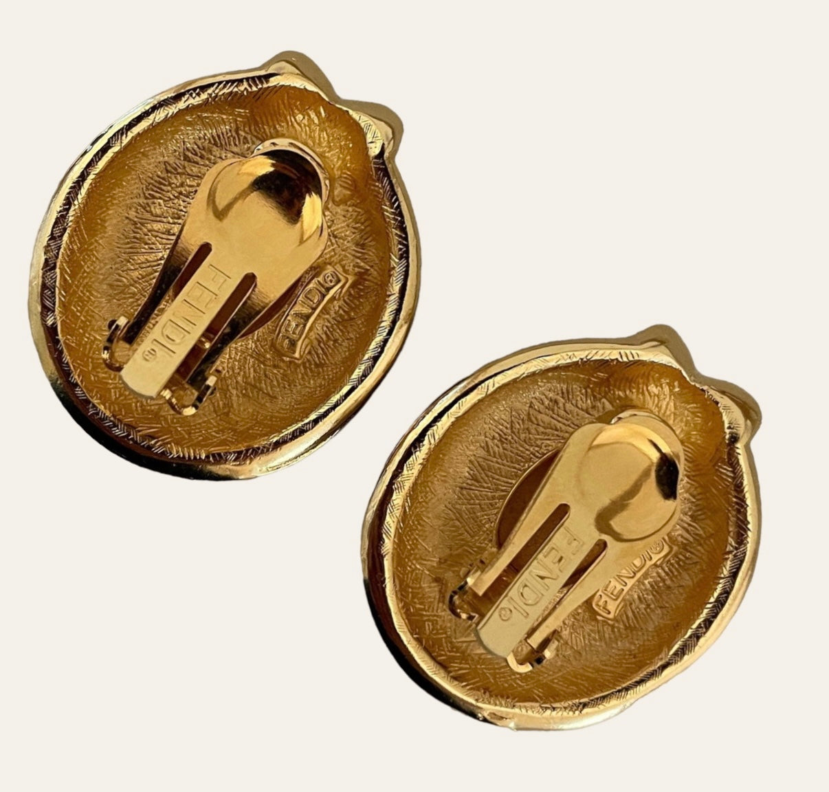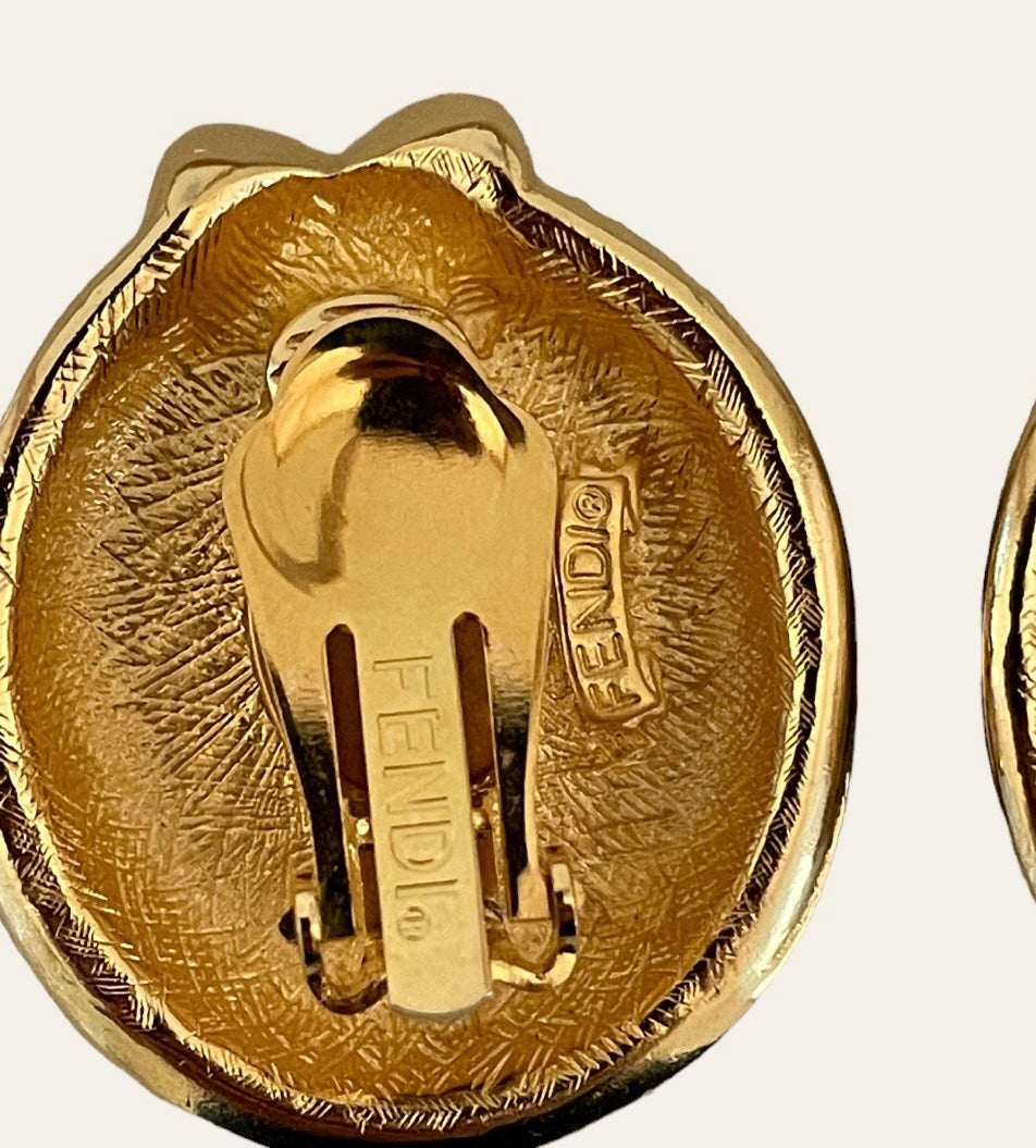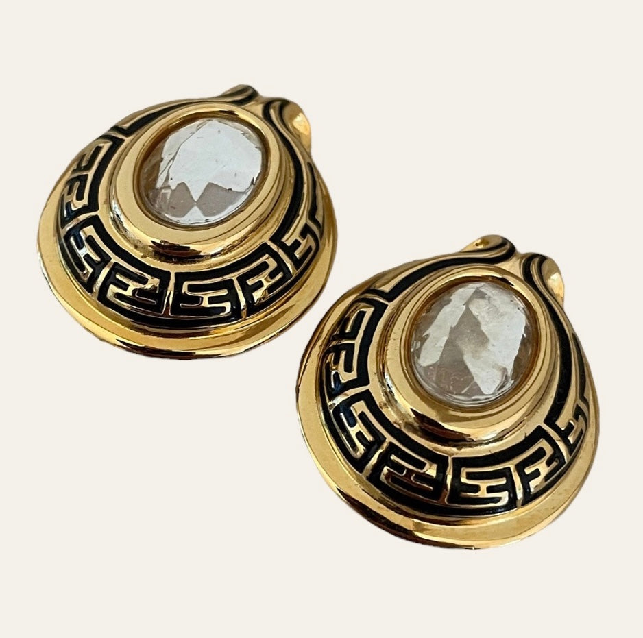 Gorgeous domed Fendi clip on earrings featuring a shiny gold tone base with F for Fendi black enamels accents in a Greek inspired style, surrounding a crystal glass stone. A Romy's fav!