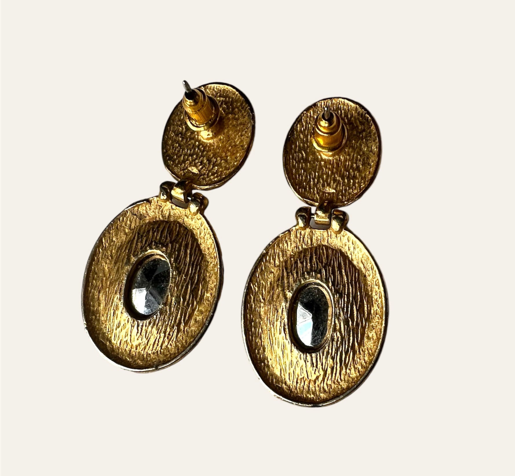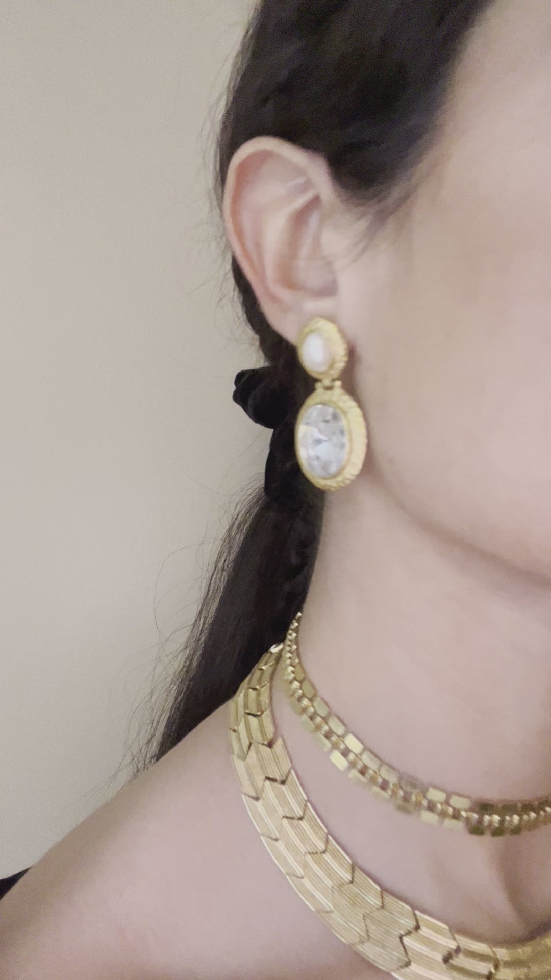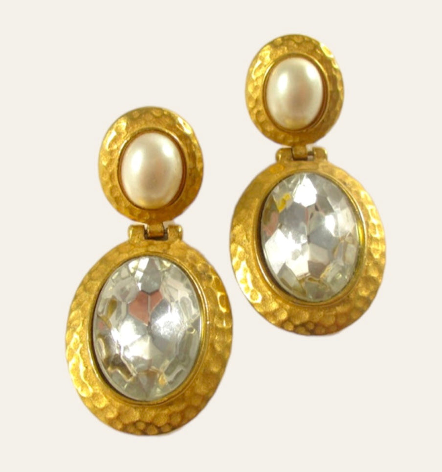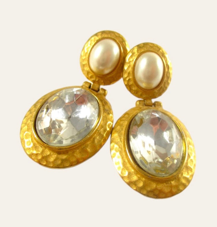 So fresh! Gold tone earrings with large rhinestones and faux pearls.