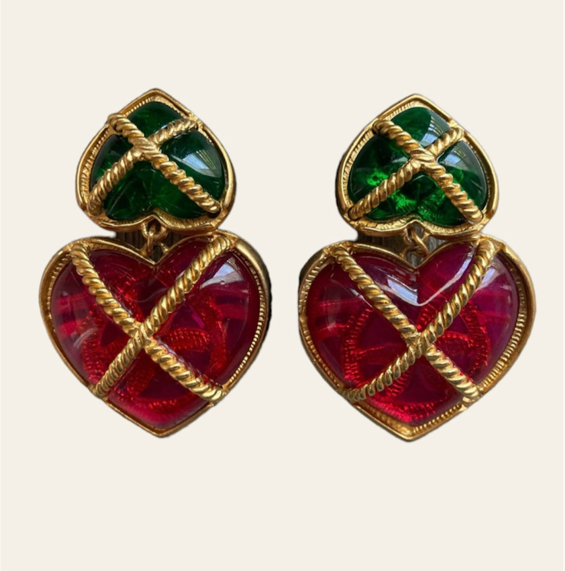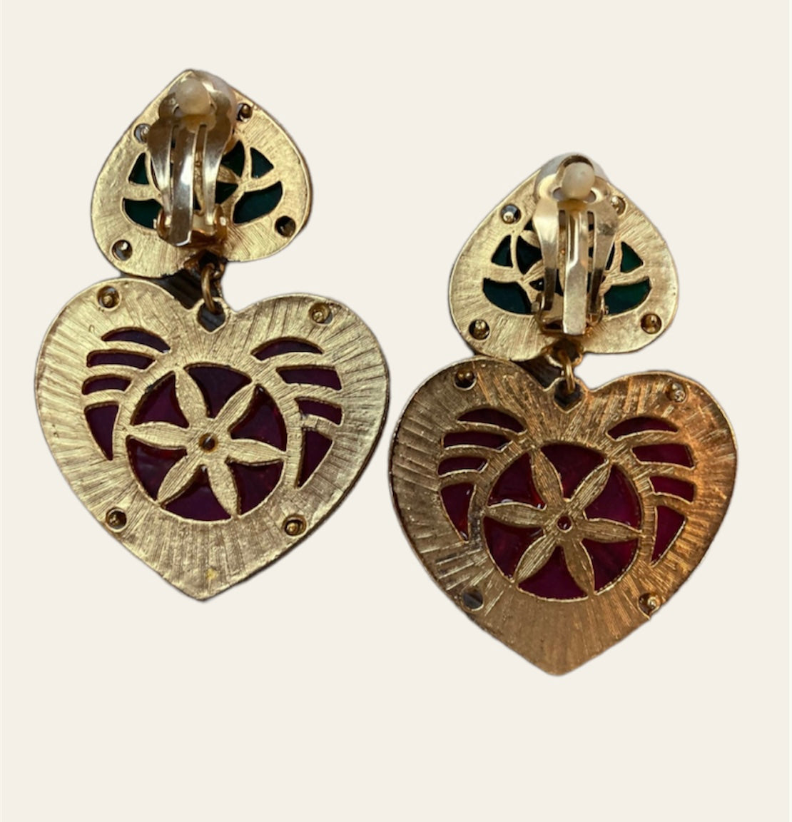 1980's Huge Red and Green Heart Shaped Clip On Earrings