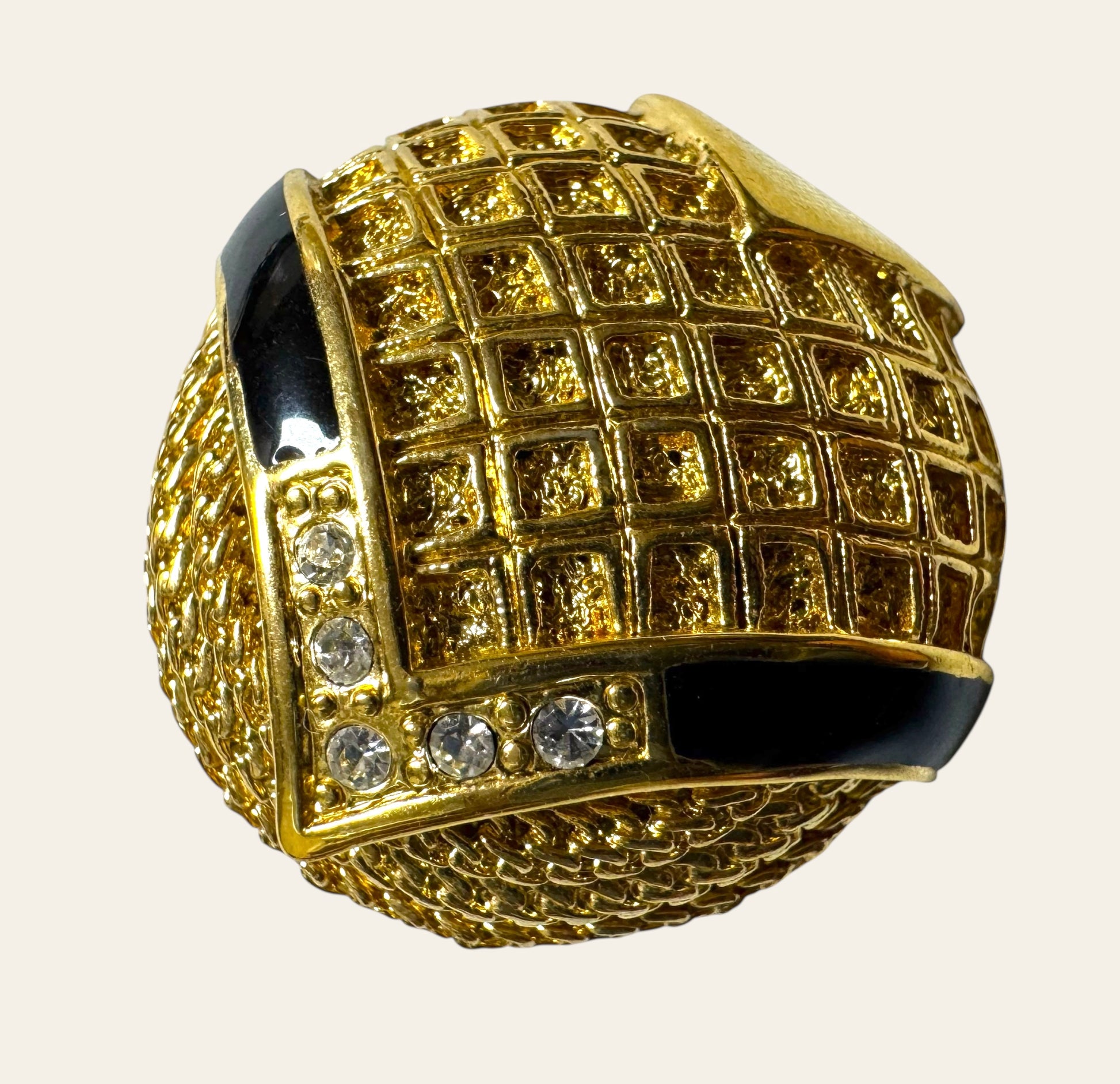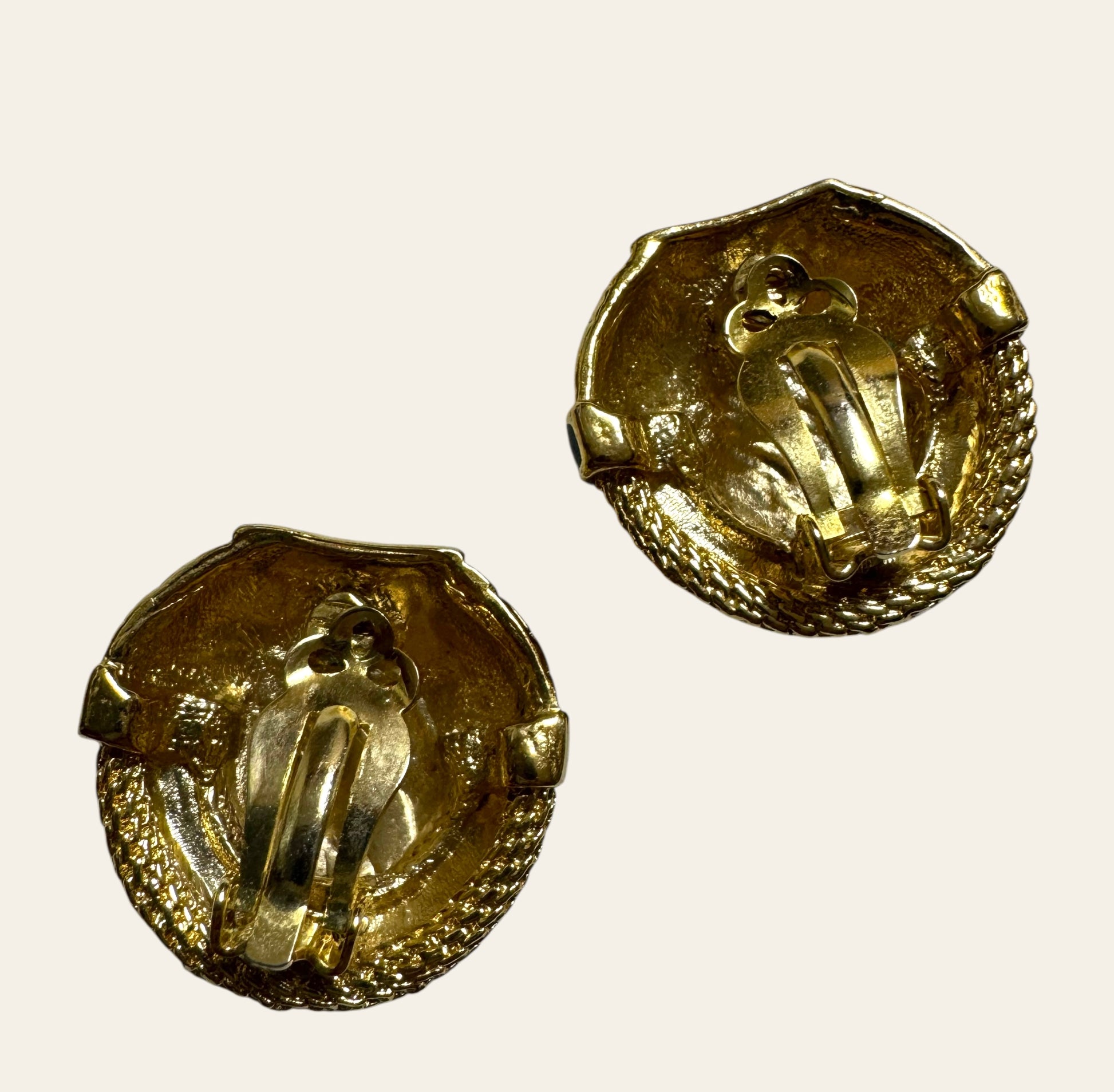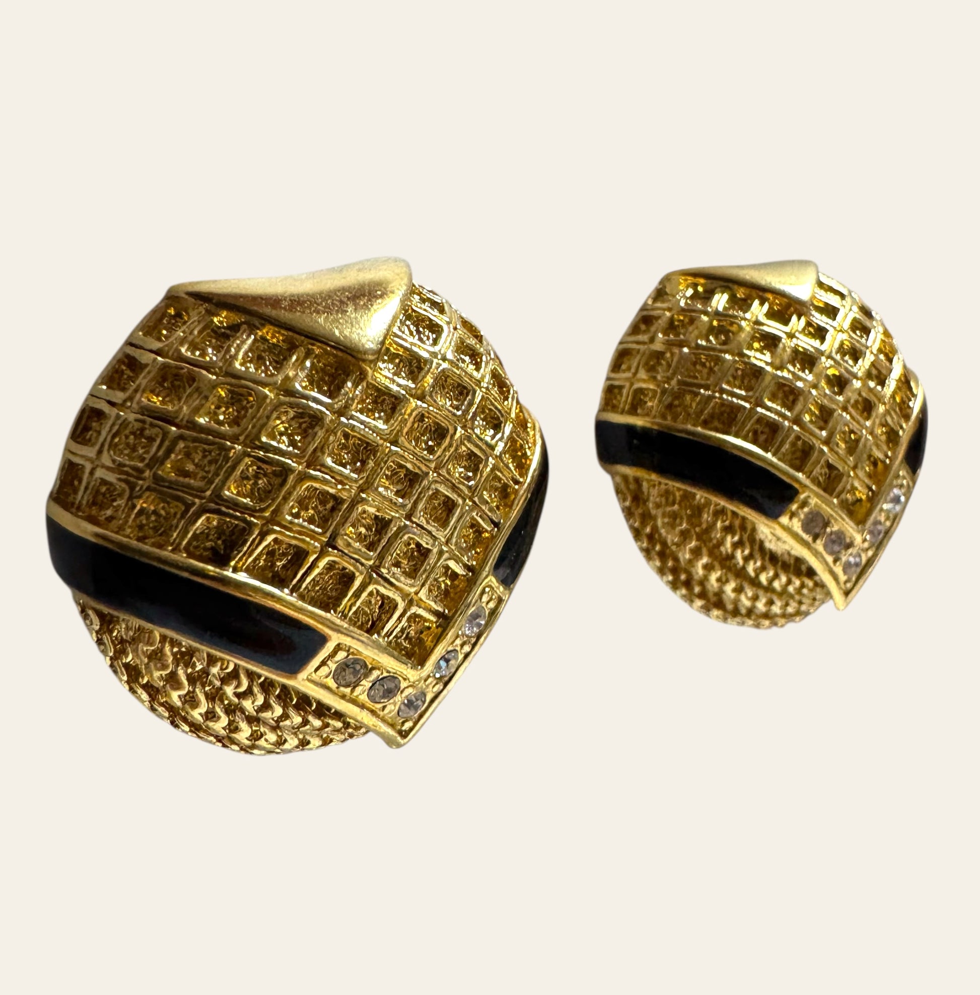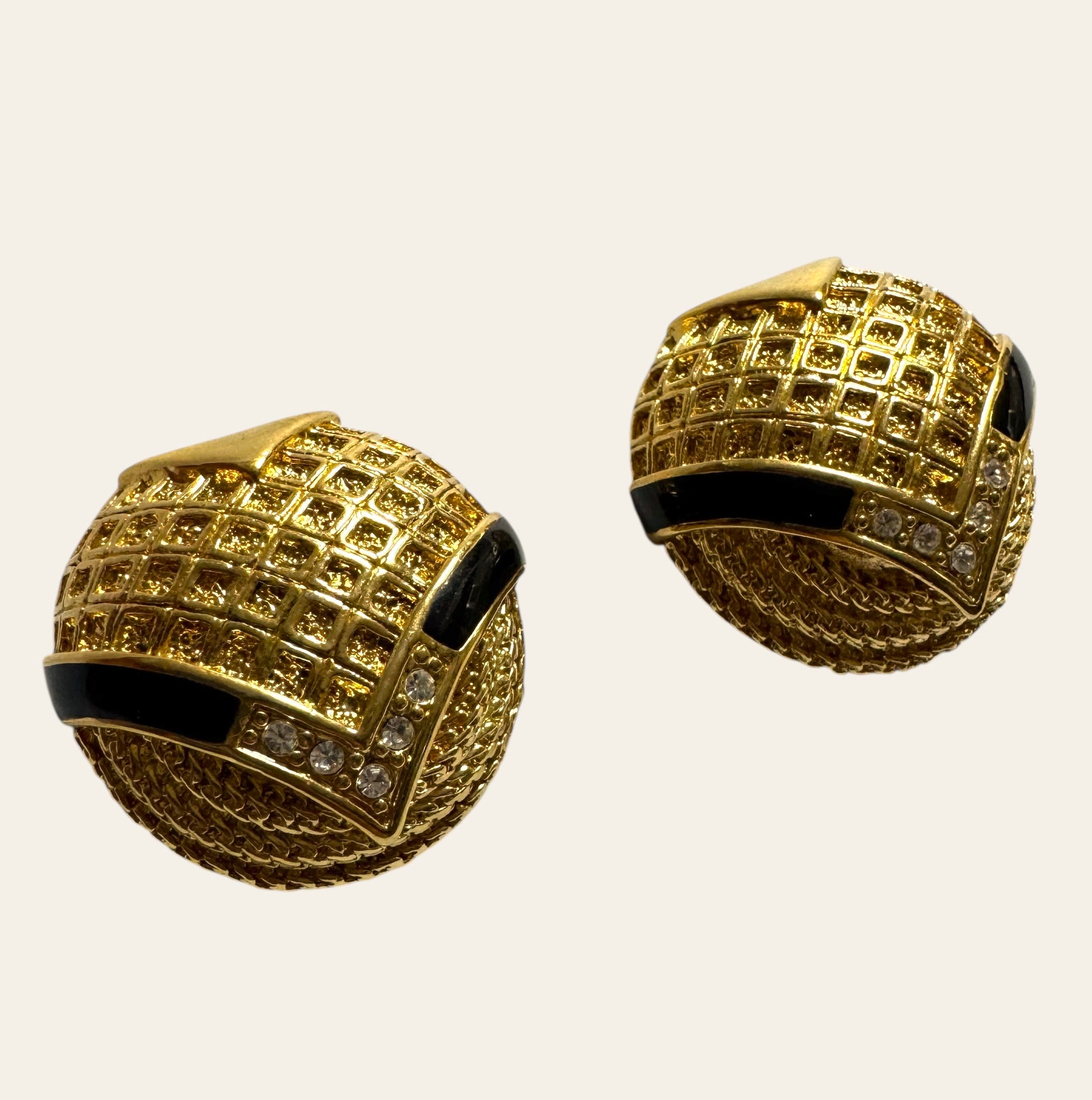 Rich looking clip ons featuring sculpted in a domed textured gold-tone base intricately woven like golden mesh. The contrast between the sparkling rhinestones, the rope-like texture, and the sleek black enamel gives these earrings a dramatic, art deco feel, both opulent and architectural.