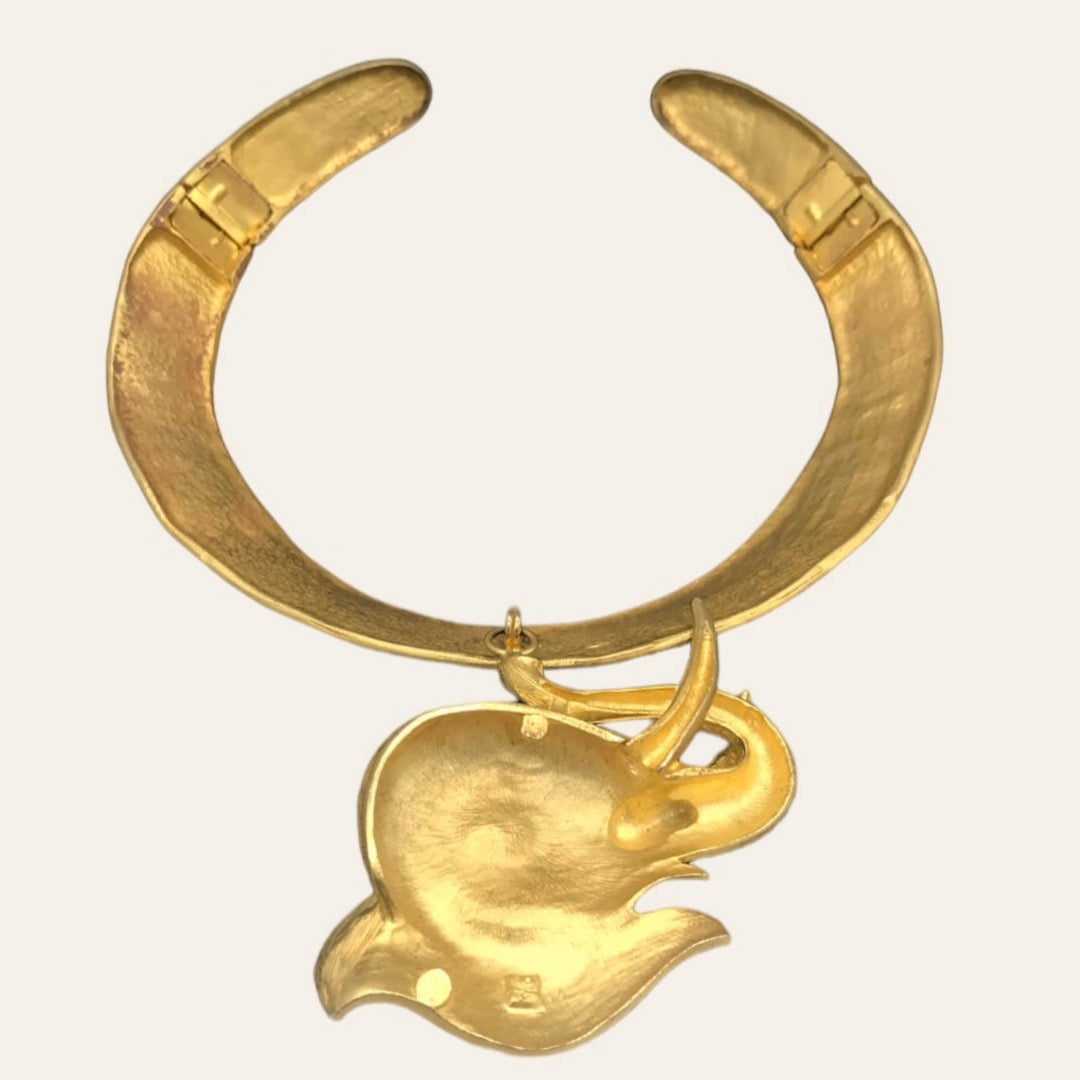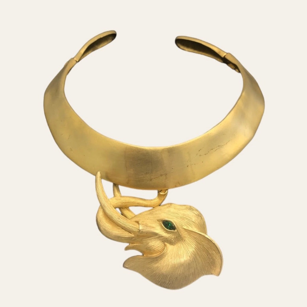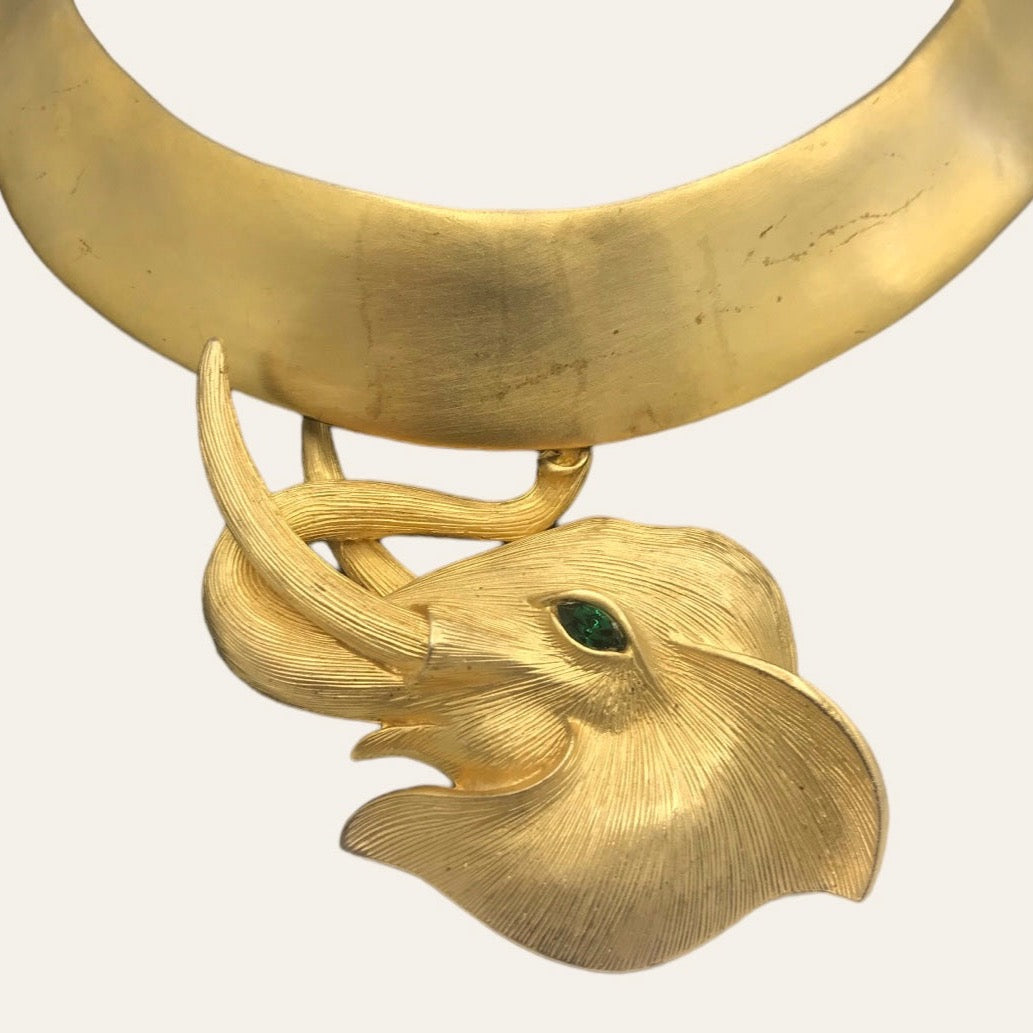 STUNNING and rare signed "Vo" for Les Bernard on the pendant, couture runway necklace featuring a matte gold tone metal and a large elephant pendant with green glass eye. The pendant comes off so it can be worn with a velvet choker or any chain. A Romy's favorite!