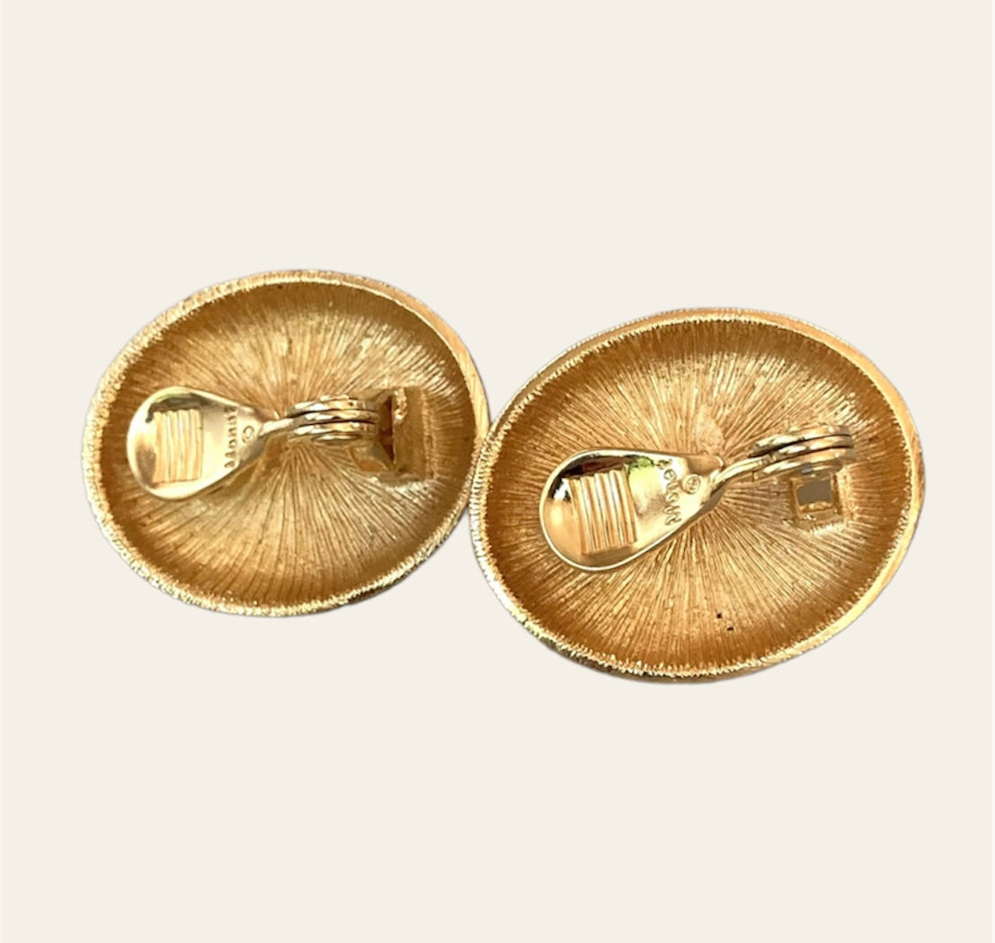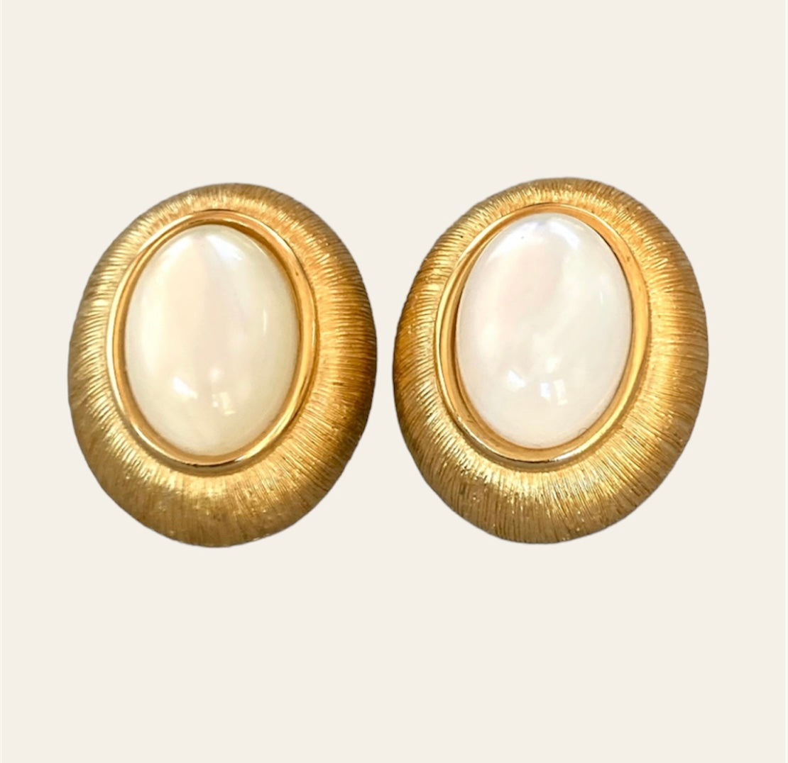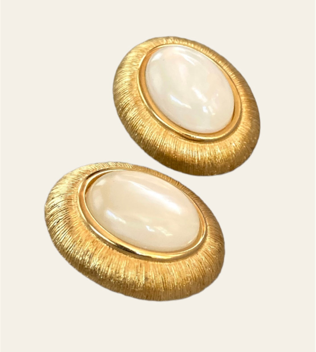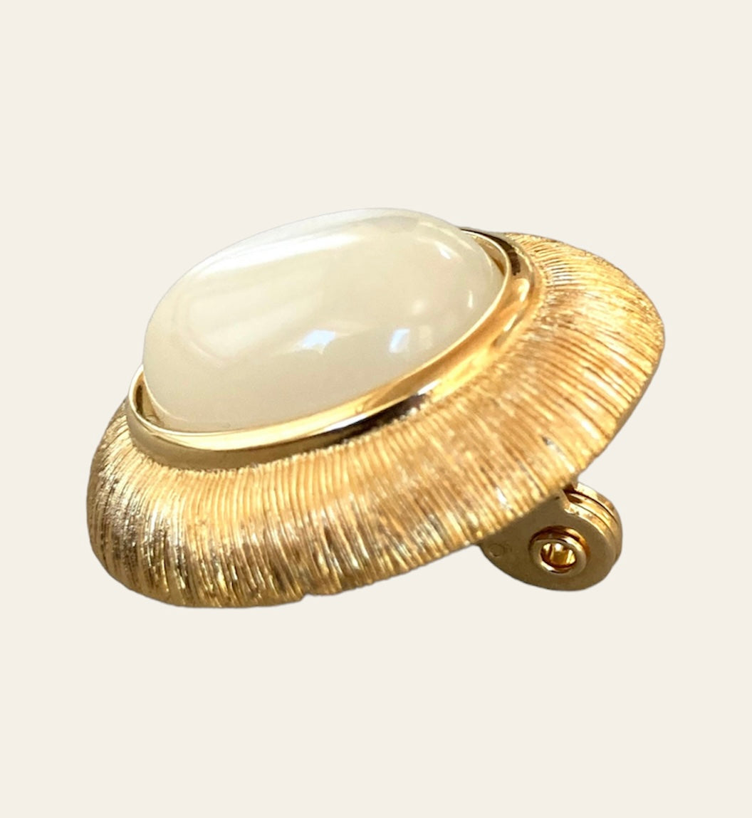 Gold tone metal with a matt finish with a poured glass center in a pearly white collar clip on earrings, and the backs are marked "Monet".