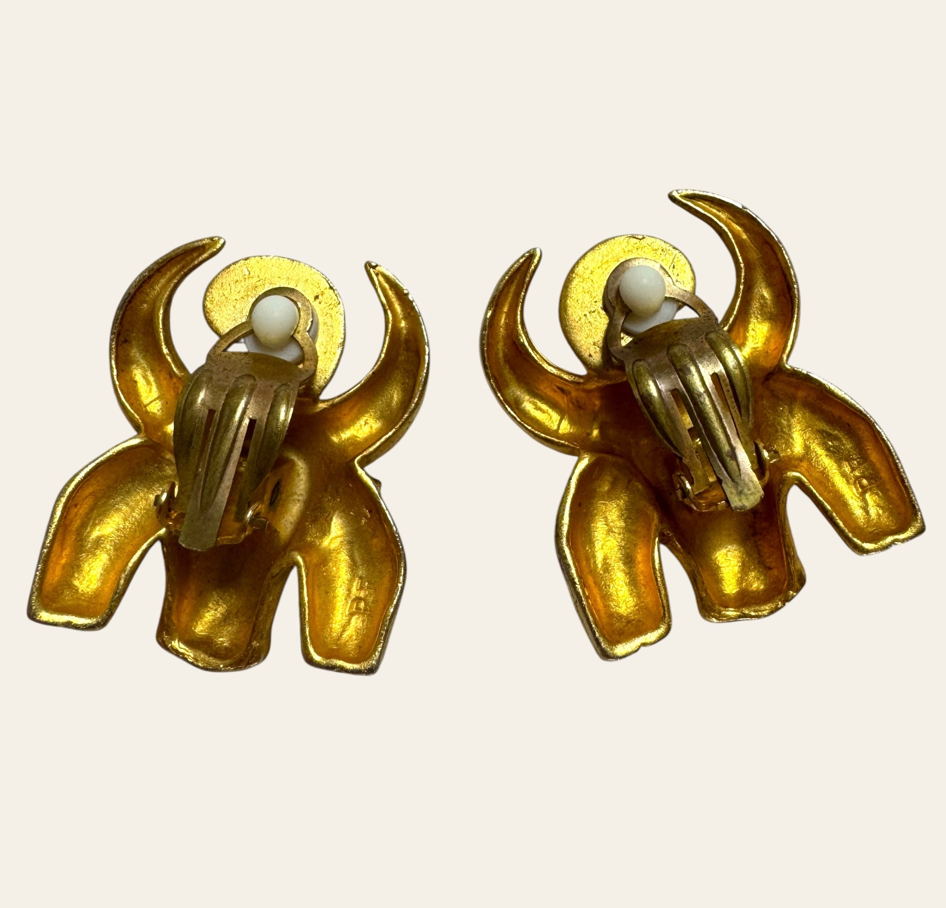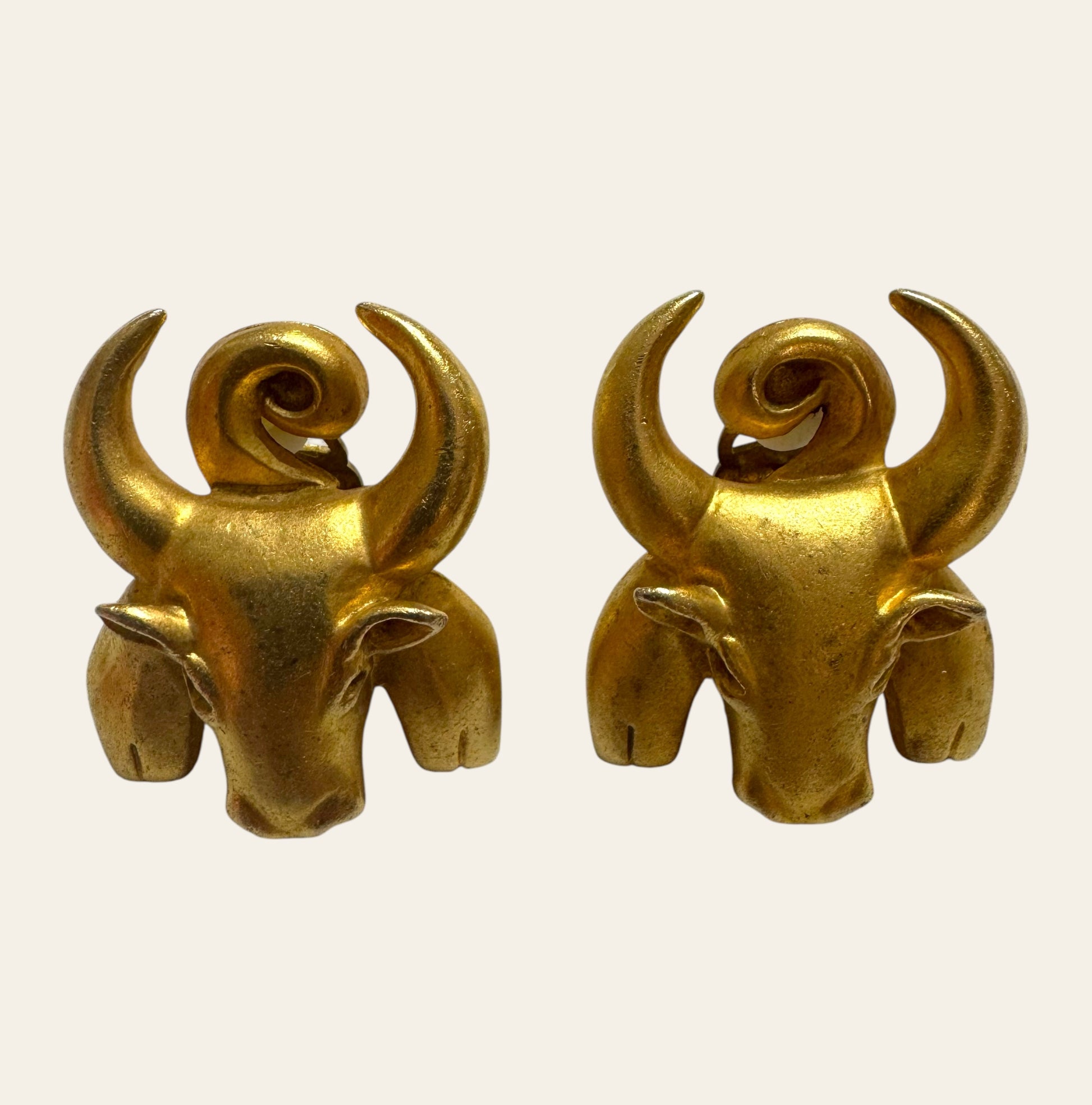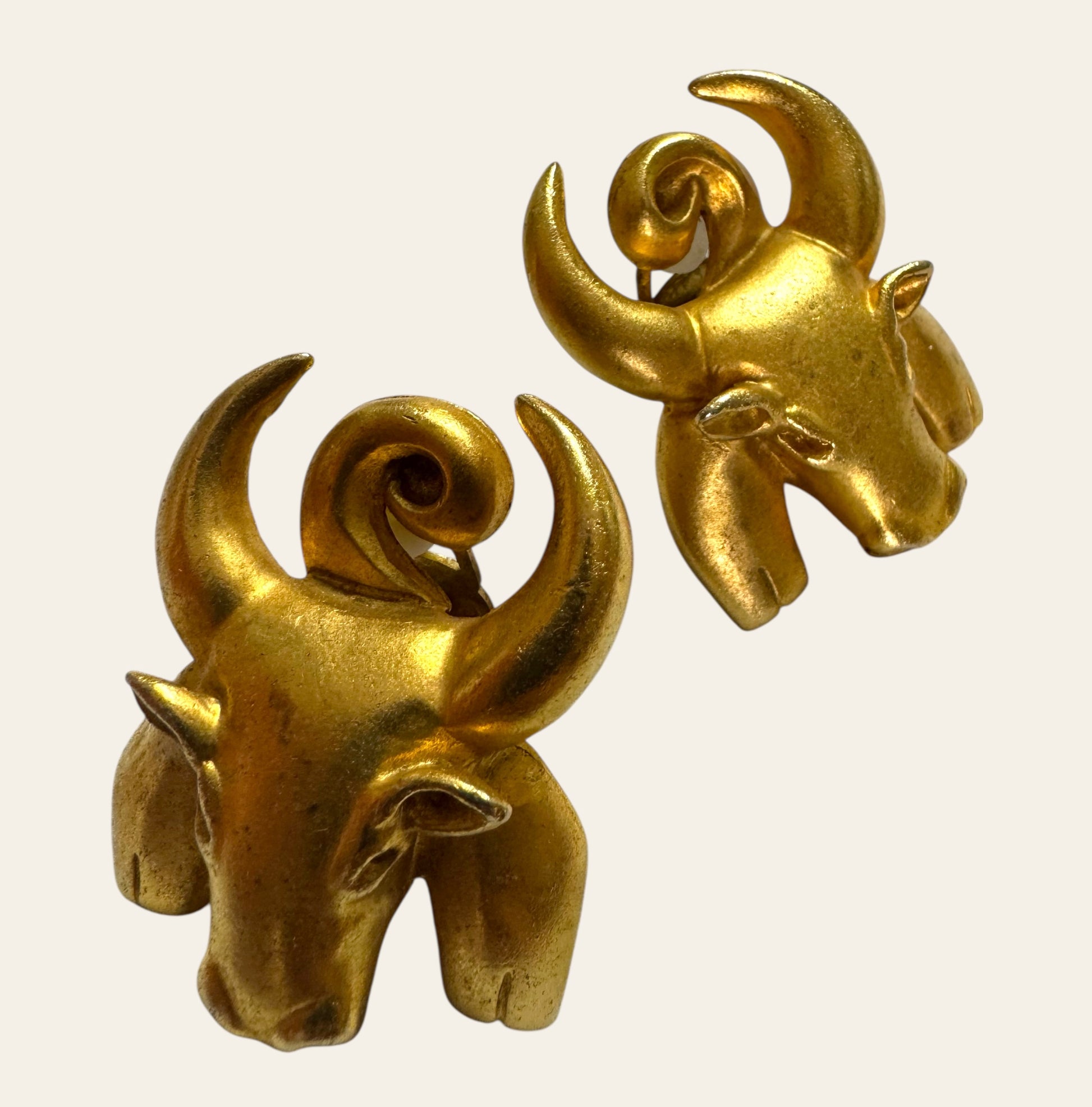 Purchased in NYC from a private collector. An extraordinary pair of unsigned vintage ram head earrings in richly burnished gold-tone metal—bold, symbolic, and utterly majestic. Sculpted with incredible detail and weight, each piece features powerful curled horns and stylized features that evoke ancient strength and mythical elegance.