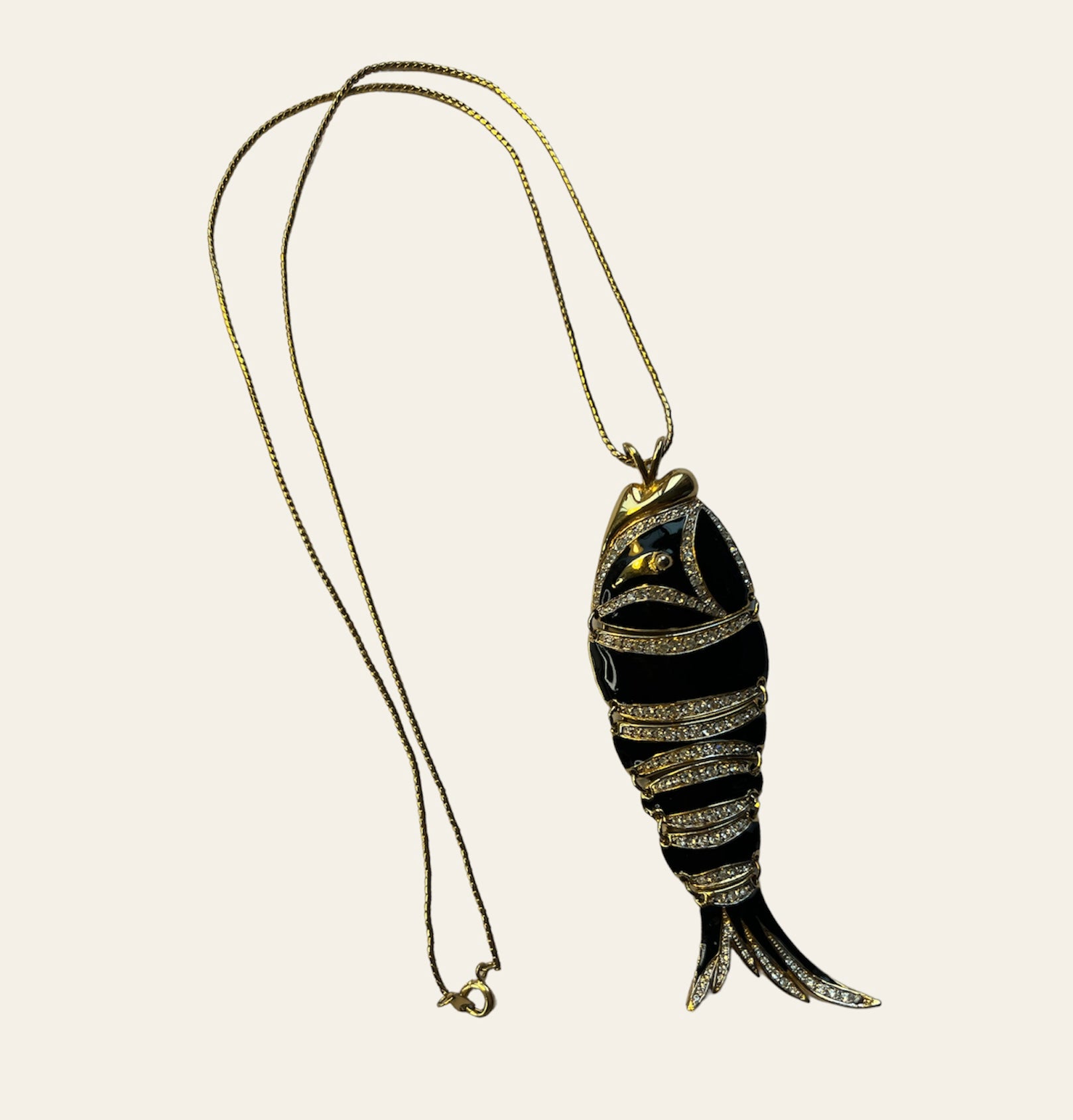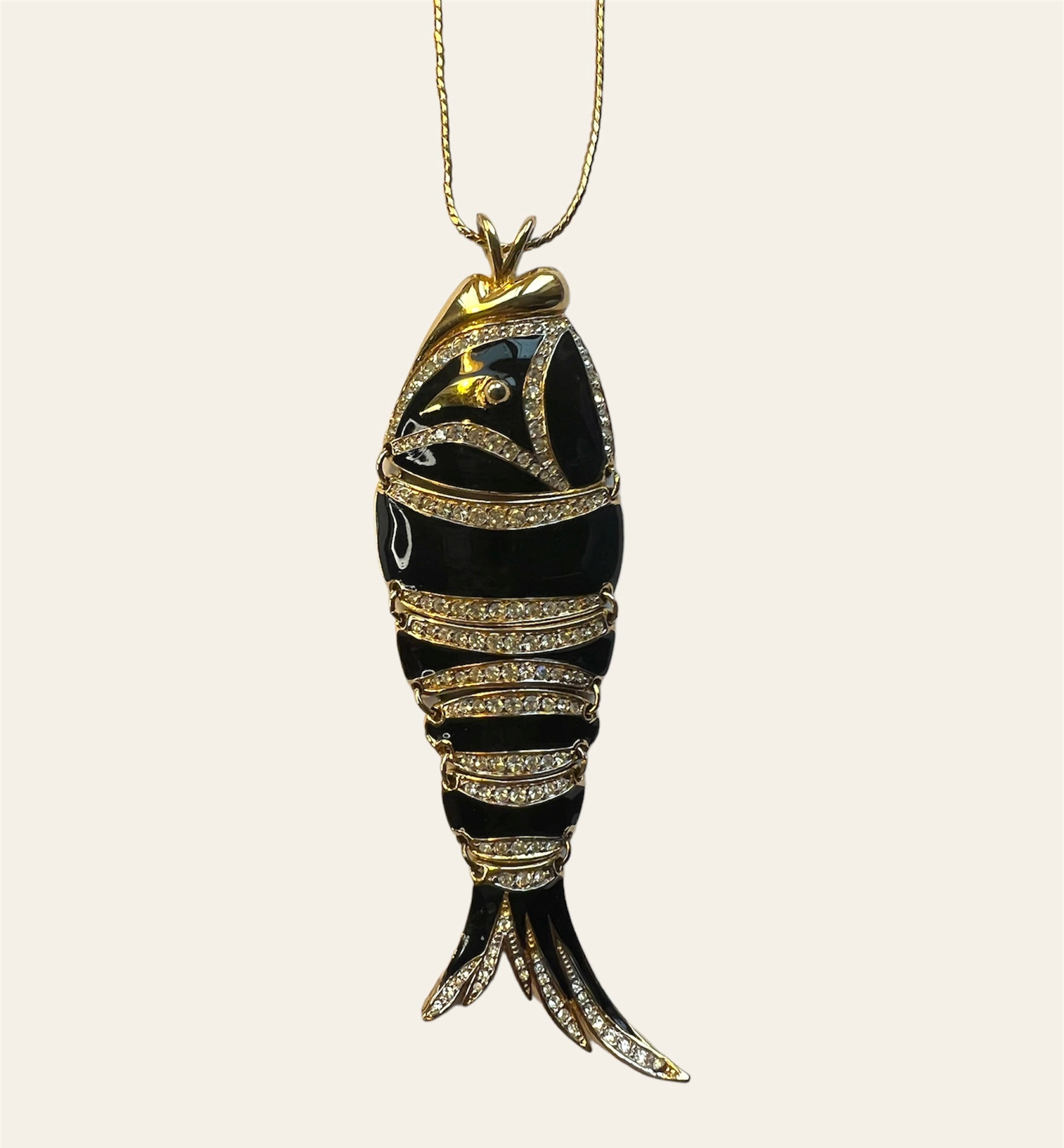 Signed "D'Orlan" black enamel diamanté with a shiny gold contour Fish pendant necklace with a long gold chain.