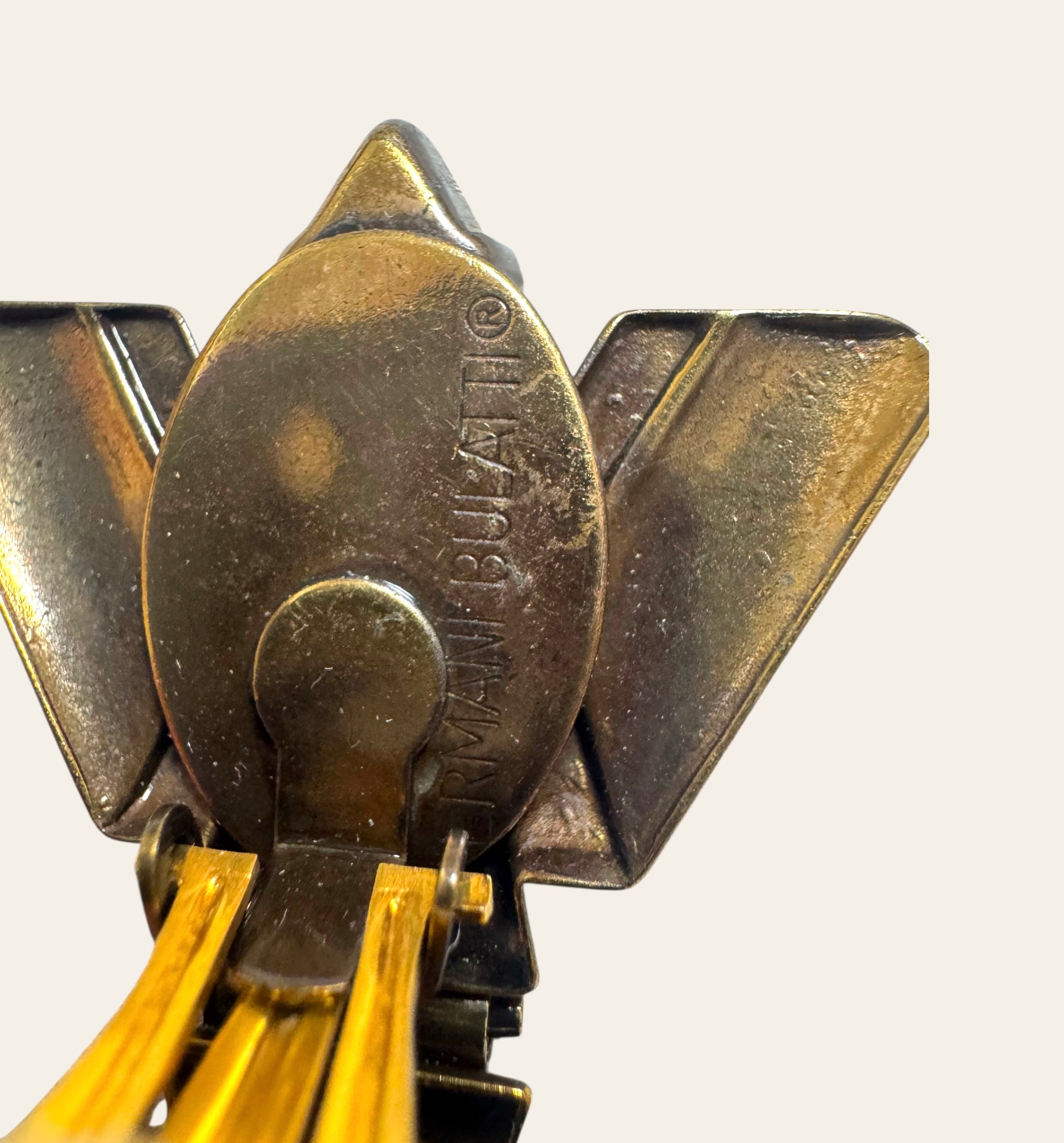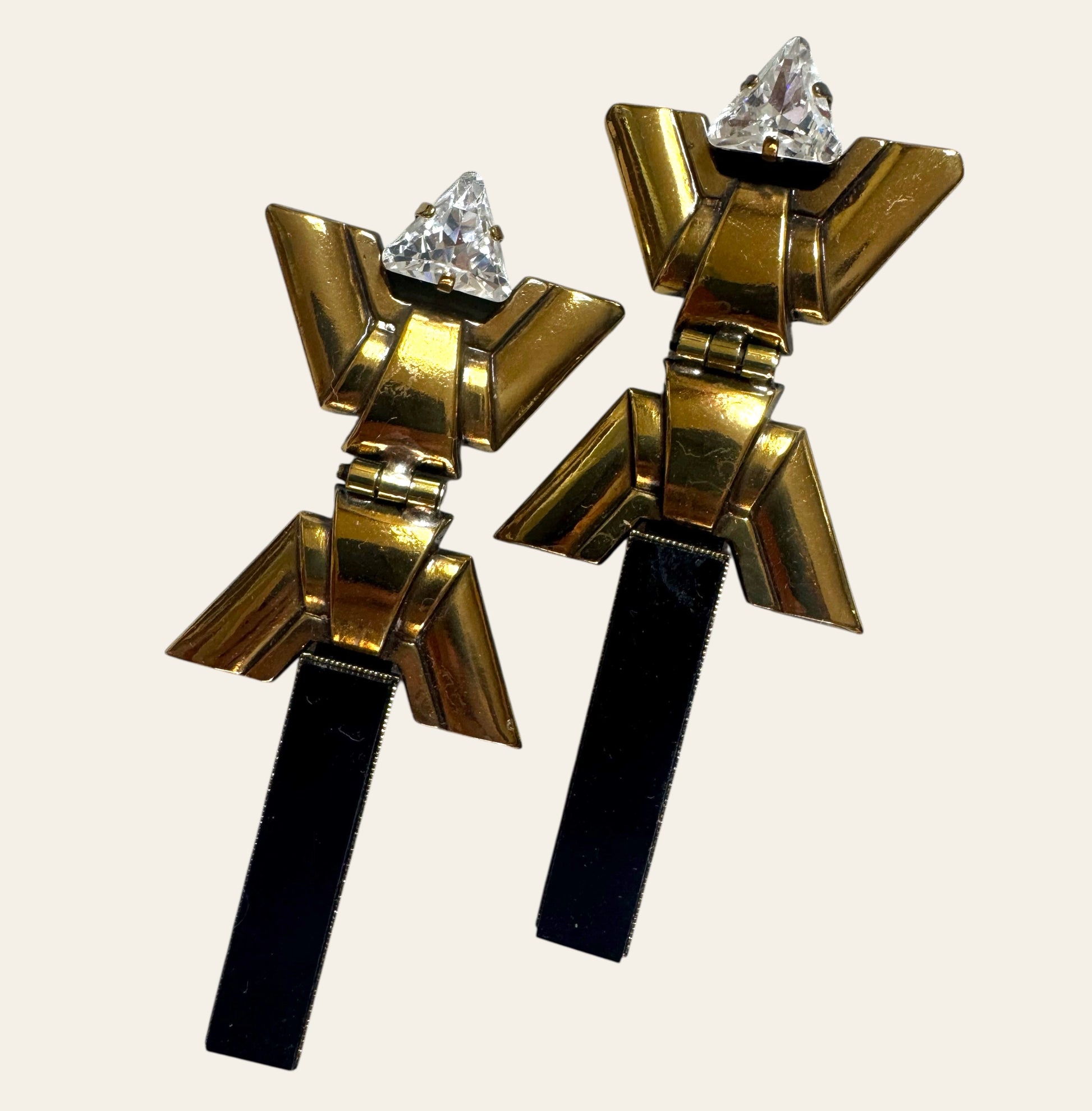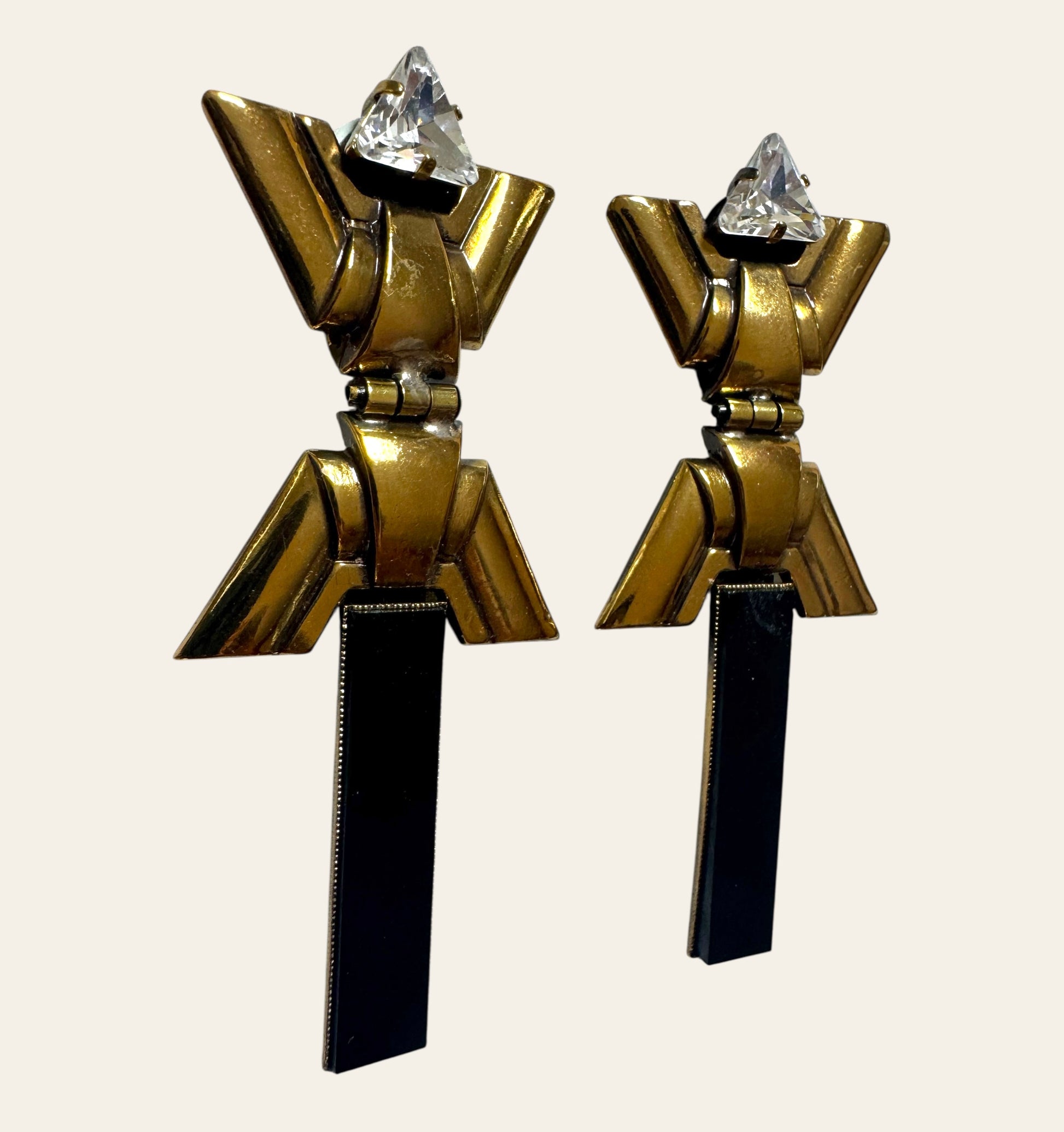 Long chic and Art Deco style clip on earrings featuring a gilded brass, long triangular black onyx like glass and triangular crystals. These are high end earrings by the Dutch designers with geometrical lines, they are so elegant.