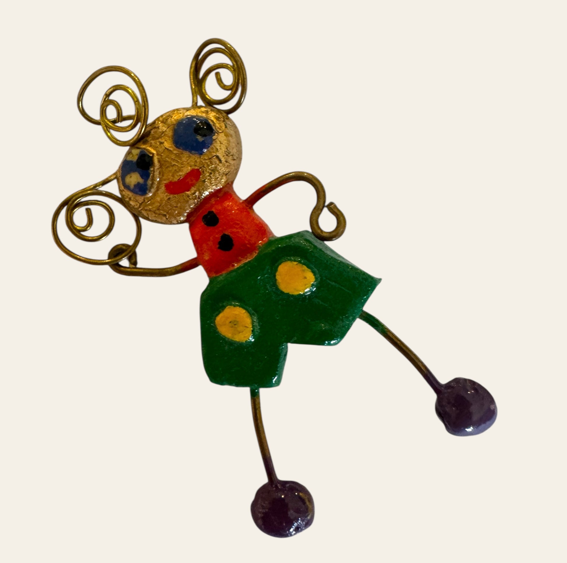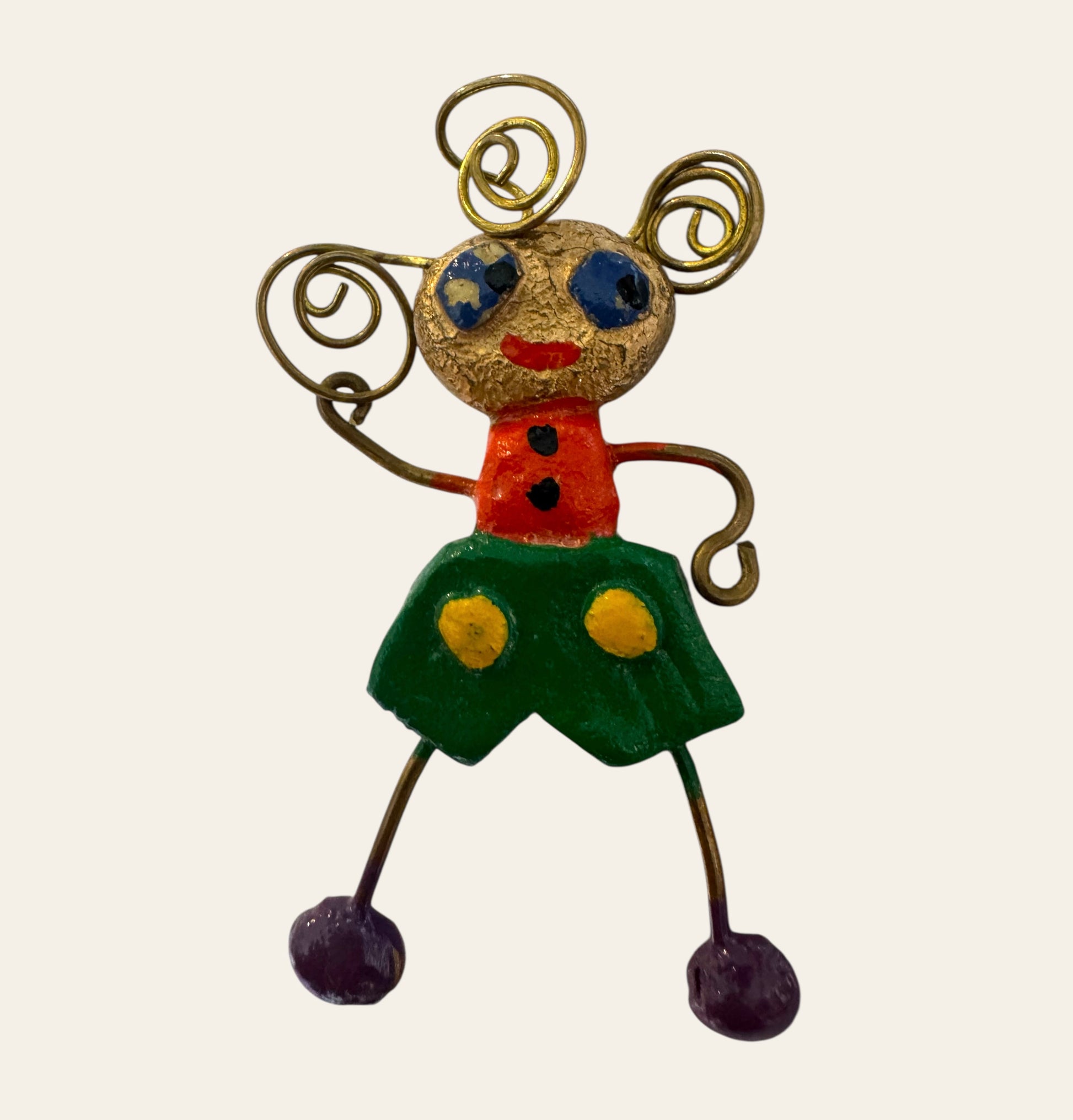 This handmade piece features a playful figure with spiral wire hair, hand-painted face, and vivid enamel outfit in red, green, and yellow. A charming nod to childlike imagination and postmodern design, this brooch captures the free-spirited creativity of the era.
