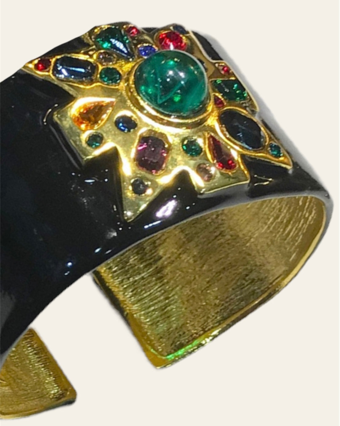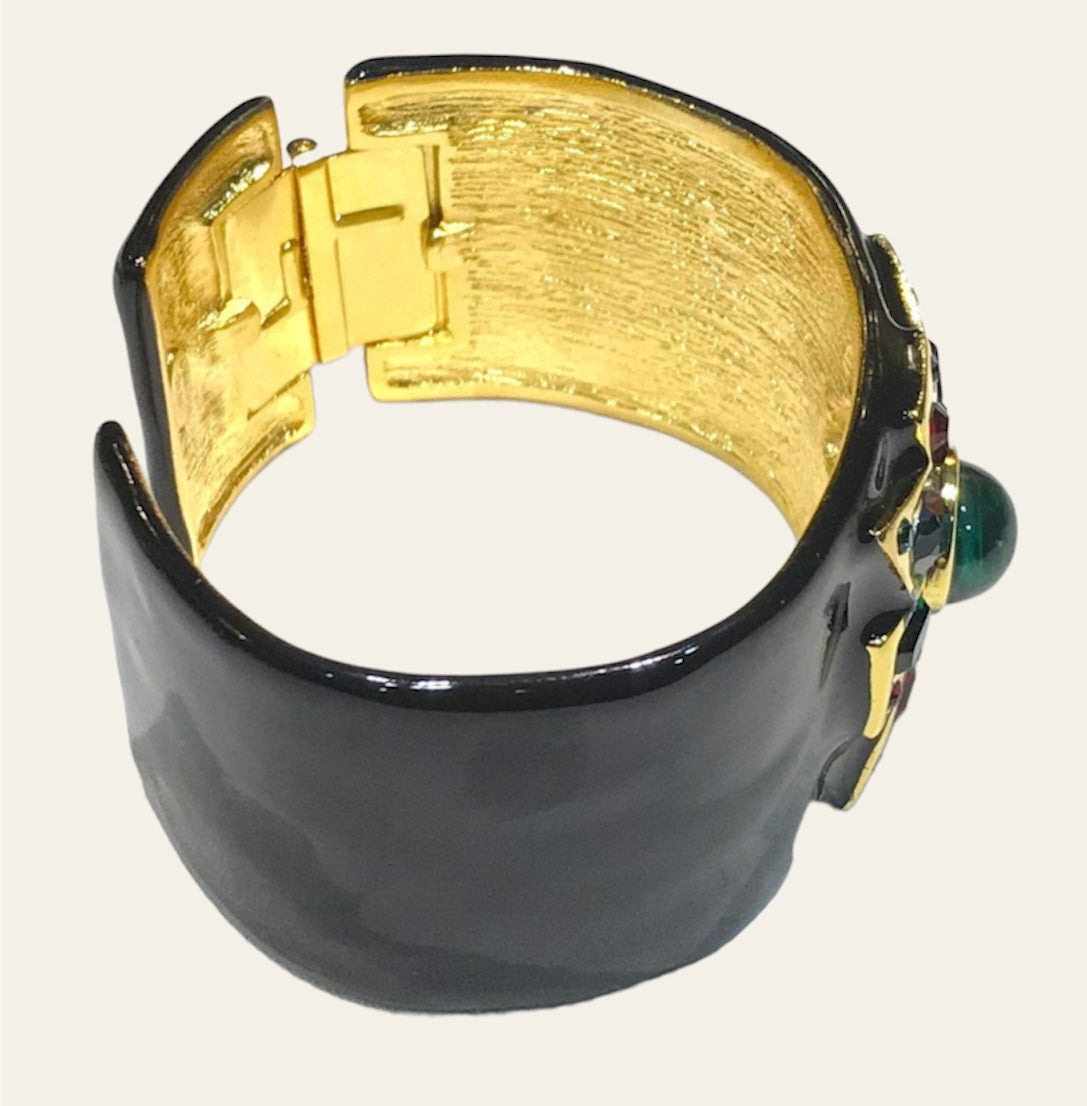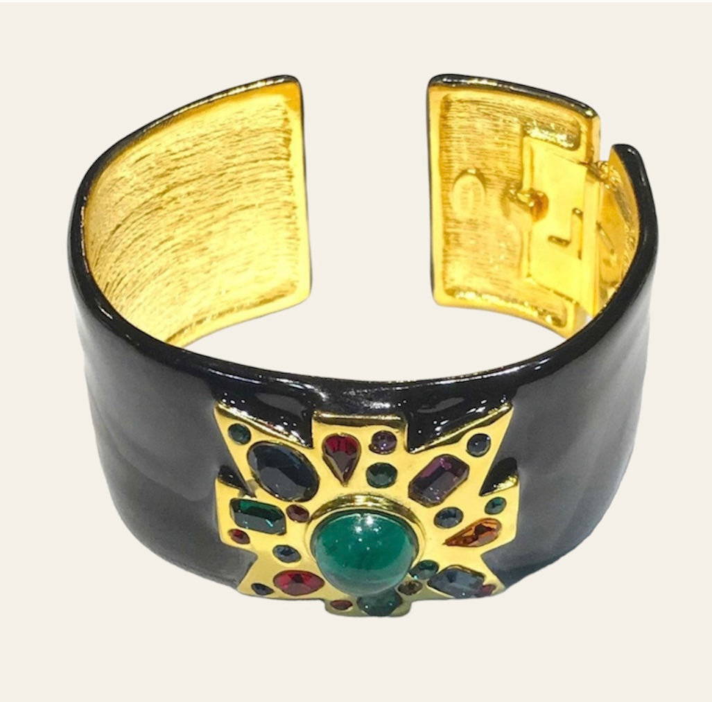 Signed "Kenneth Jay Lane" black enamel hinged cuff with a gold tone Maltese cross design with a swirled amethyst cabochon surrounded by clear rhinestone shapes in different colours.