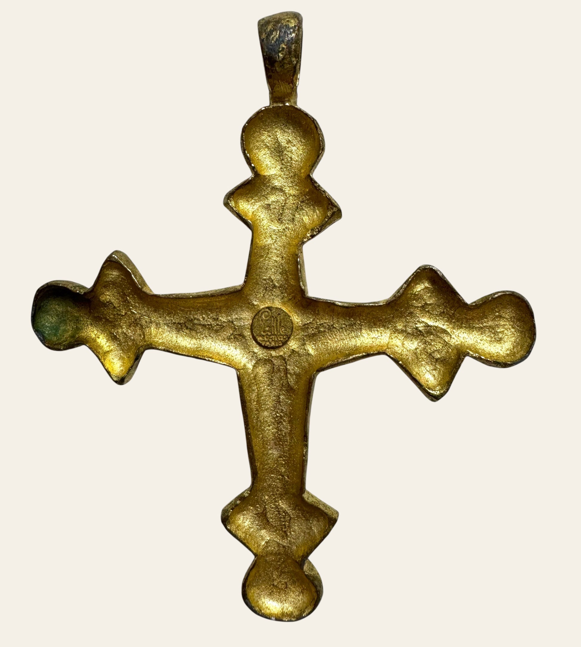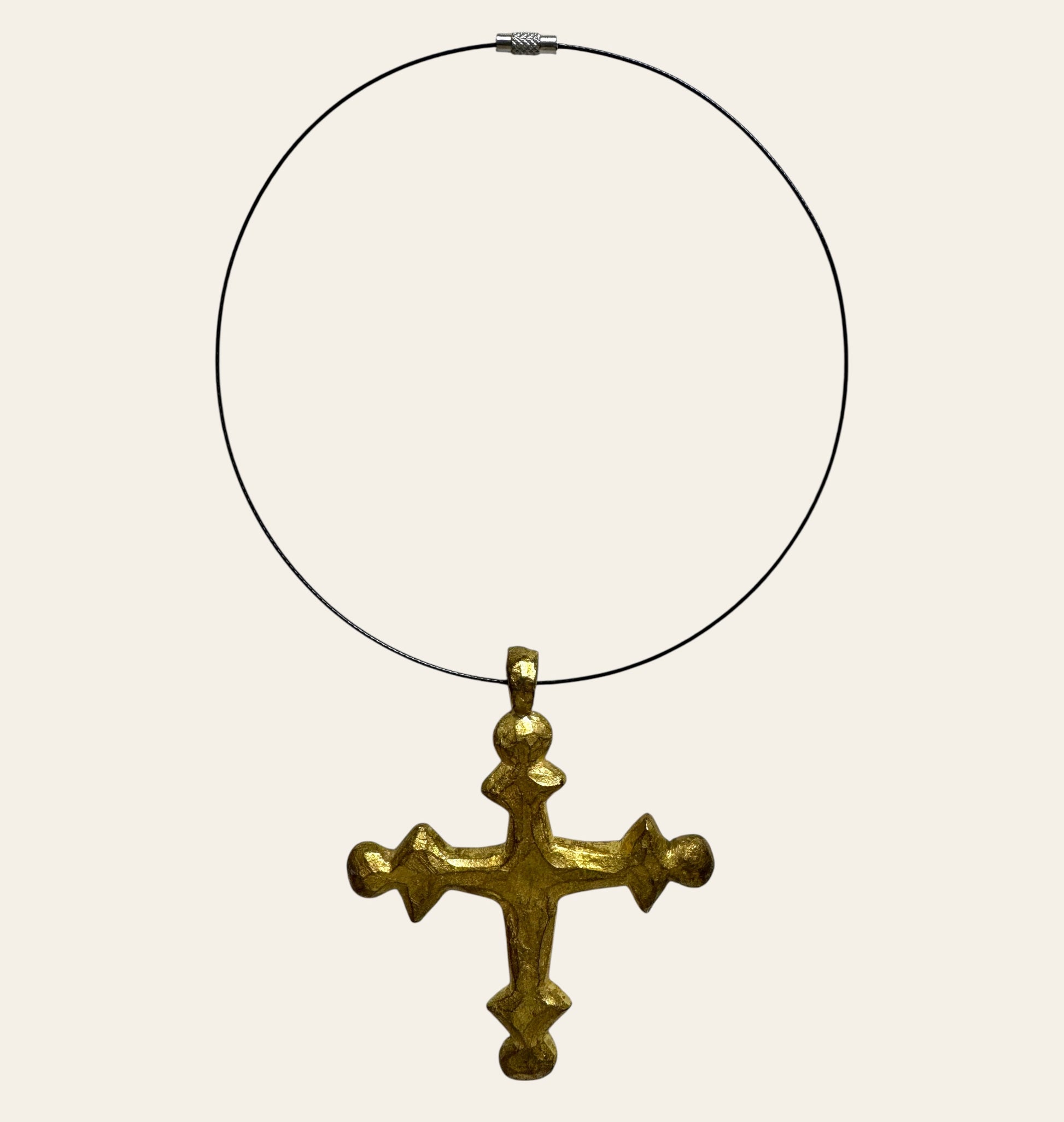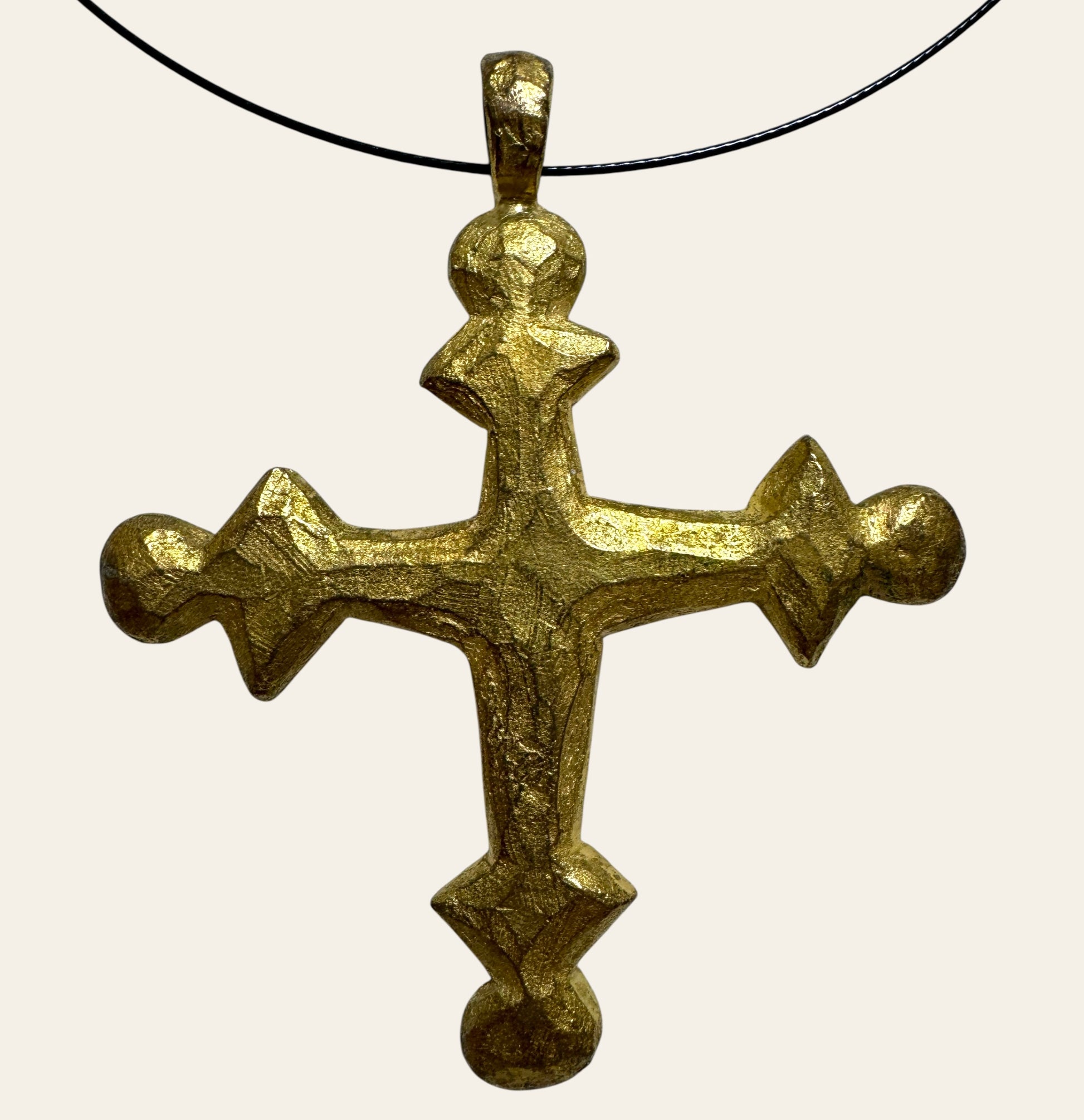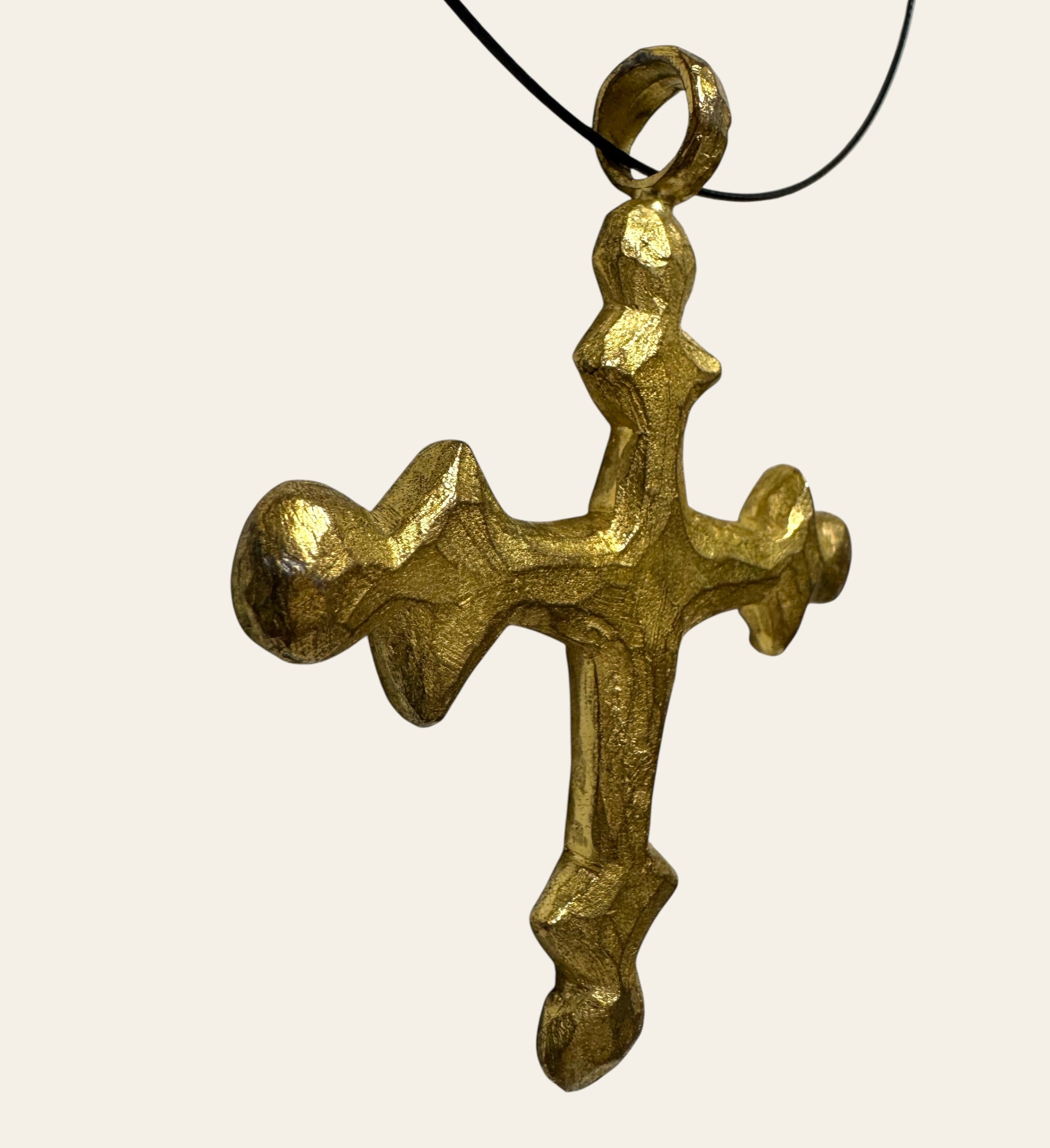 This powerful statement pendant in the form of a sculptural cross, cast in radiant matte gold-tone metal with a weathered, almost artifact-like texture. Its sharp angles and beveled edges give it a sense of architectural gravity. Striking in its simplicity yet rich with symbolism, this piece carries the energy of faith, protection, and legacy. Perfect for layering or wearing alone as a modern relic. One-of-a-kind, unisex.