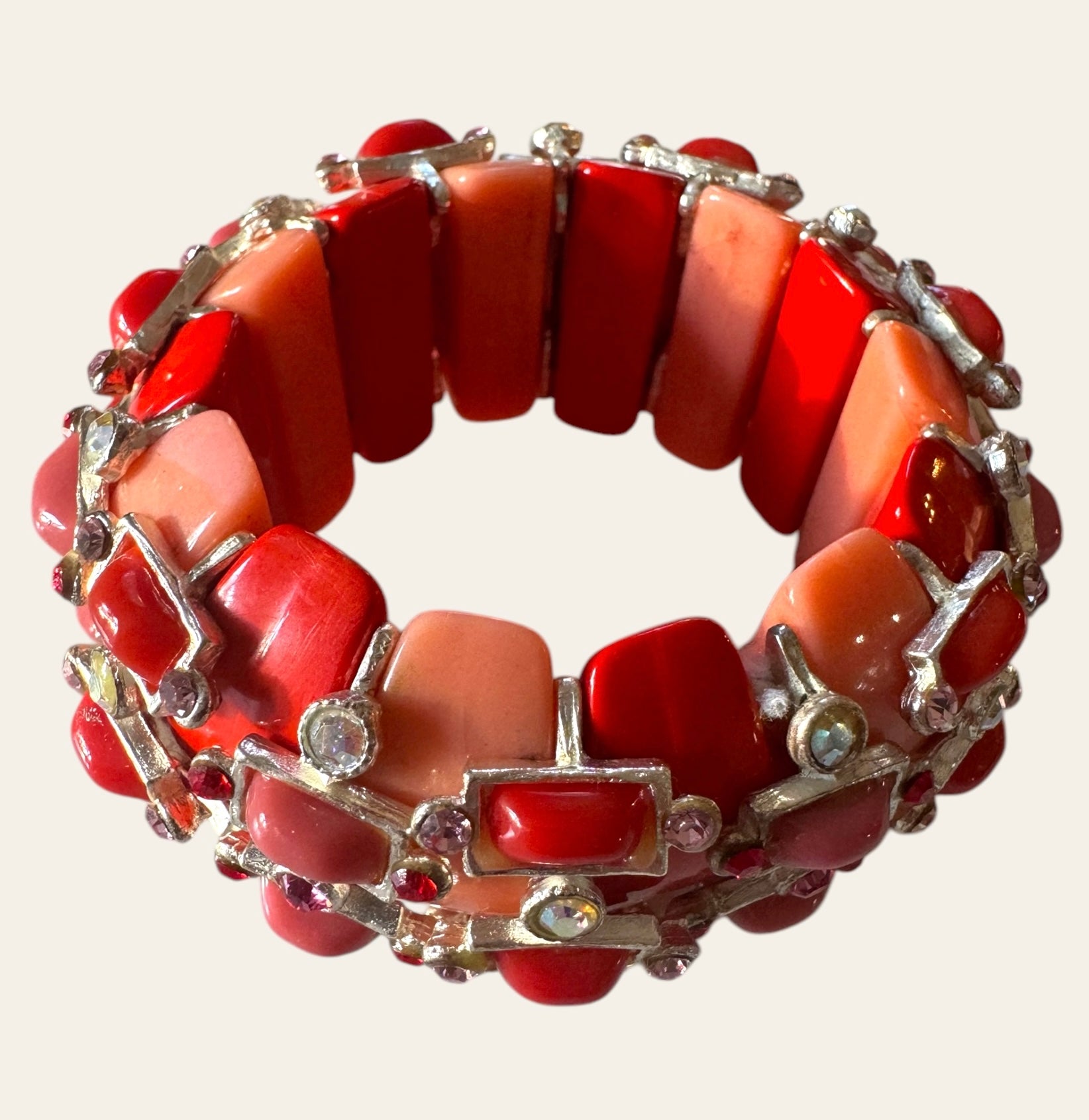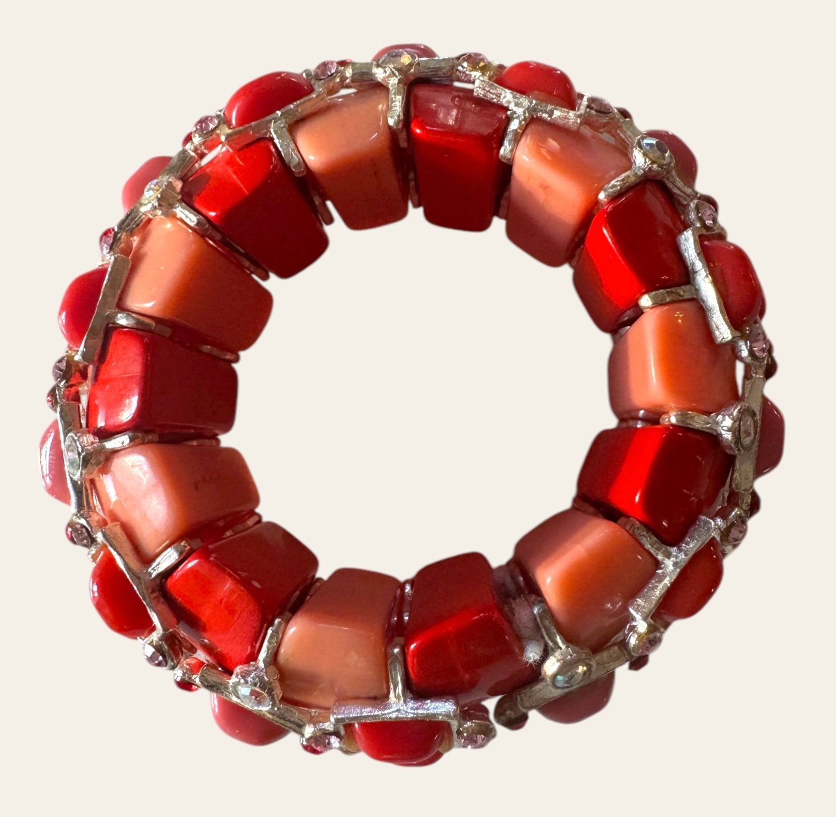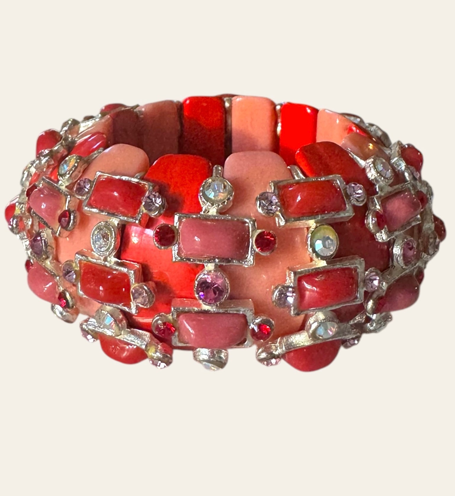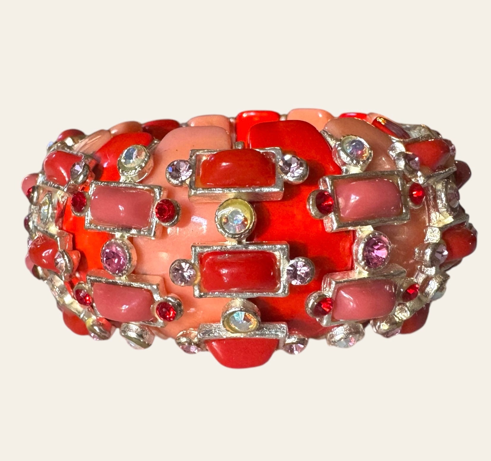 Striking and imposing Art-Deco inspired cuff-bracelet featuring alternating a base of resin panels in rich red, local and peach hues, enhancing the visual depth of the piece. It is adorned intricately with rectangular resin cabochons in shades of coral and rosy pink, adding a sense of luxury and sophistication to the piece. The cabochons are brightened by smaller, round, clear, pink/ hot pink, red rhinestones adding sparkling and luminous quality. The rhinestones are cabochons are mounted on a silver-toned base, forming a structured framework that enhances the geometric and symmetrical layout of the whole piece. This is a bold statement-worthy piece with such an energetic, star energy aesthetic! A Romy's favourite!