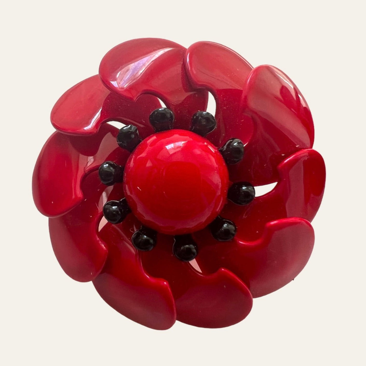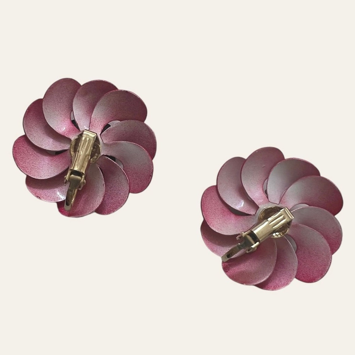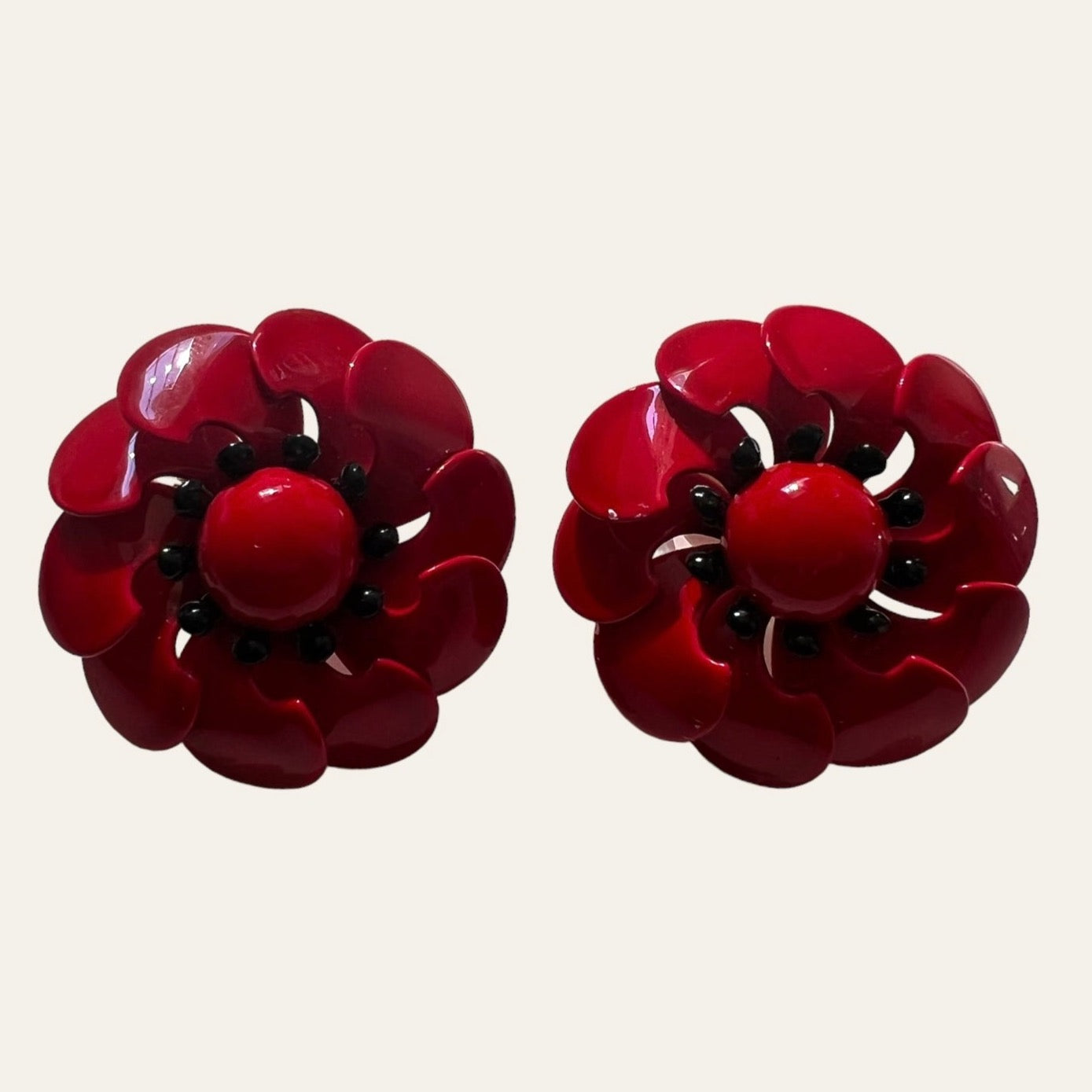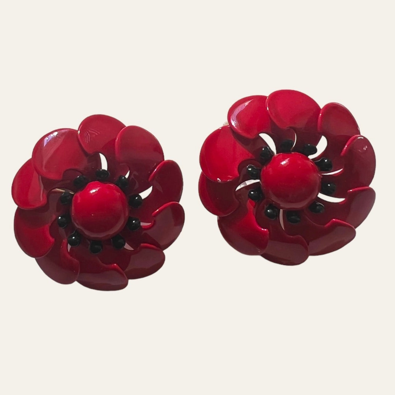 Fresh vintage red enamel flower with individual petals clip on earrings with small black beads around the centre of the earrings.