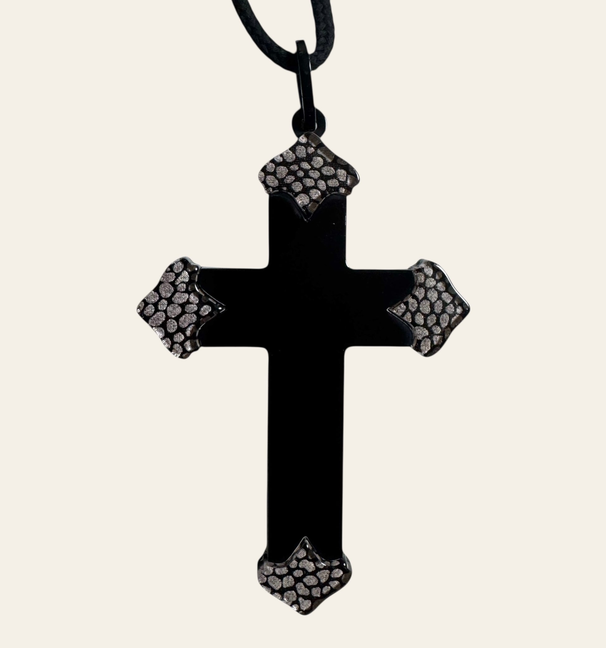 Fabulously huge crucifix, cross in carved and laminated acrylic. Almost like two crosses laminated together. The tips of each of the arms of the cross have a wonderful pattern of gold dots - it is a piece of silk fabric under clear acrylic, laminated onto the black acrylic adding that wonderful effect.
