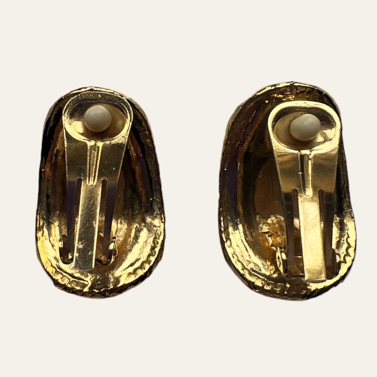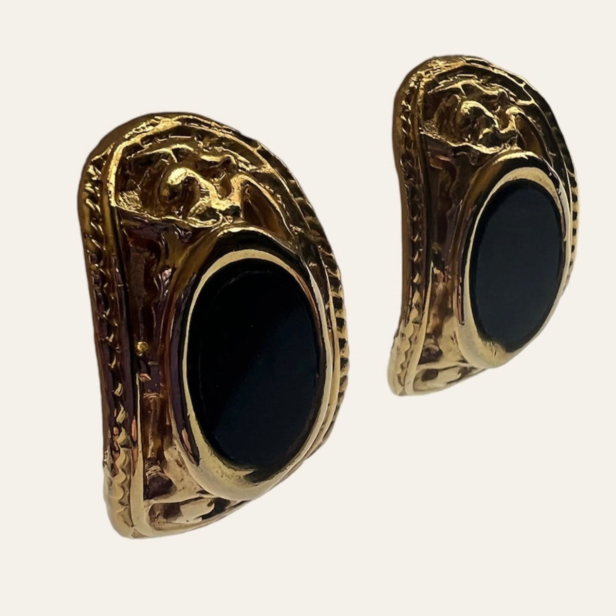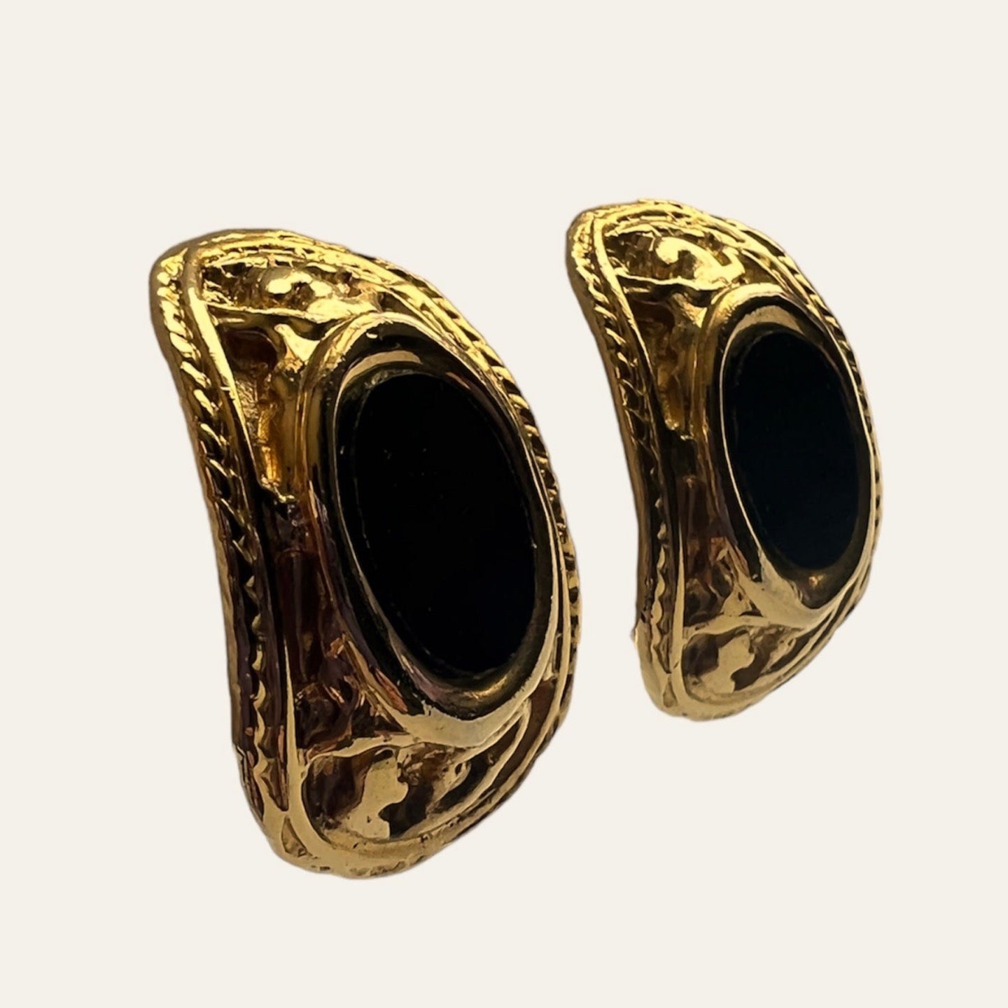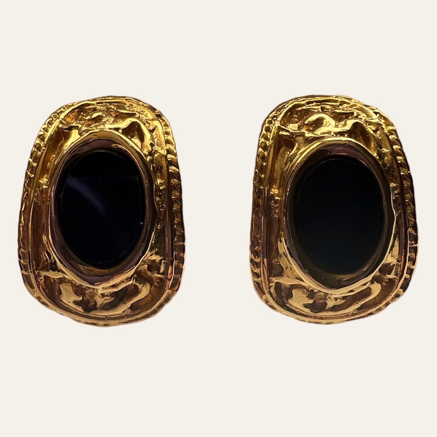Chic and Classy high quality textured gold tone clip ons with oval shaped black glass in the centre.