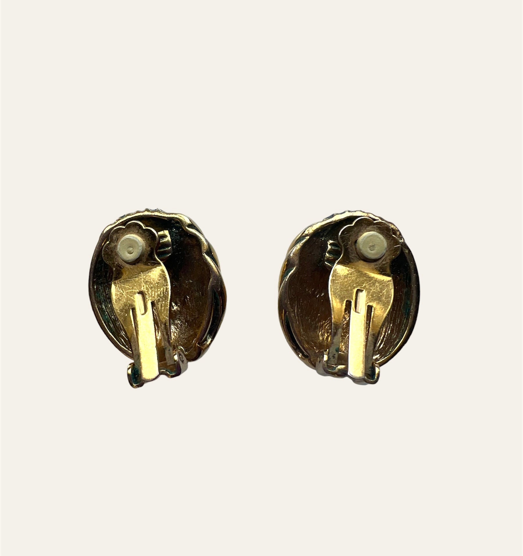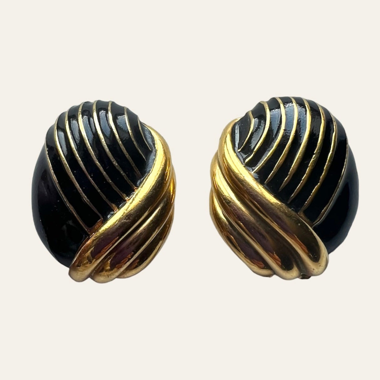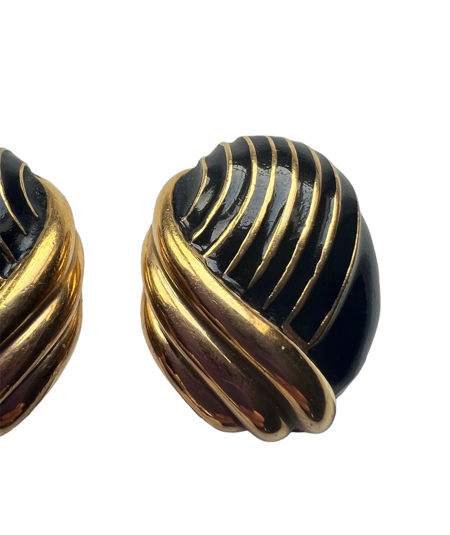 Black Enamel and Gold Tone Textured Oval Shaped Clip On Earrings