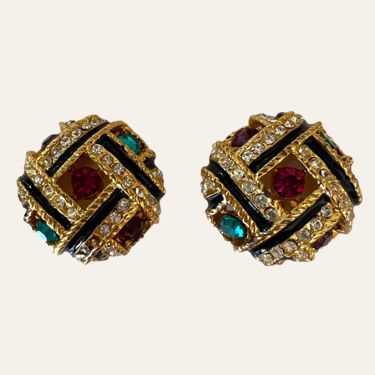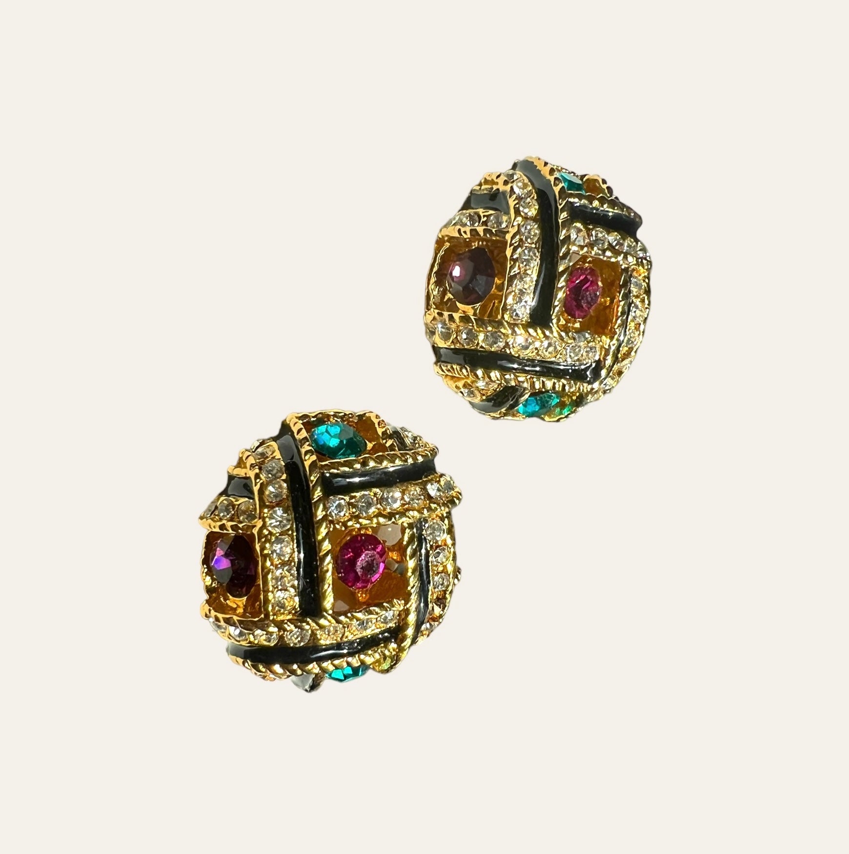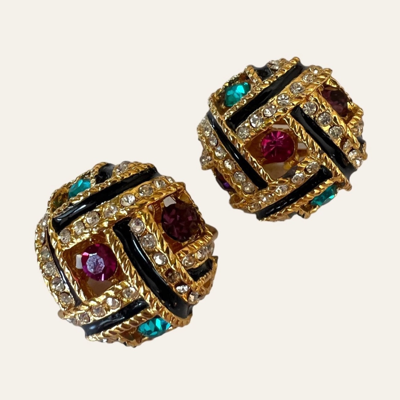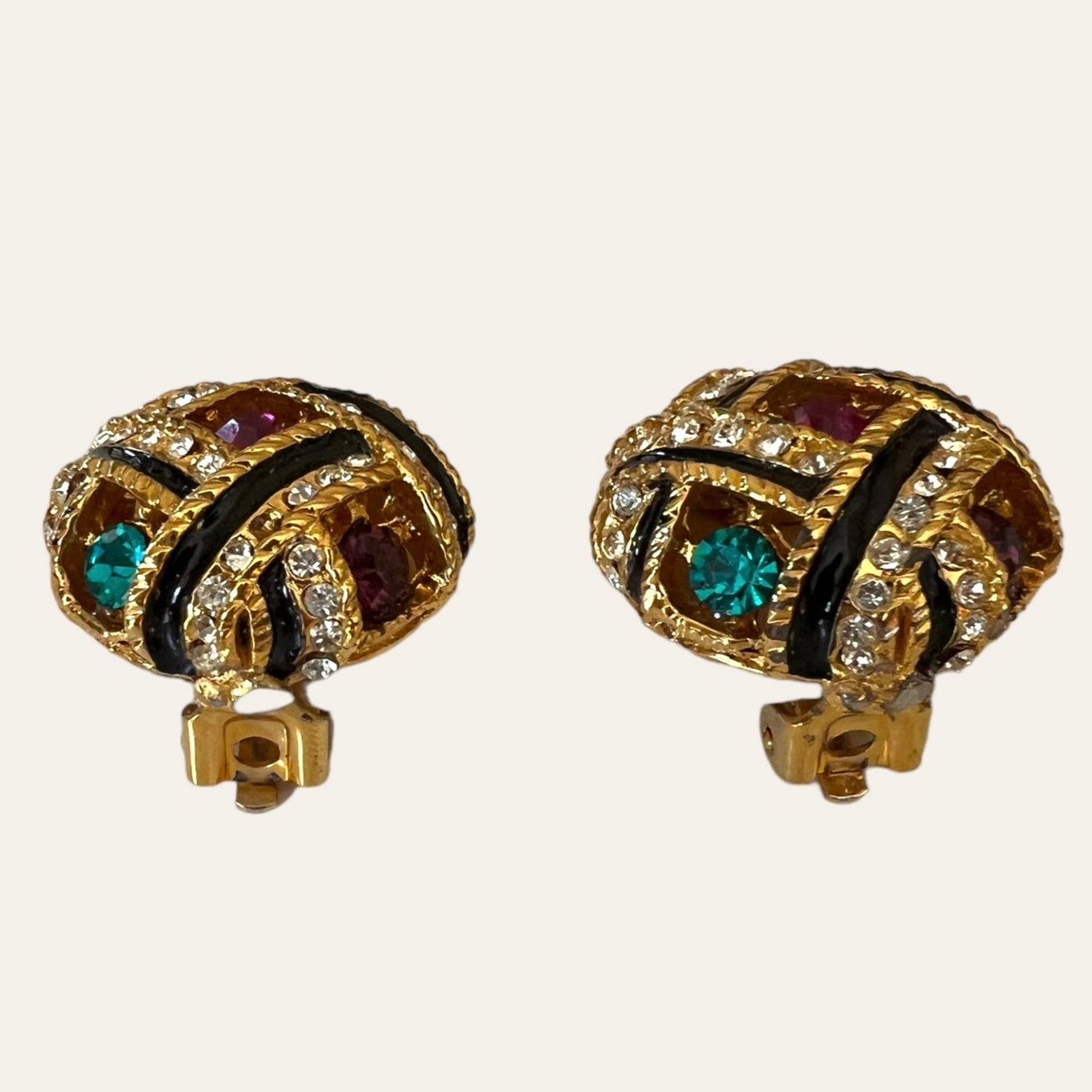 High quality gold tone earrings featuring a basket weave of black enamel and tiny clear rhinestones accented by blue and pink rhinestones. These are really dressy and so shiny!