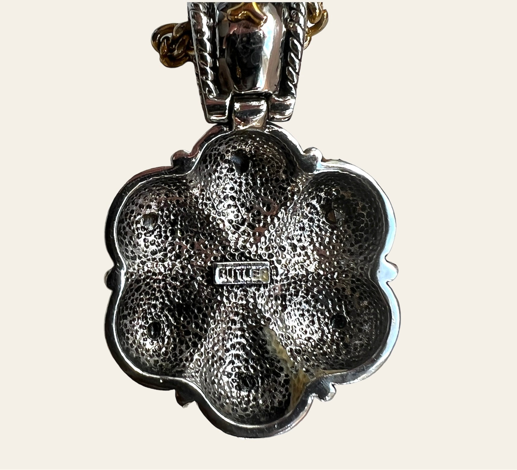 Signed "Butler" flower with with gold tone motifs and a clear rhinestone in the center.