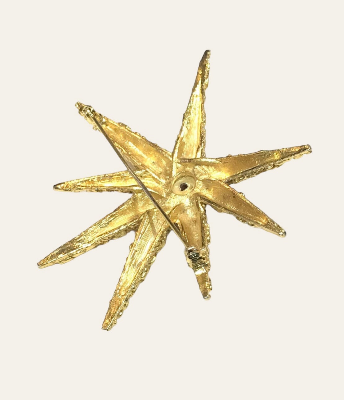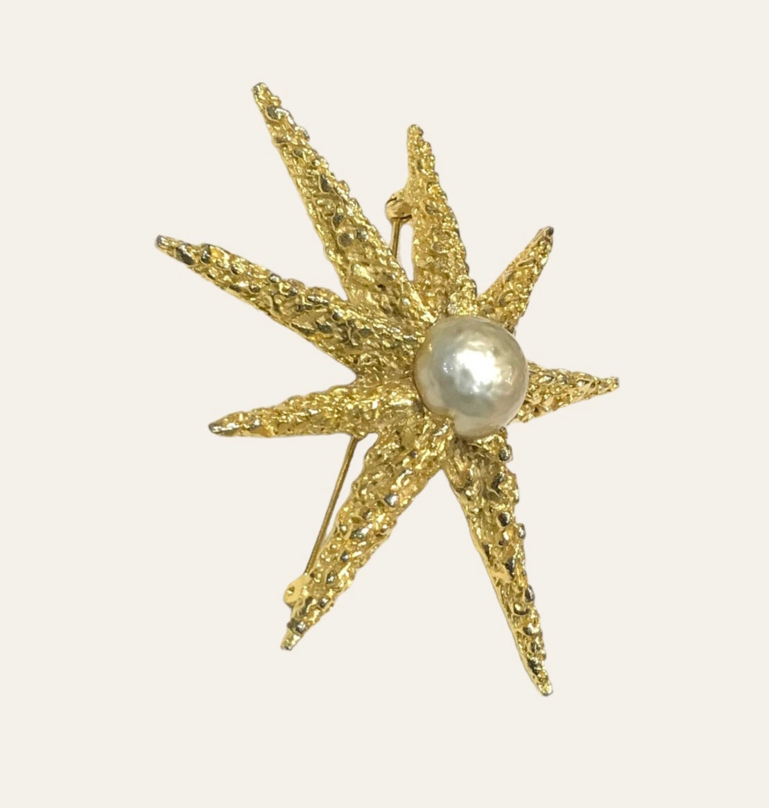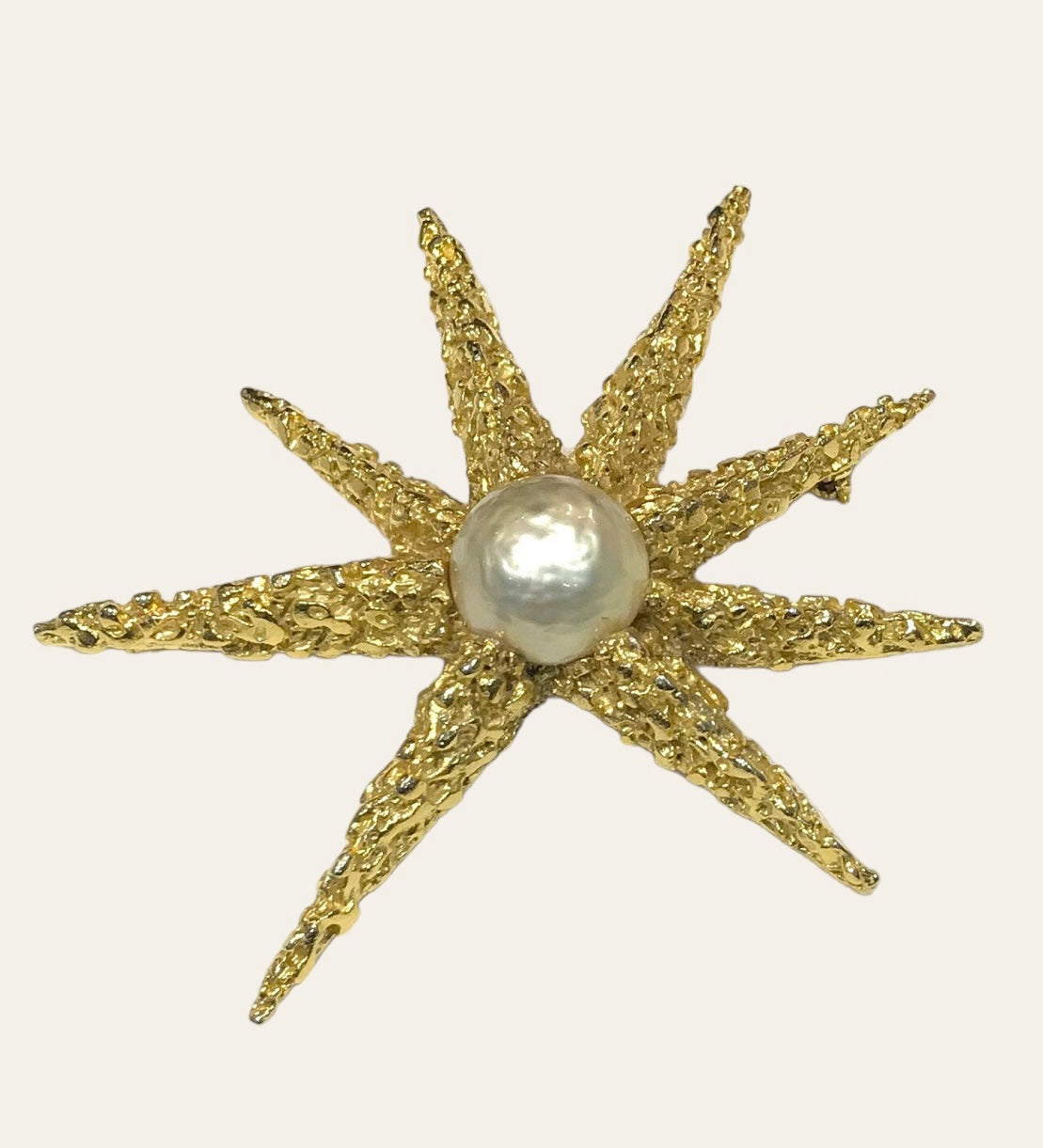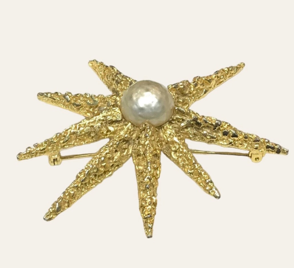 Signed Capri brooch featuring a textured gold tone star with a large baroque pearl in the centre. Stunning!