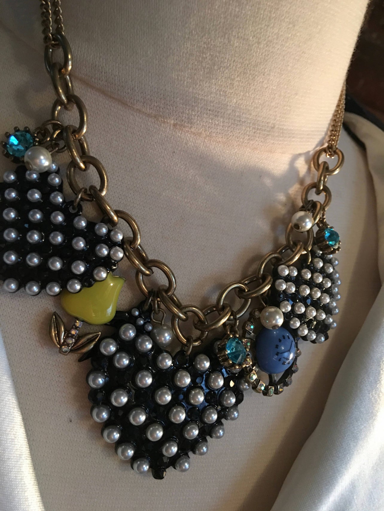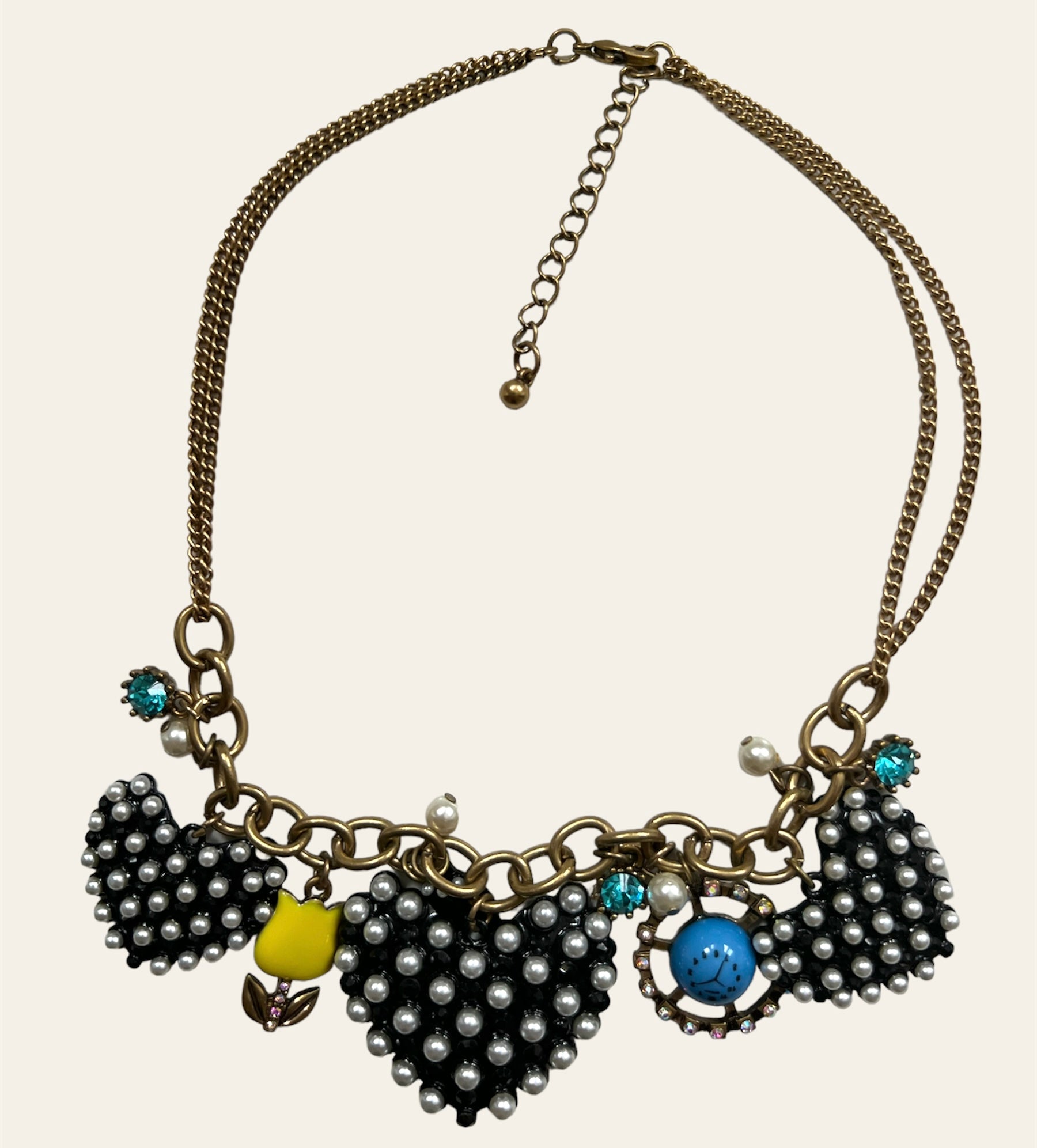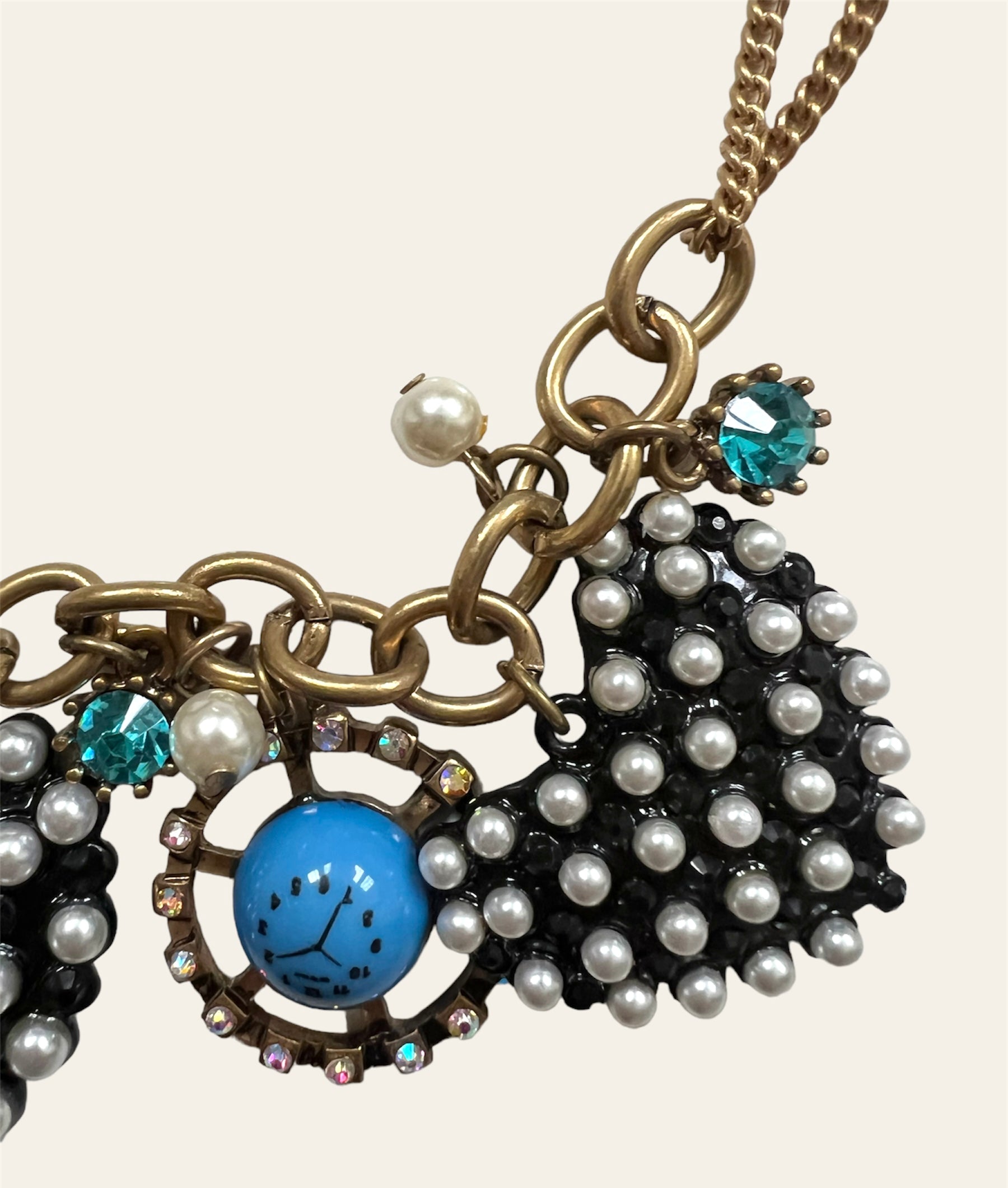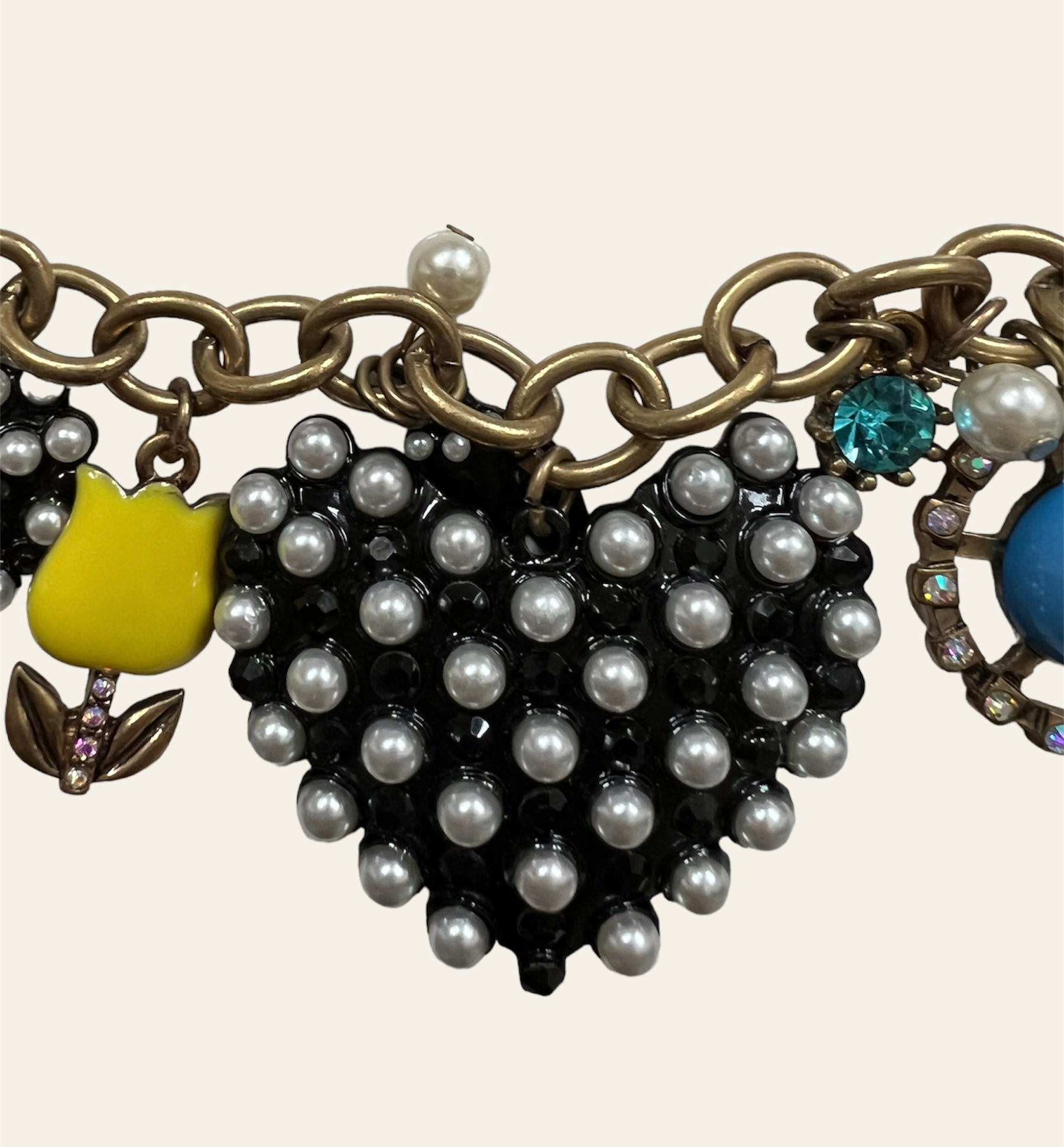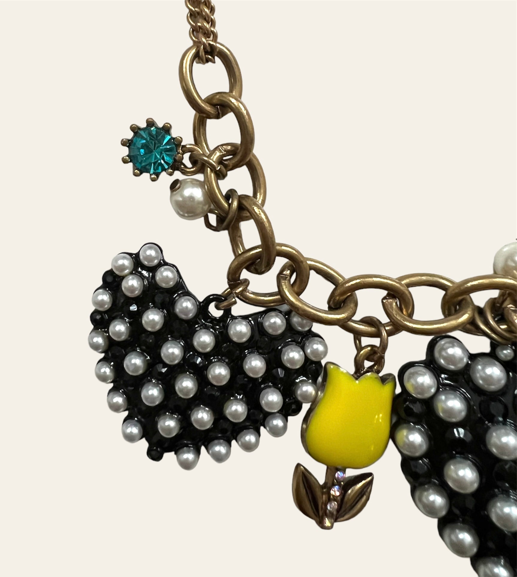 UNIQUE unsigned vintage necklace in the style of Fiorucci back in the days, with blue rhinestones, yellow tulips, black enamel huge hearts with faux pearls, and a bronze tone metal chain.