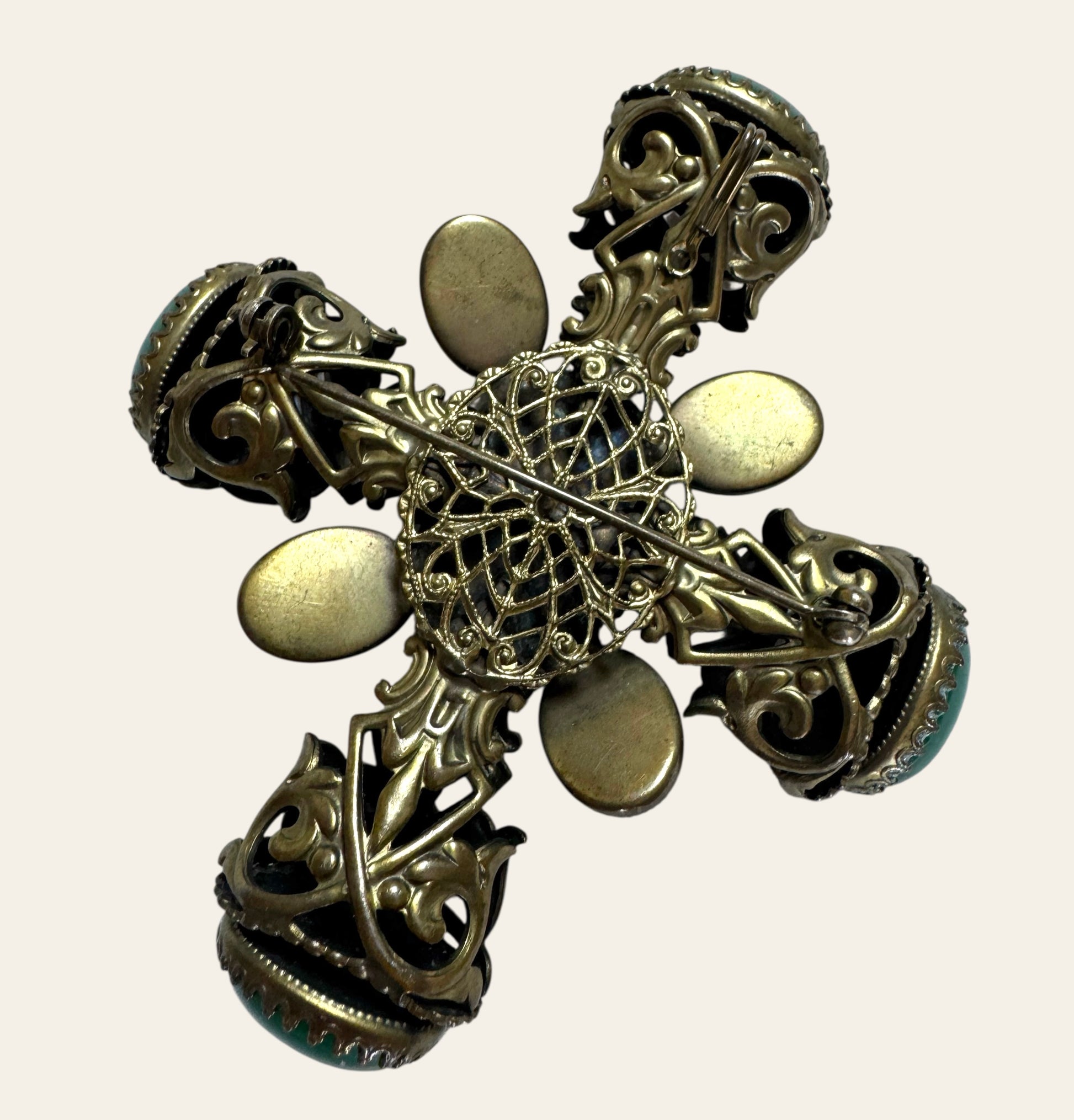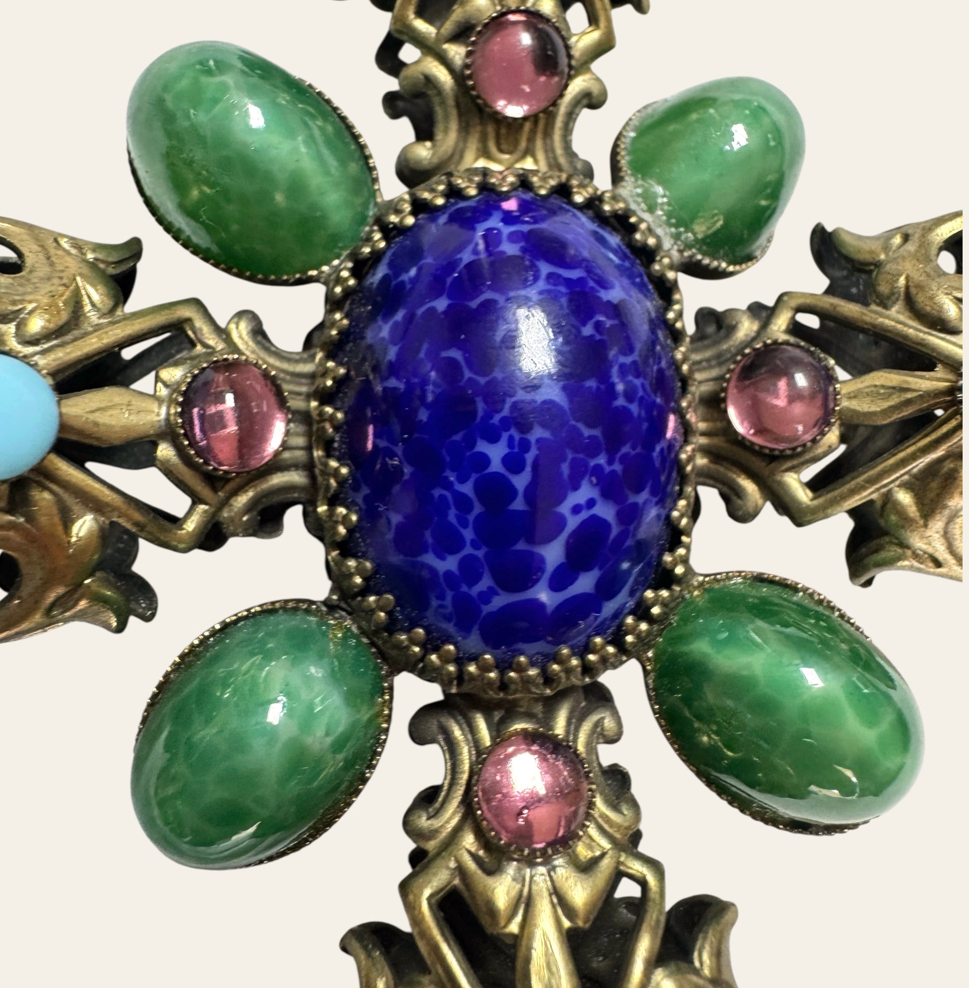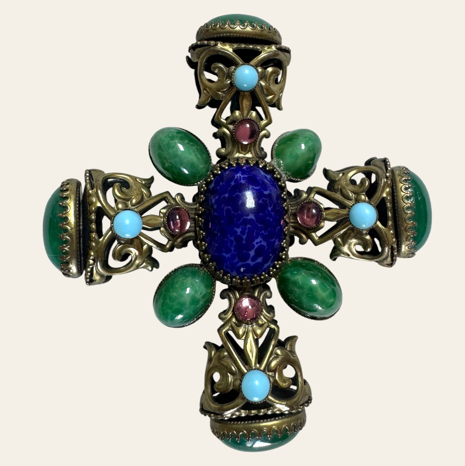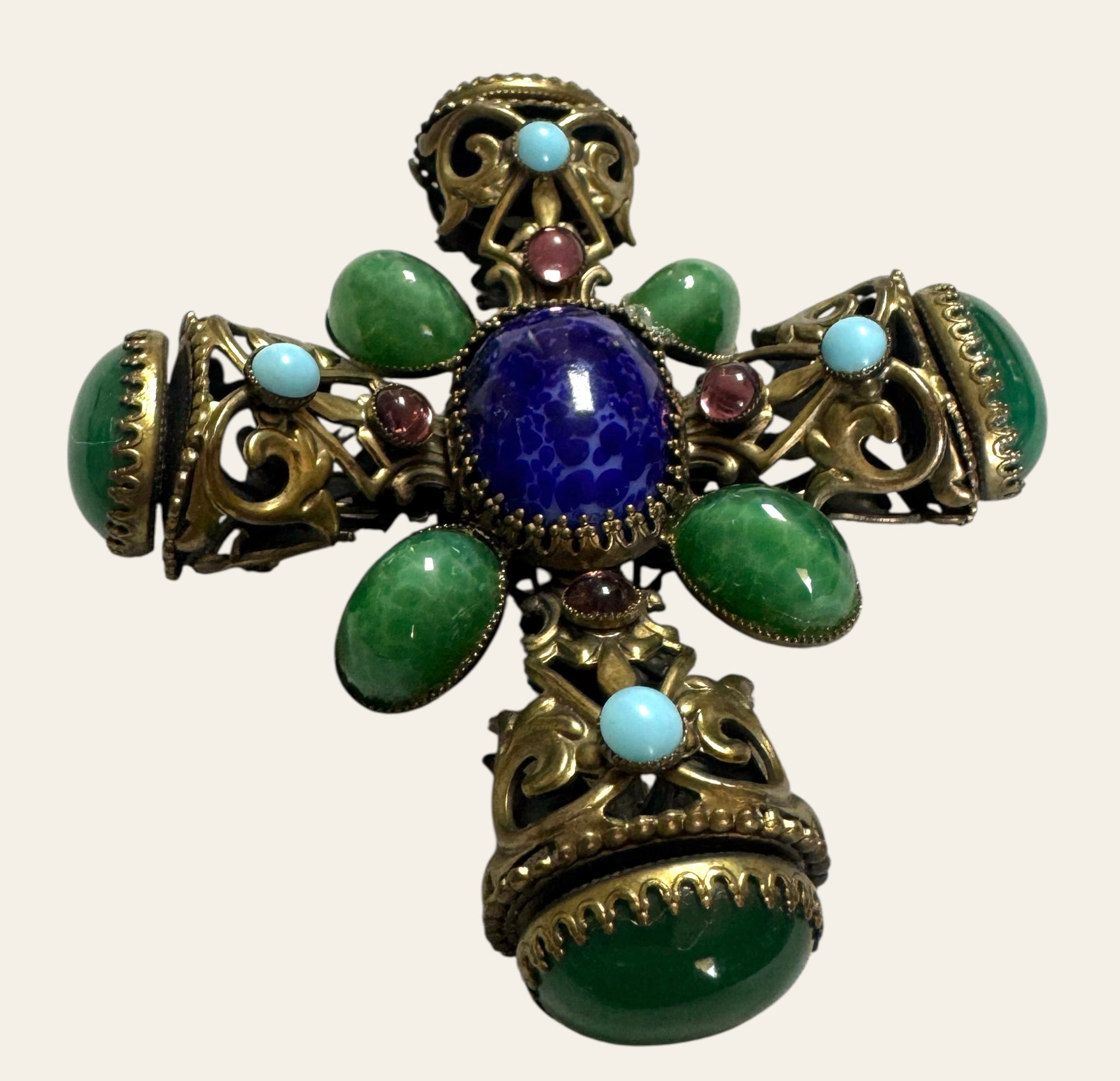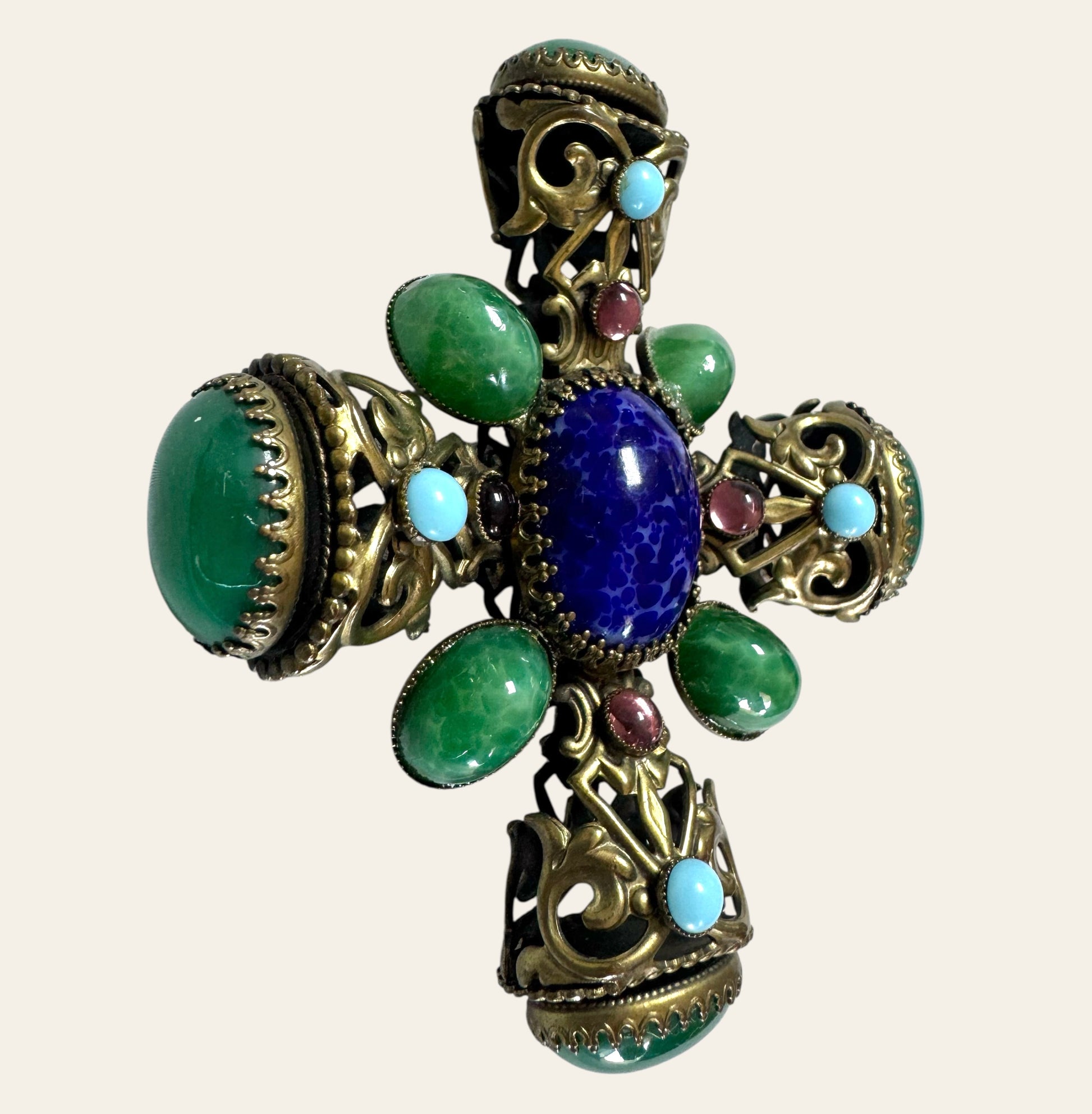 A breathtaking Byzantine-style cross brooch, opulently set with jewel-toned glass cabochons in lapis blue, jade green, garnet red, and turquoise. This piece channels ornamental grandeur with its filigree openwork and antiqued gold-tone setting, rich in historic references and maximalist elegance. At the center, a stunning deep blue faux lapis cabochon anchors the piece, flanked by oval jade-green stones, and dotted with turquoise and garnet accents, the cross pulses with sacred geometry and spiritual symmetry. The frame is an intricate composition of scrollwork, beading, and crown-like bezels, giving the piece depth and movement from every angle. Rare and collectible!