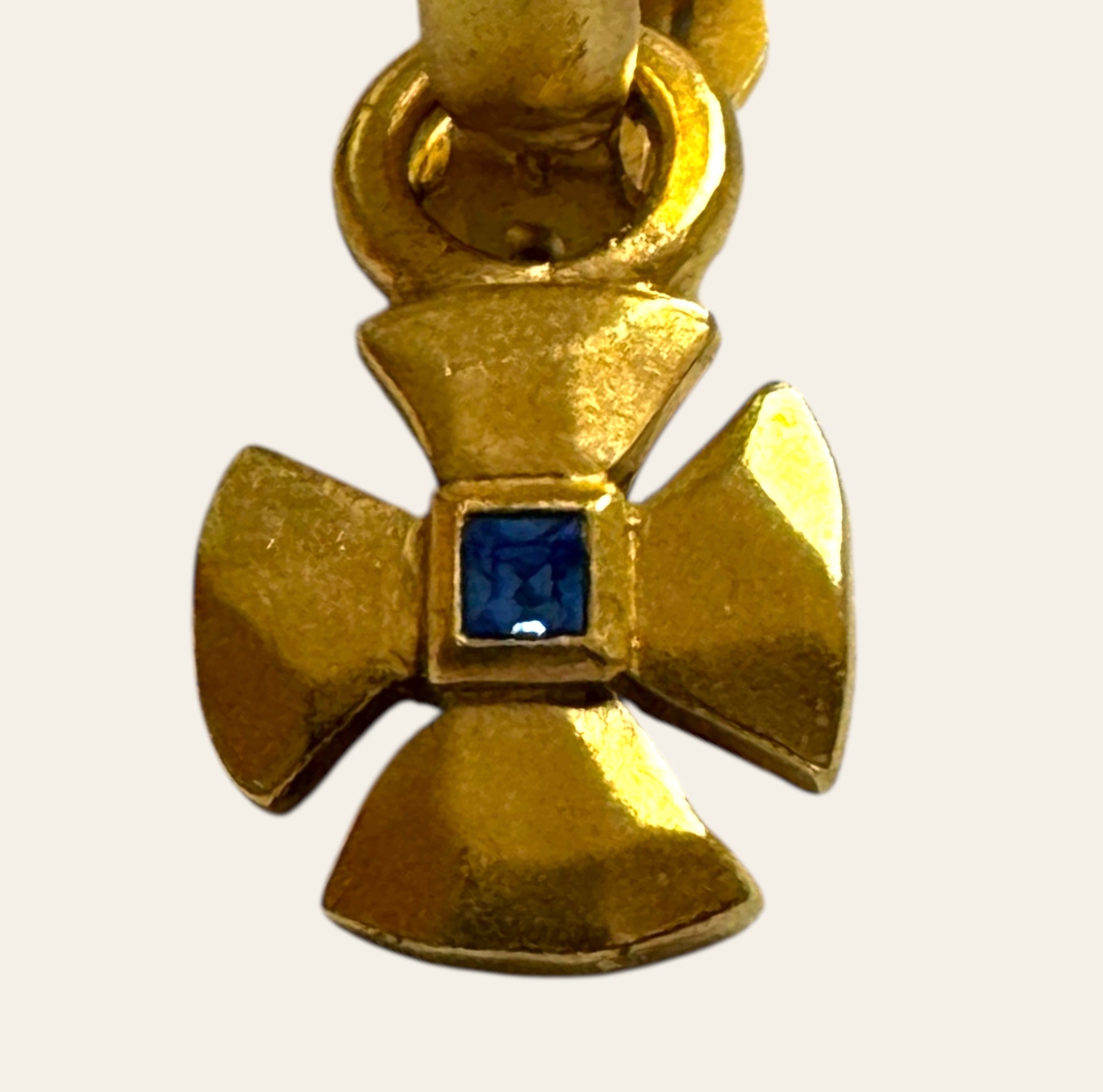 These stunning unsigned clip on earrings feature a sculptural matte gold-tone finish and a dangling Maltese cross motif adorned with square-cut blue glass stones at the center.
