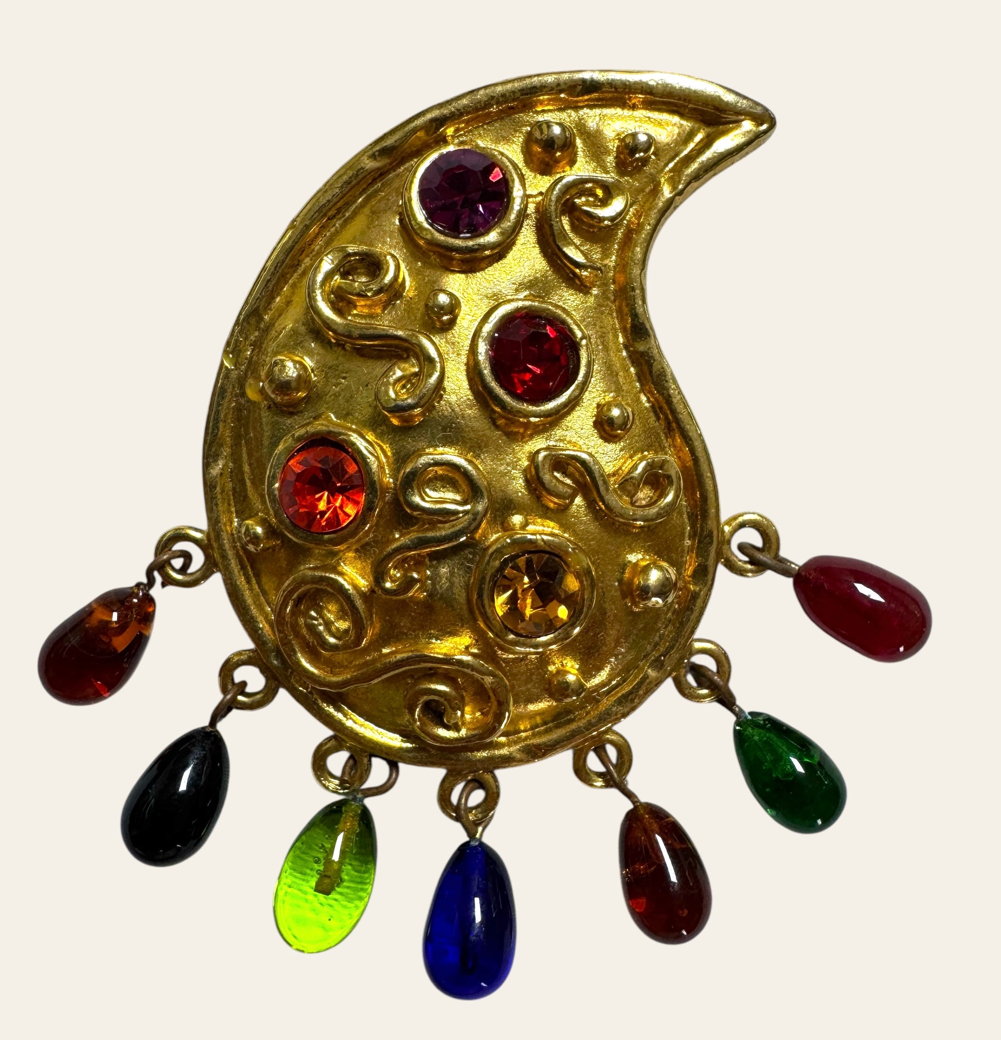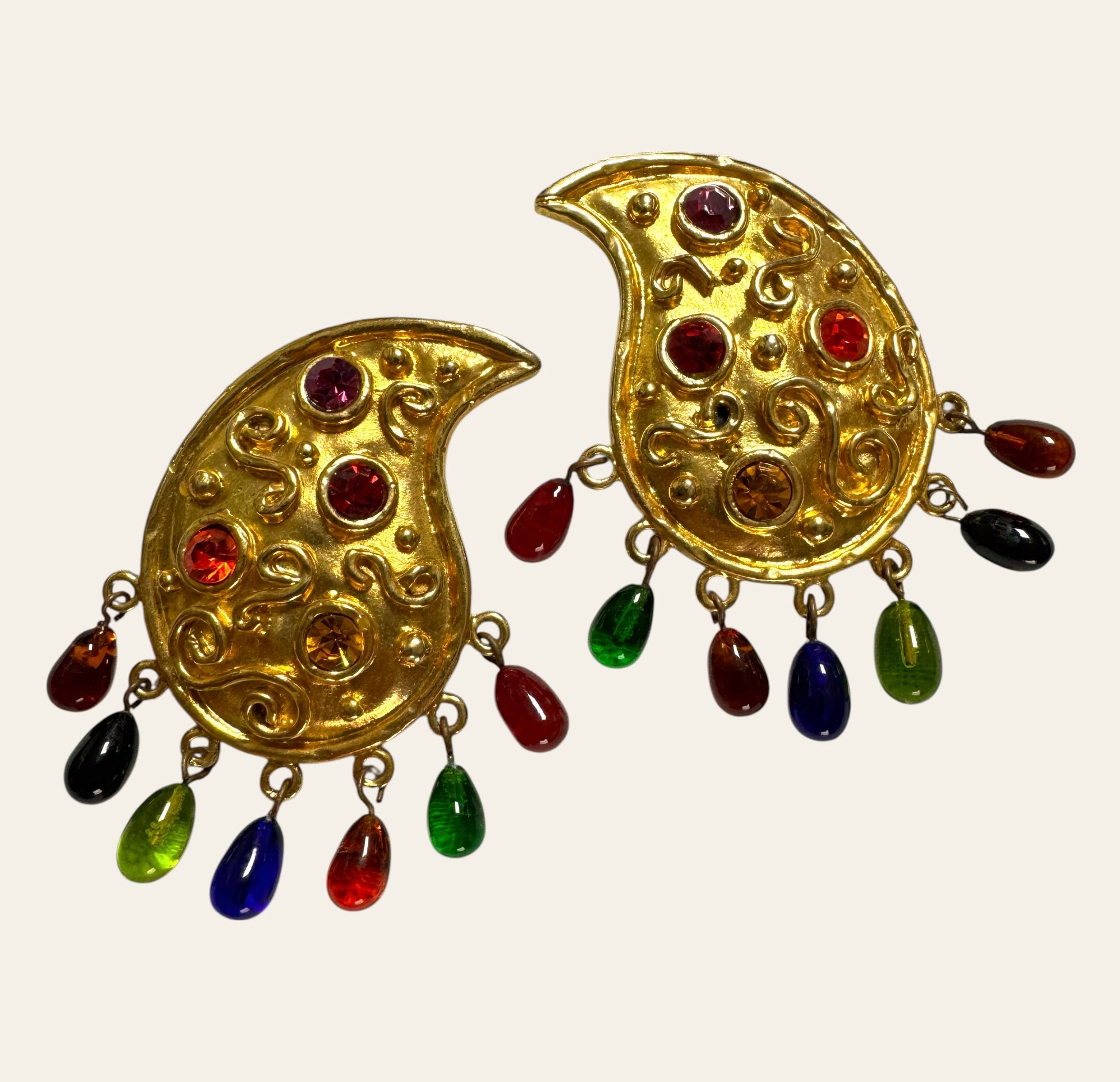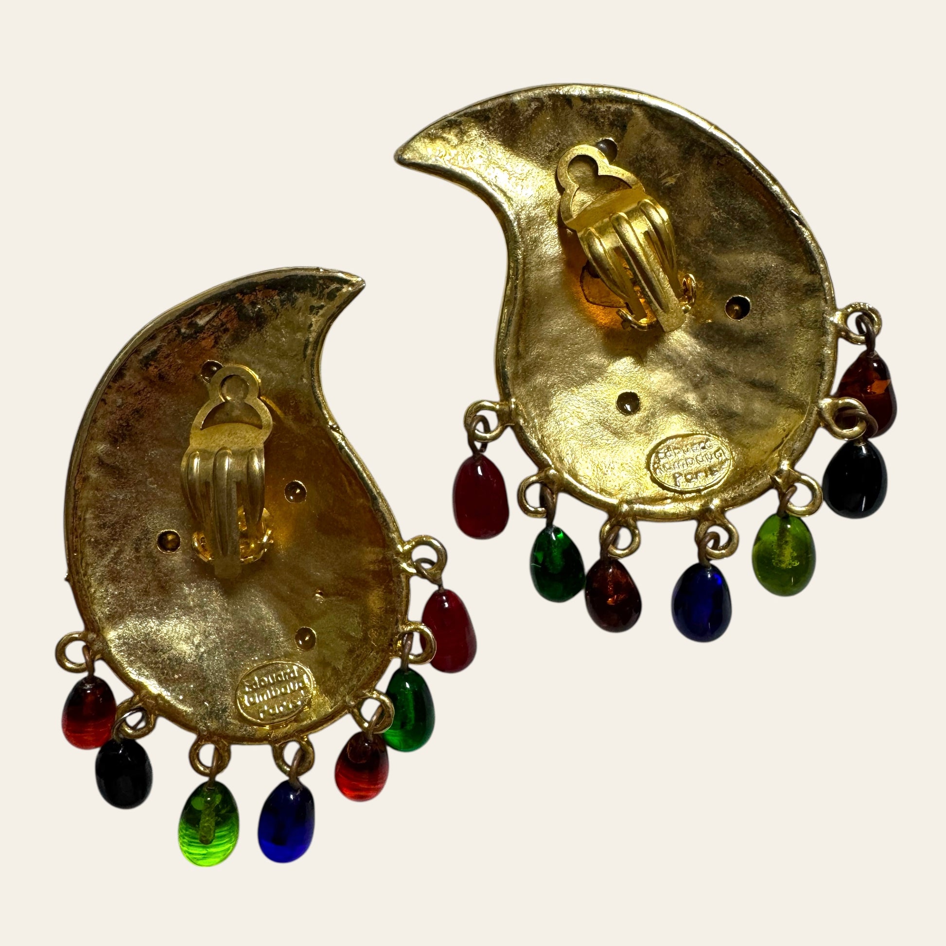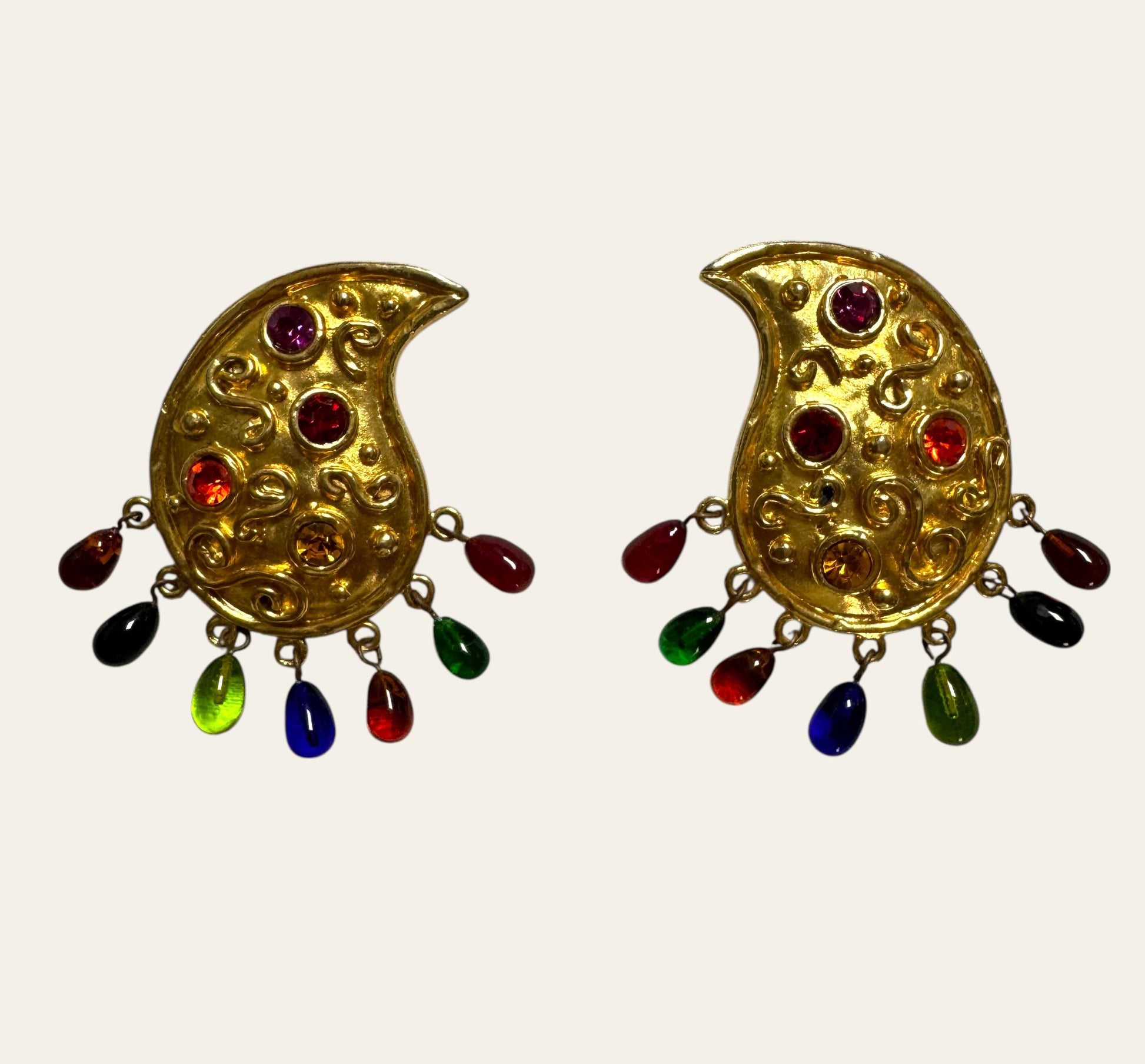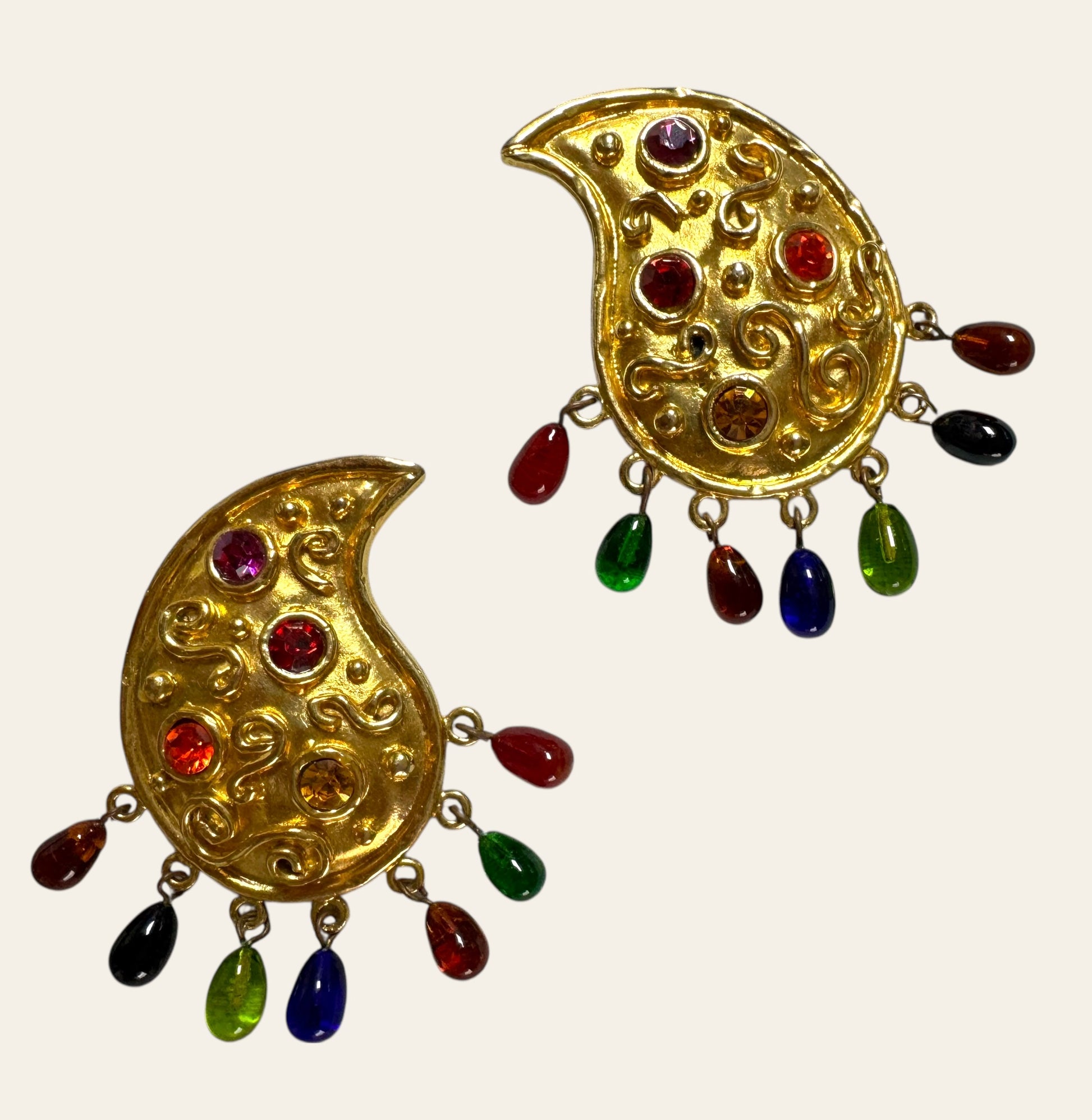 An extraordinary pair of 1980s Edouard Rambaud Paris clip on earrings, crafted in his signature baroque-glamour style. These bold paisley-shaped clips are cast in richly textured gold-tone metal and adorned with swirling relief motifs and brilliant jewel-toned cabochons in amethyst, ruby, citrine, and garnet hues.