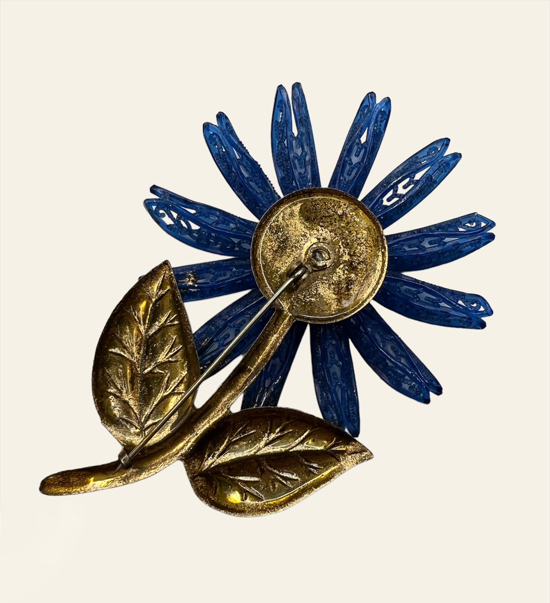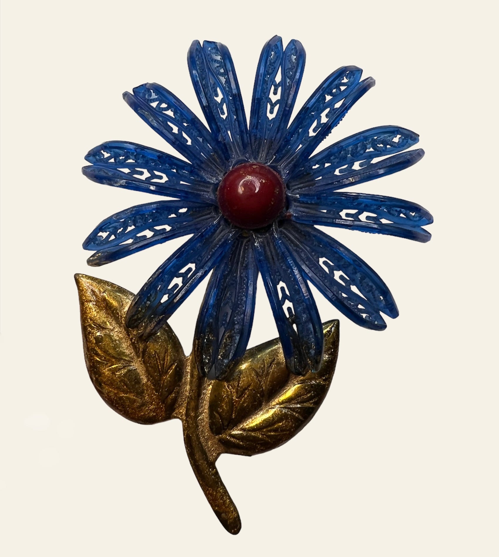 Unmarked retro large blue painted flower leaf brooch pin with red cabochon in the centre and washed gold metal petals.