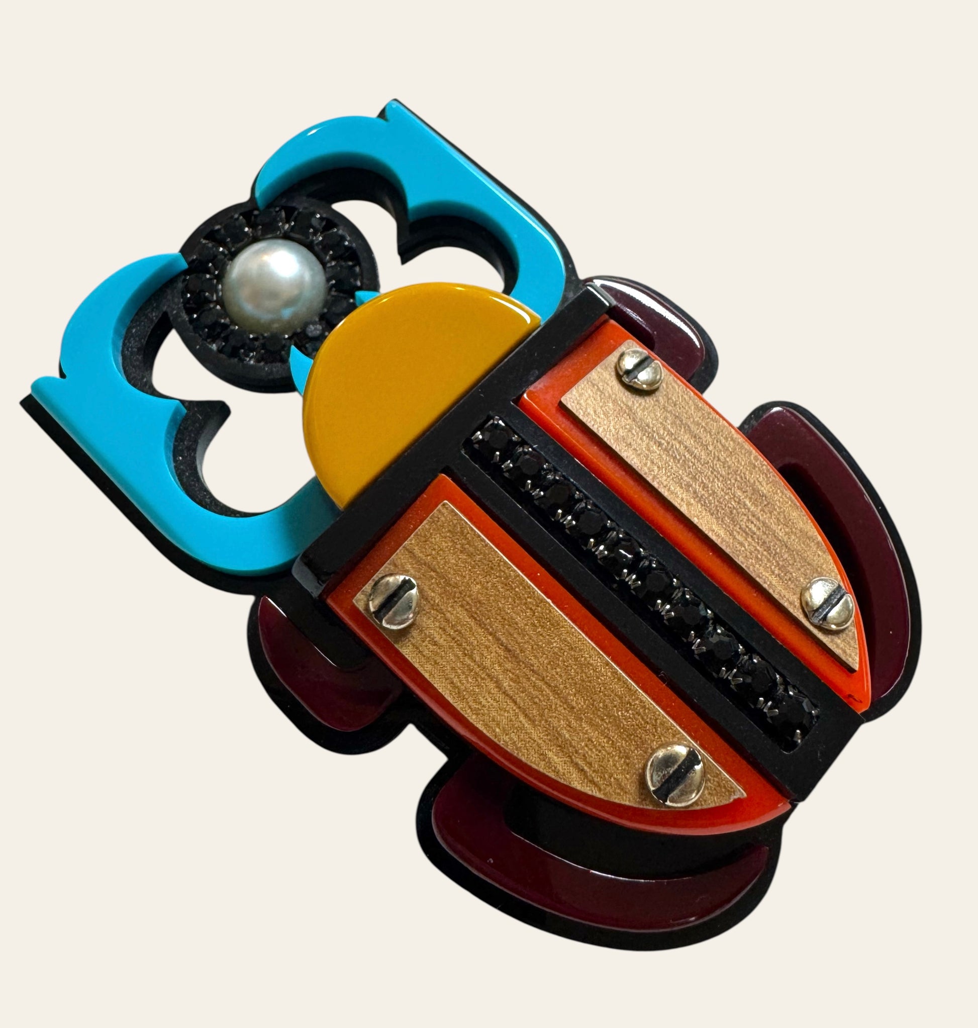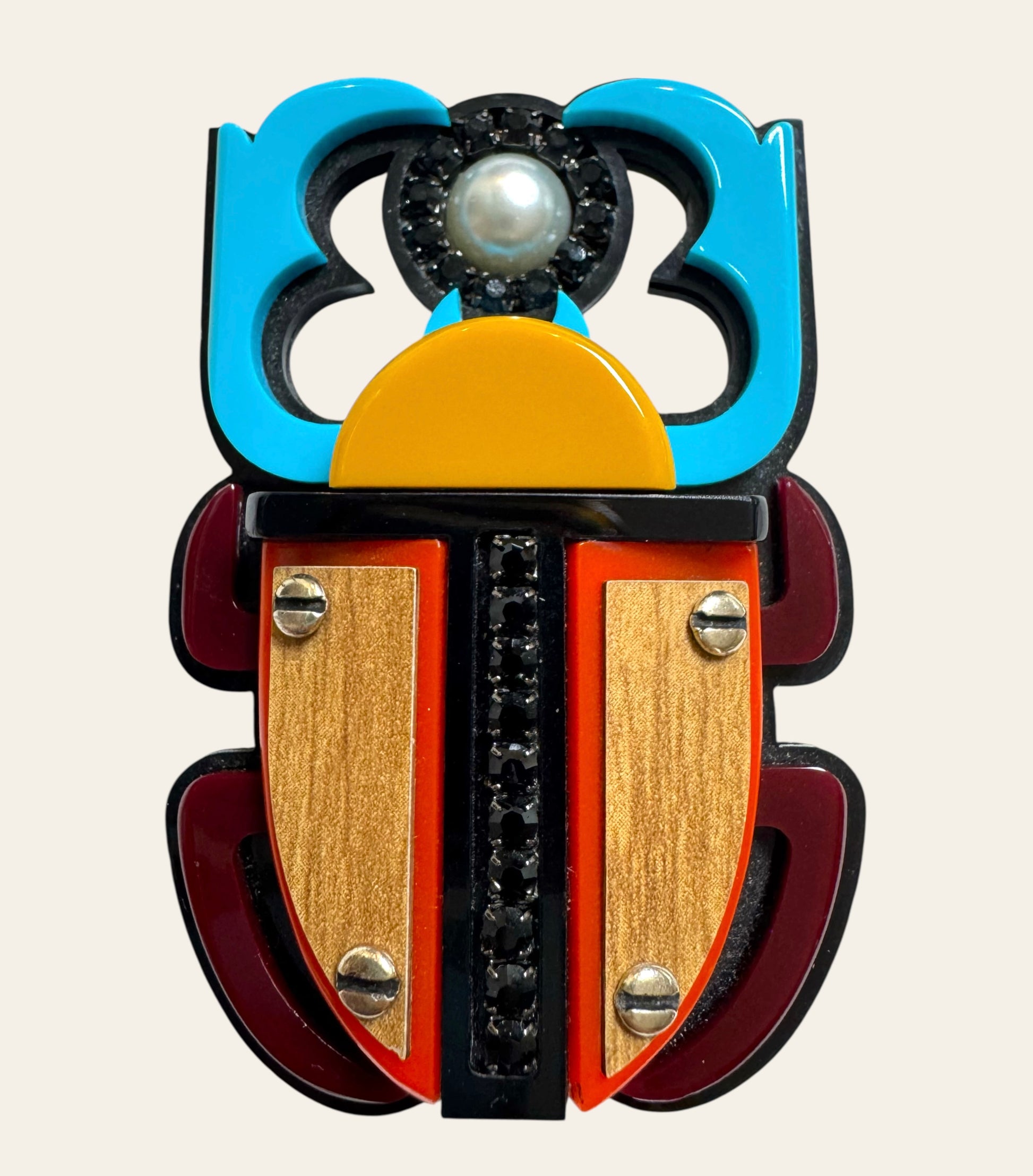 The design takes the form of a stylized scarab, an ancient symbol of rebirth and protection, here reinterpreted through modernist geometry and vibrant color. The upper section combines turquoise and black framing with a mounted pearl. The wing casings are rendered in warm wood panels outlined in red acrylic, joined by a vertical spine of black faceted stones. The sculptural layering creates depth, while the polished surfaces emphasize light and contrast.