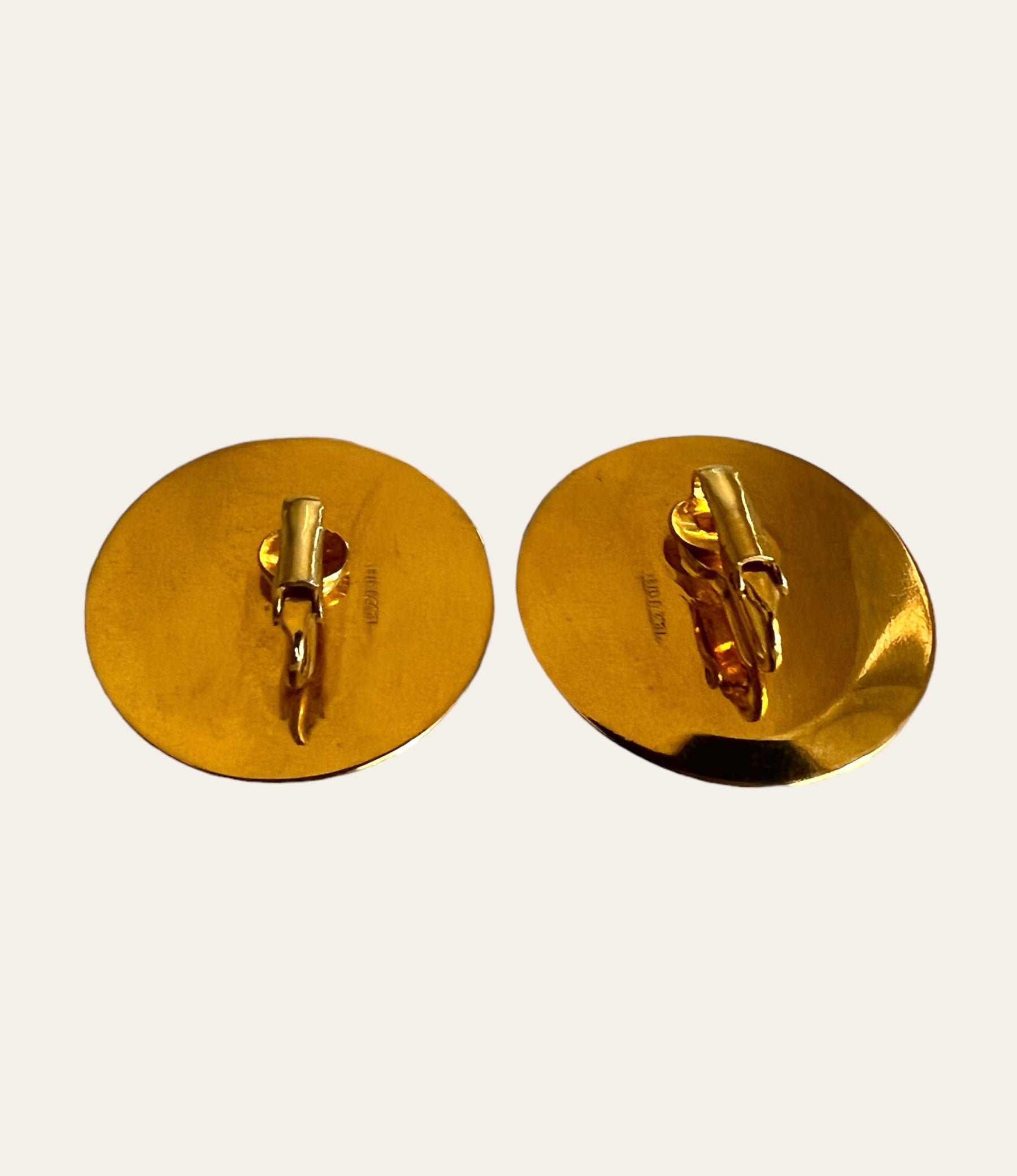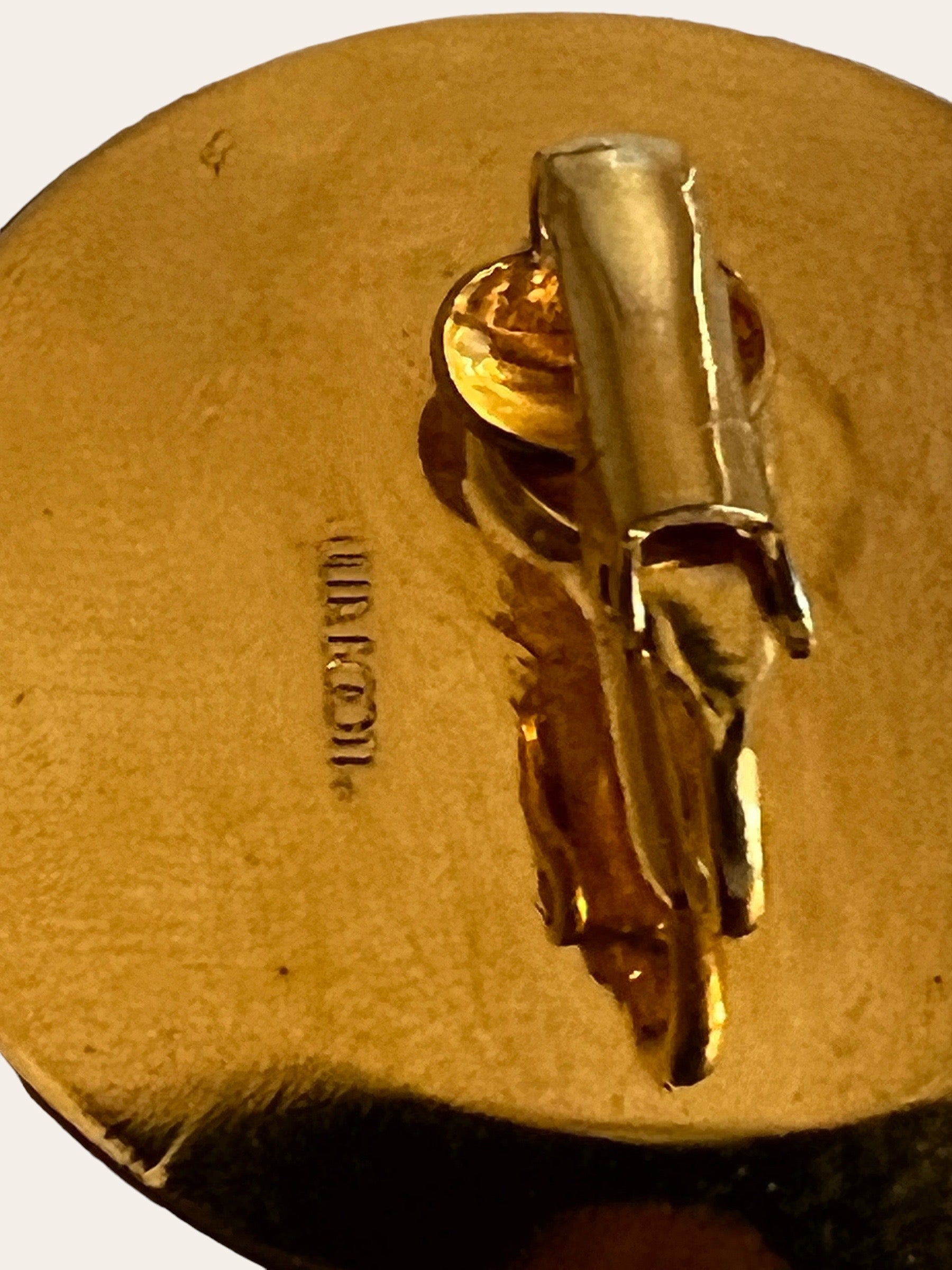 These beauties have a gold-plated circular base topped with a high-sheen black onyx flat cabochon. Tulla Booth jewelry is relatively rare and is highly regarded for its artistic excellence. These are high quality earrings. Pictures don't do justice to how beautiful they are.
