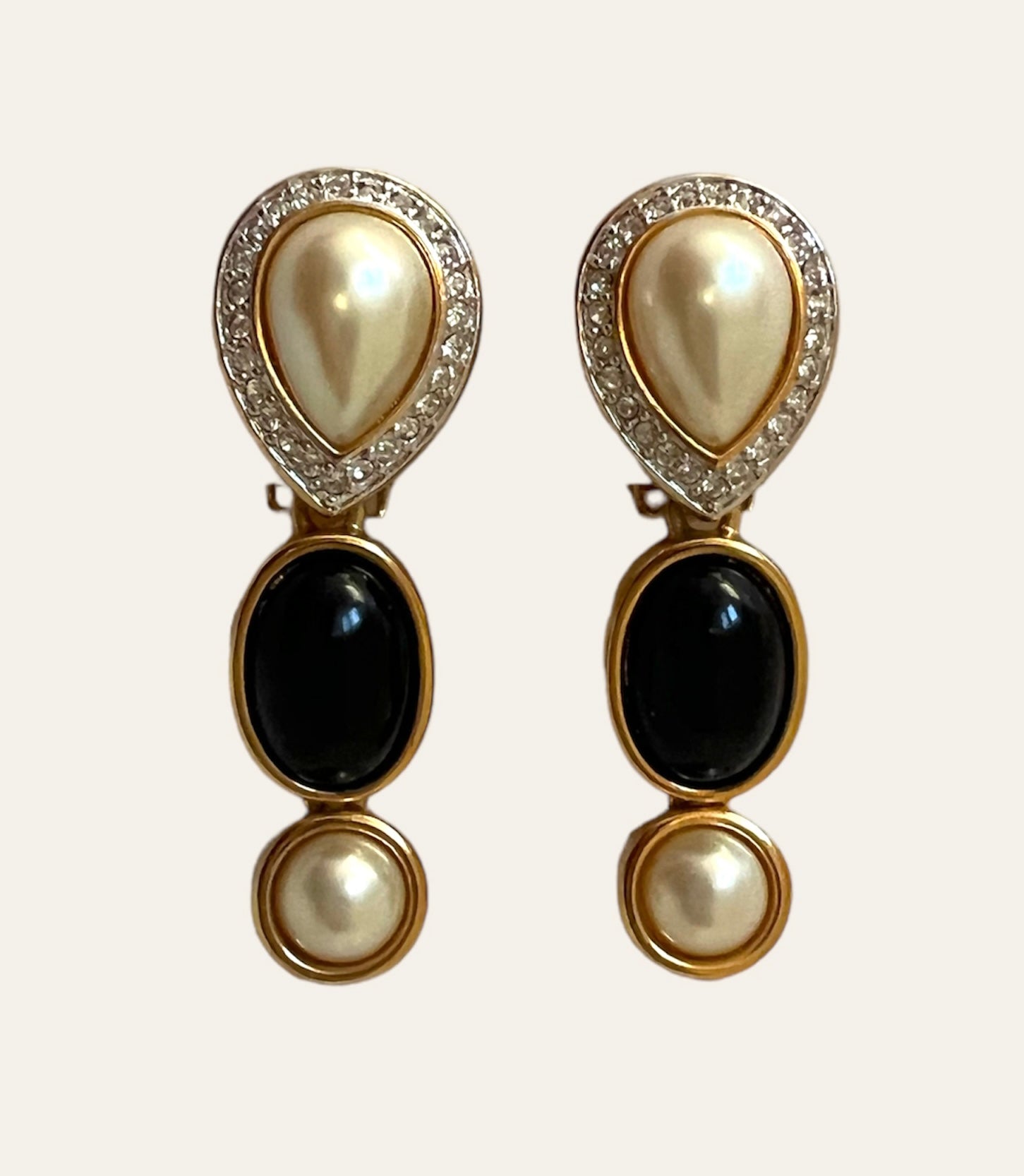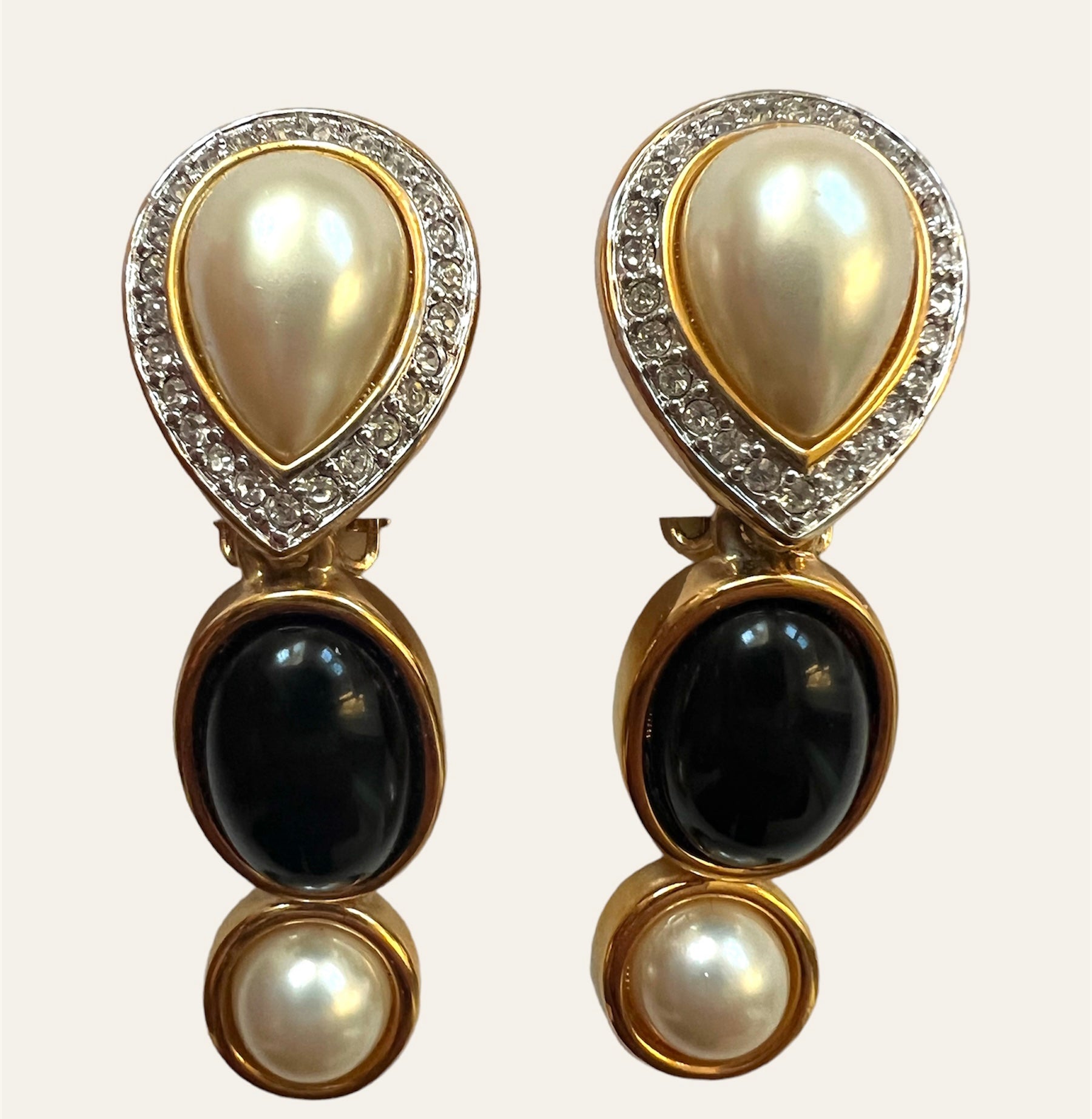 Vintage NOS gold tone faux pearl clip on earrings with black cabochons and clear rhinestones. These are amazing for any event. They are so delicate, feminine, and look expensive!