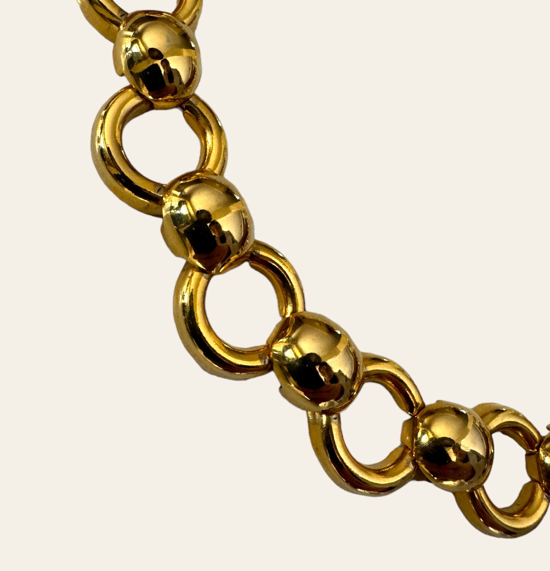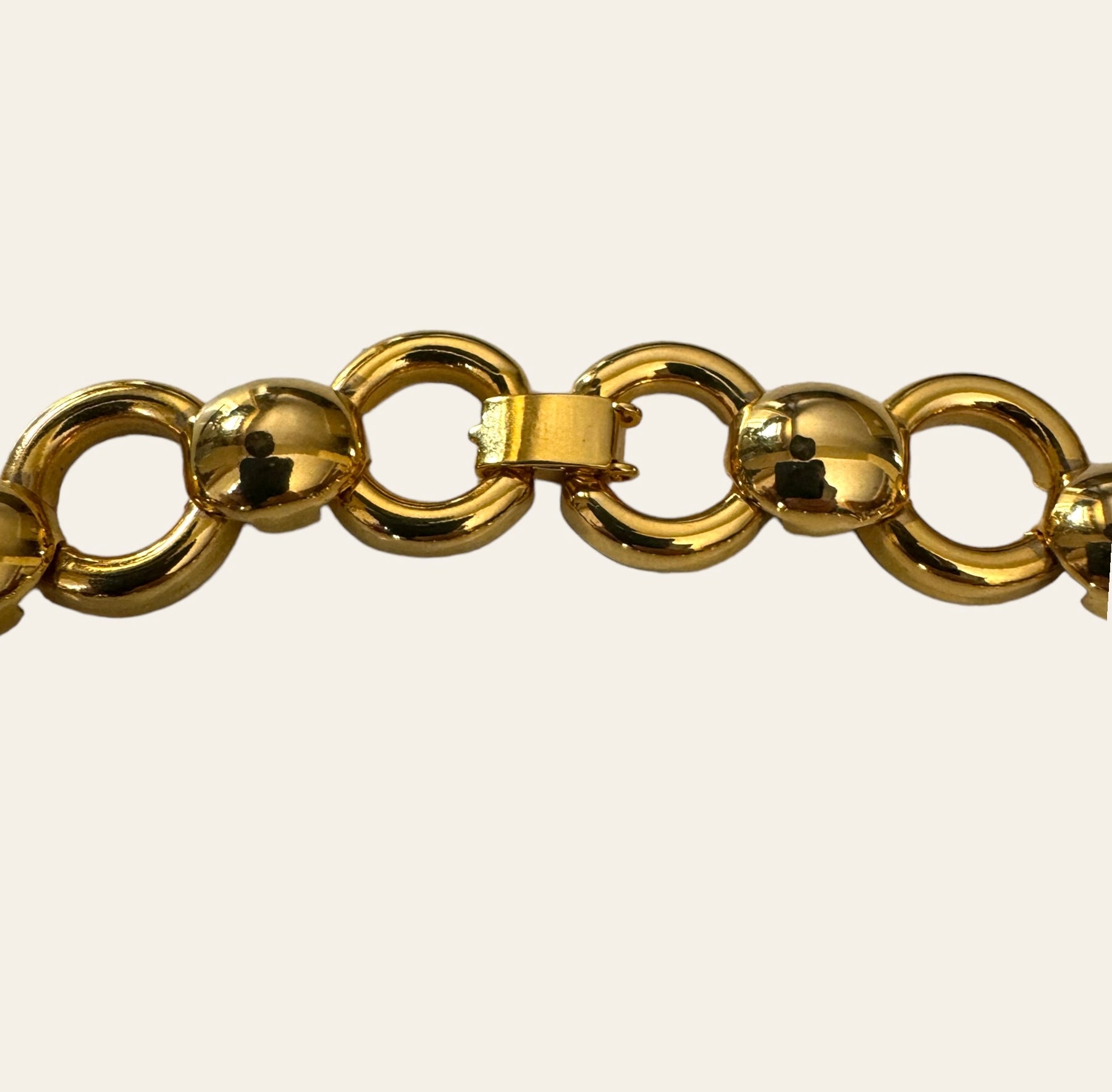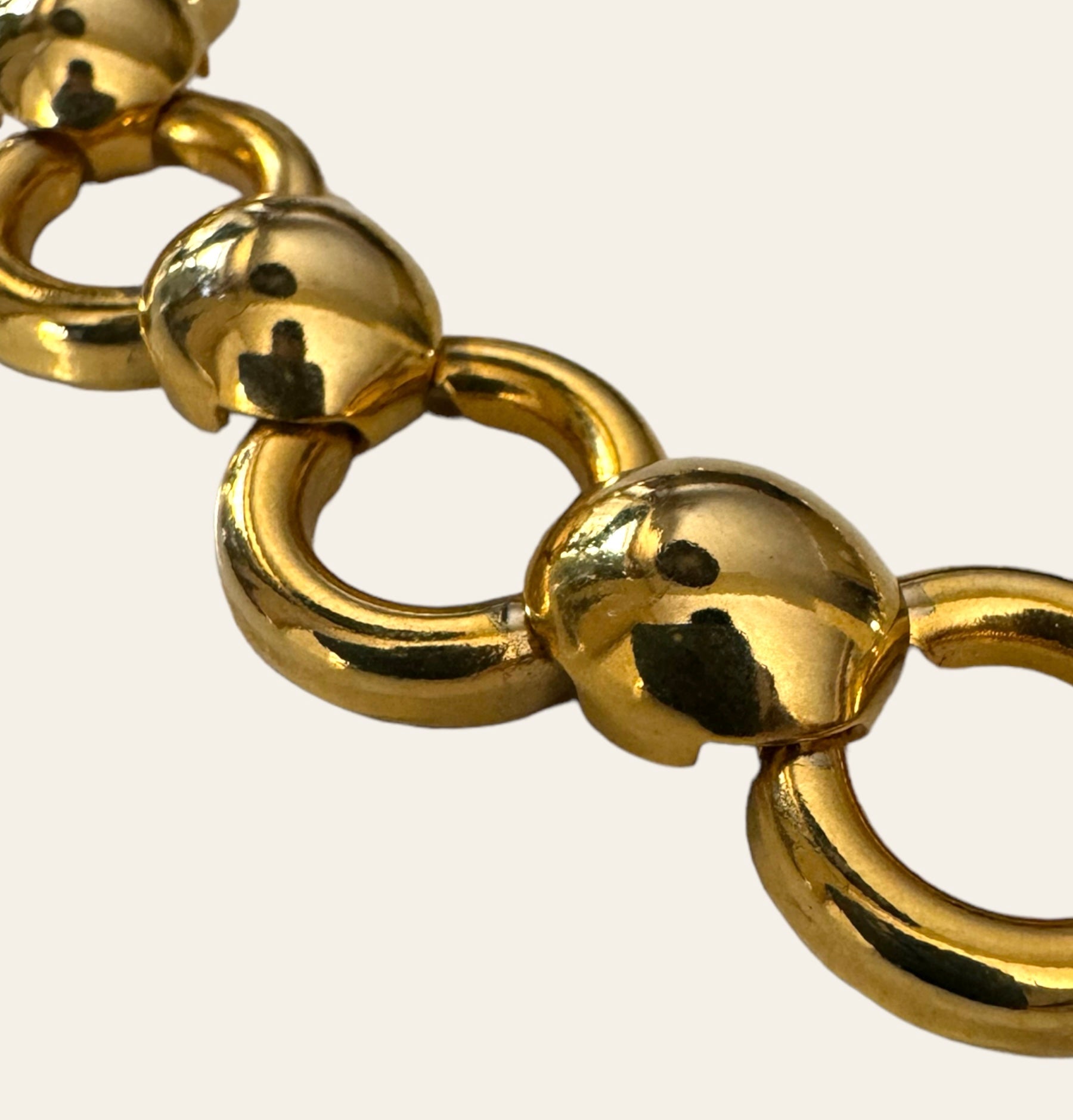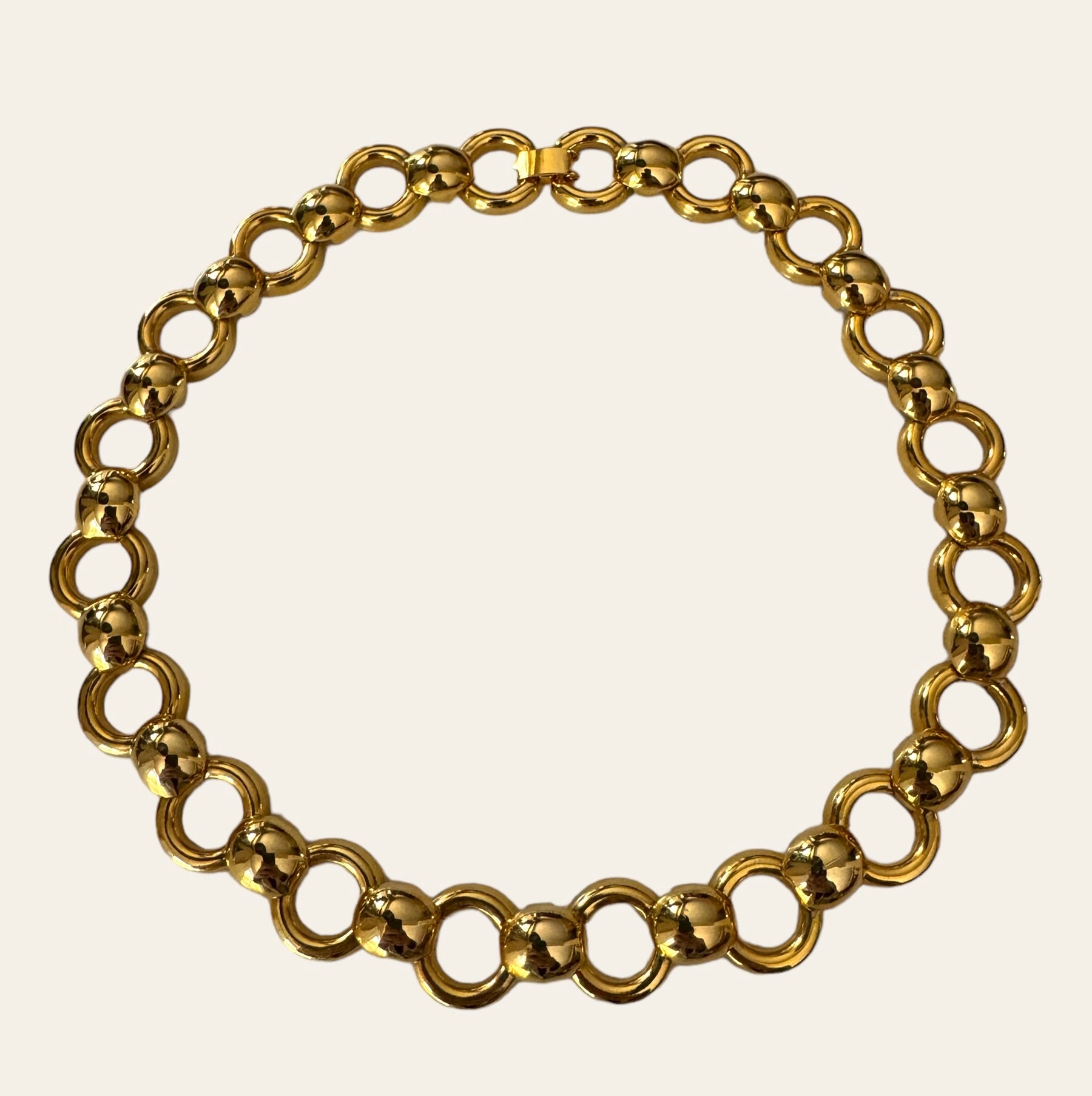 Stunning unsigned necklace in a rich shiny gold tone featuring circular links all over with the look of fine jewellry. This necklace will enrich your look.