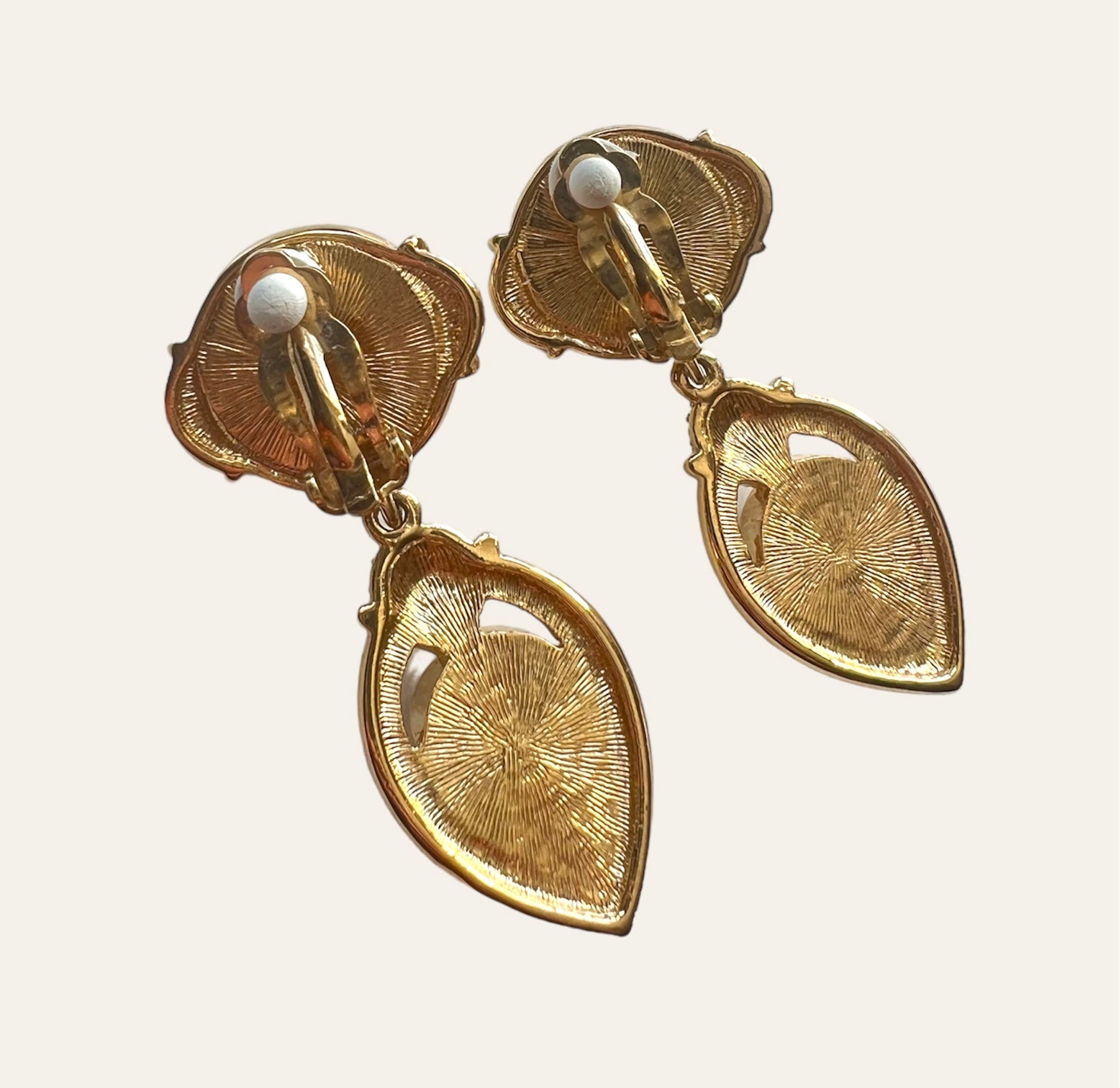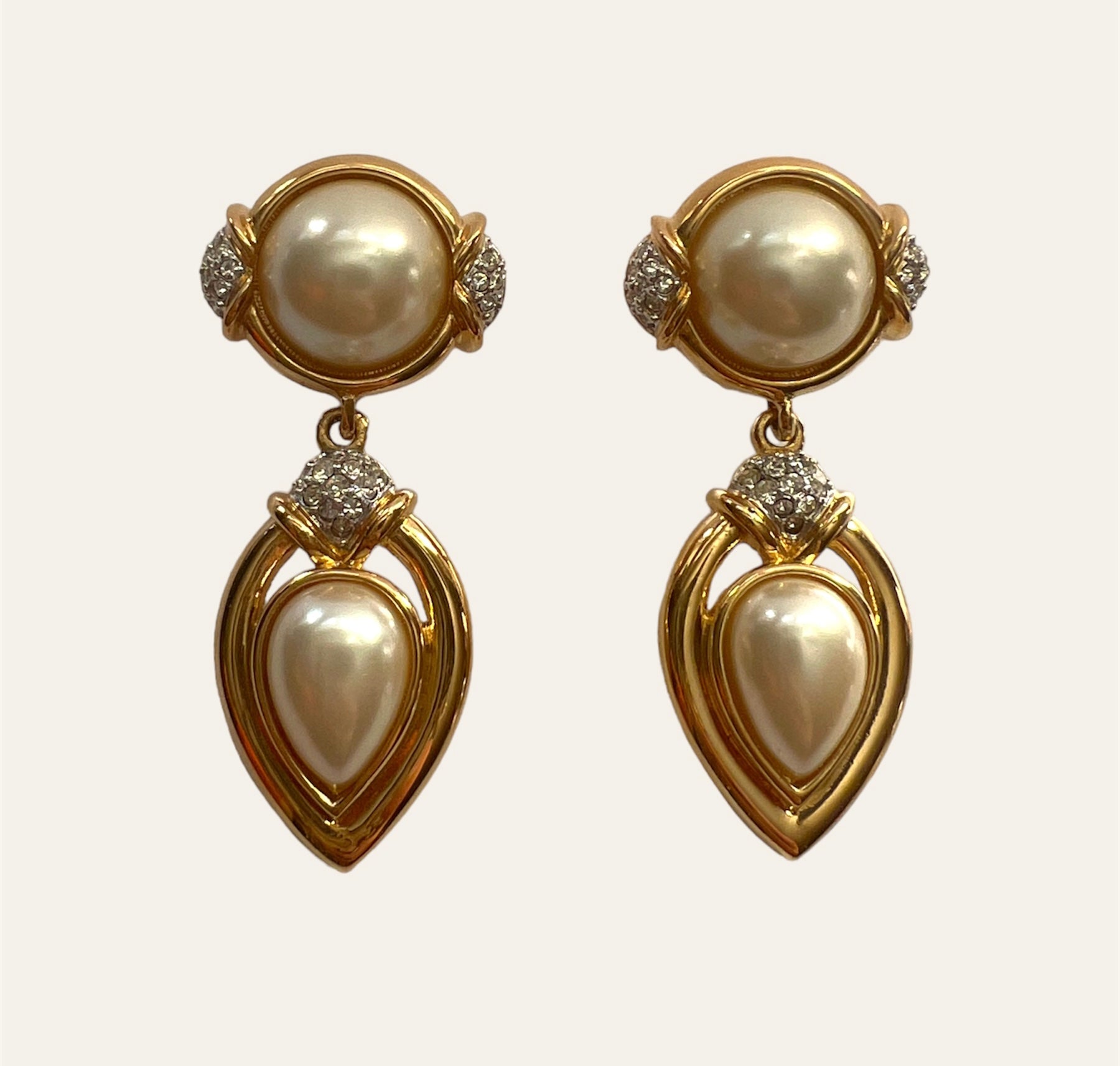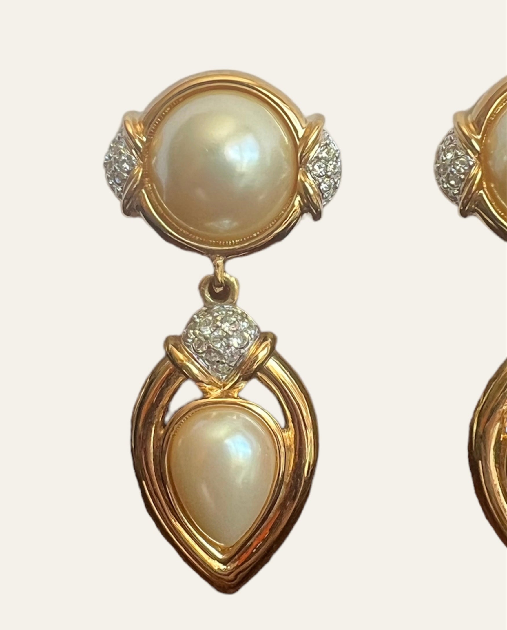 Chic gold tone dangle earrings with faux pearls with rhinestones. They are so elegant! They are not heavy and they clip ons hold strong.