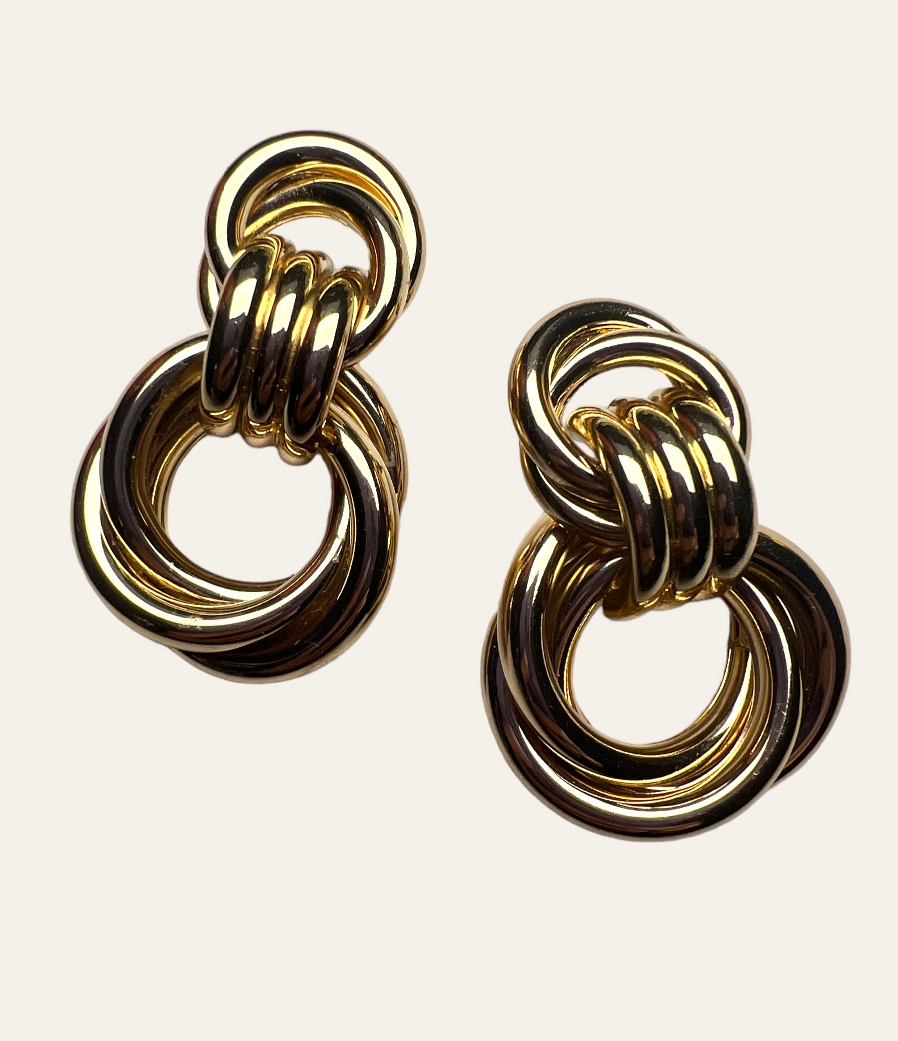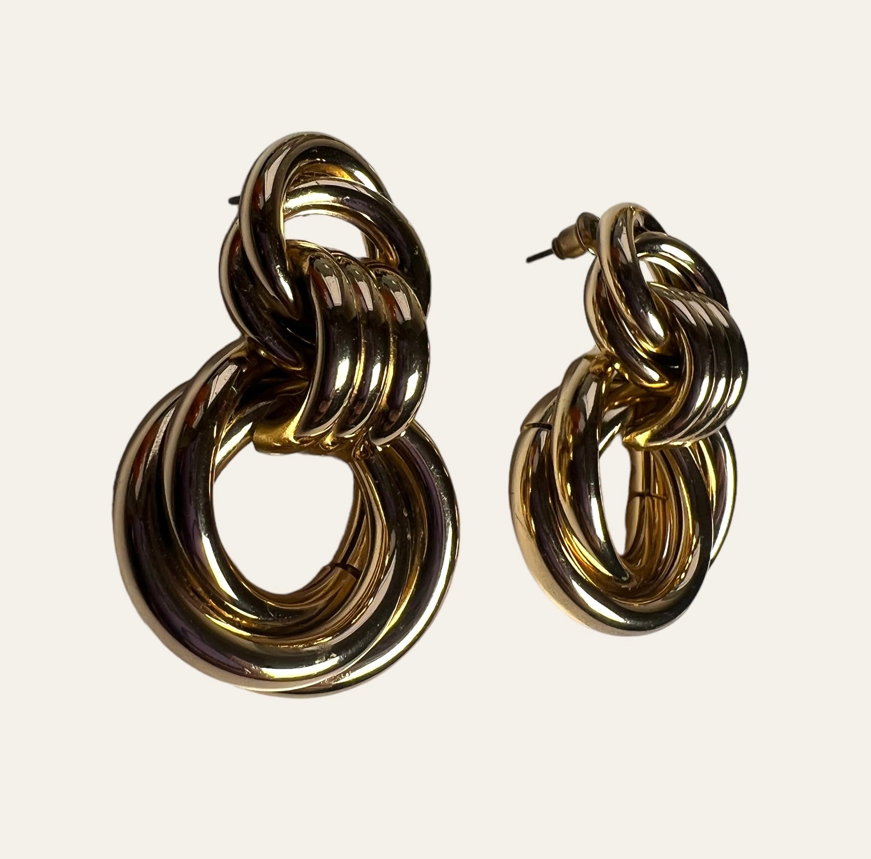 Timeless twisted double hoop chunky earrings in a shiny gold tone.