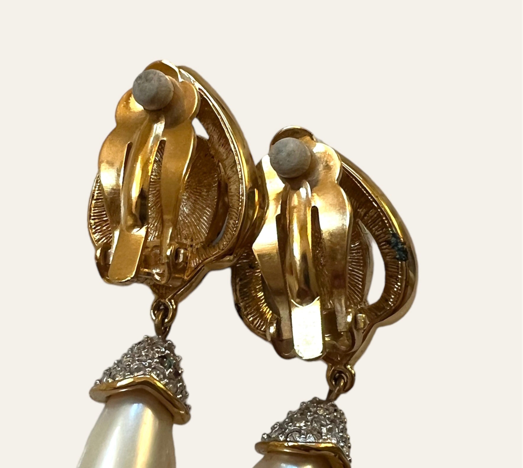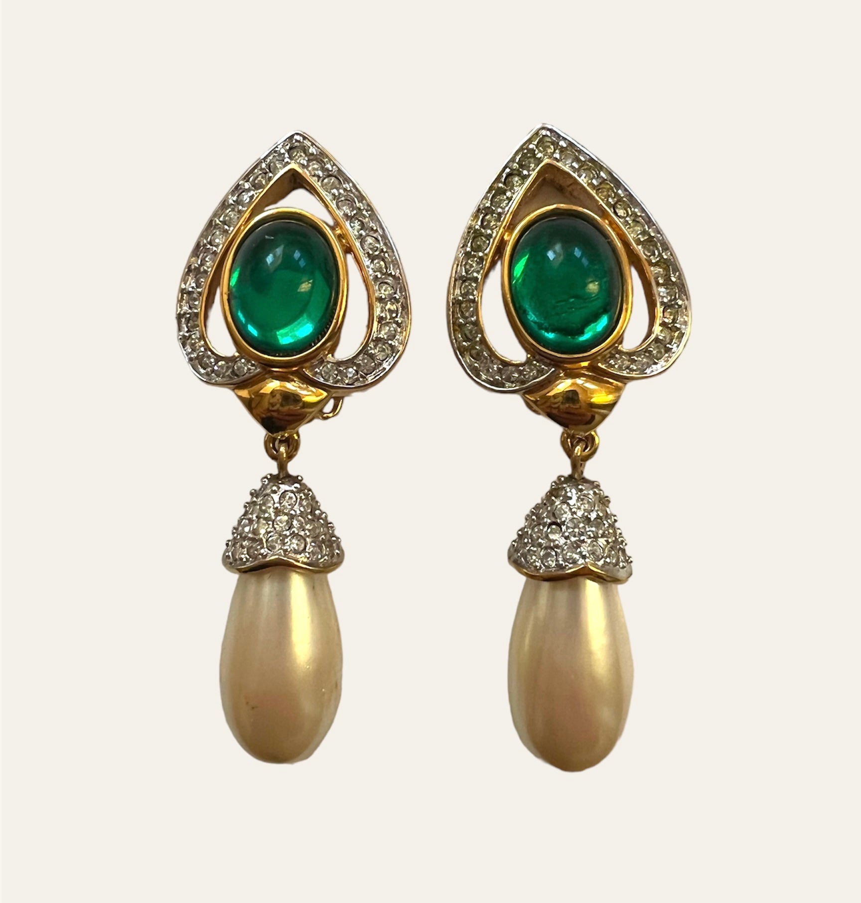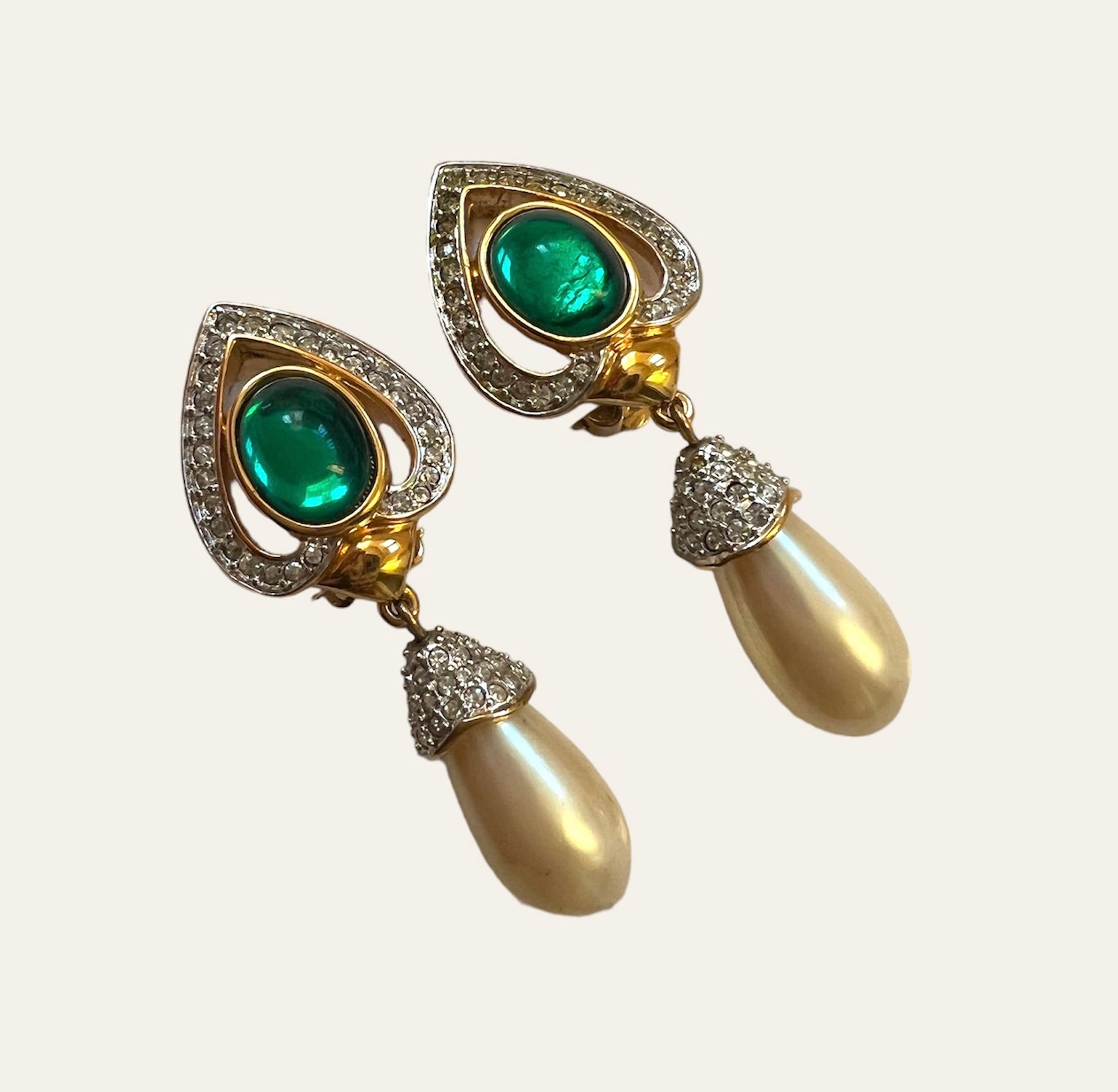 Elegant gold tone earrings with faux pearls, clear rhinestones and green lucite beads.