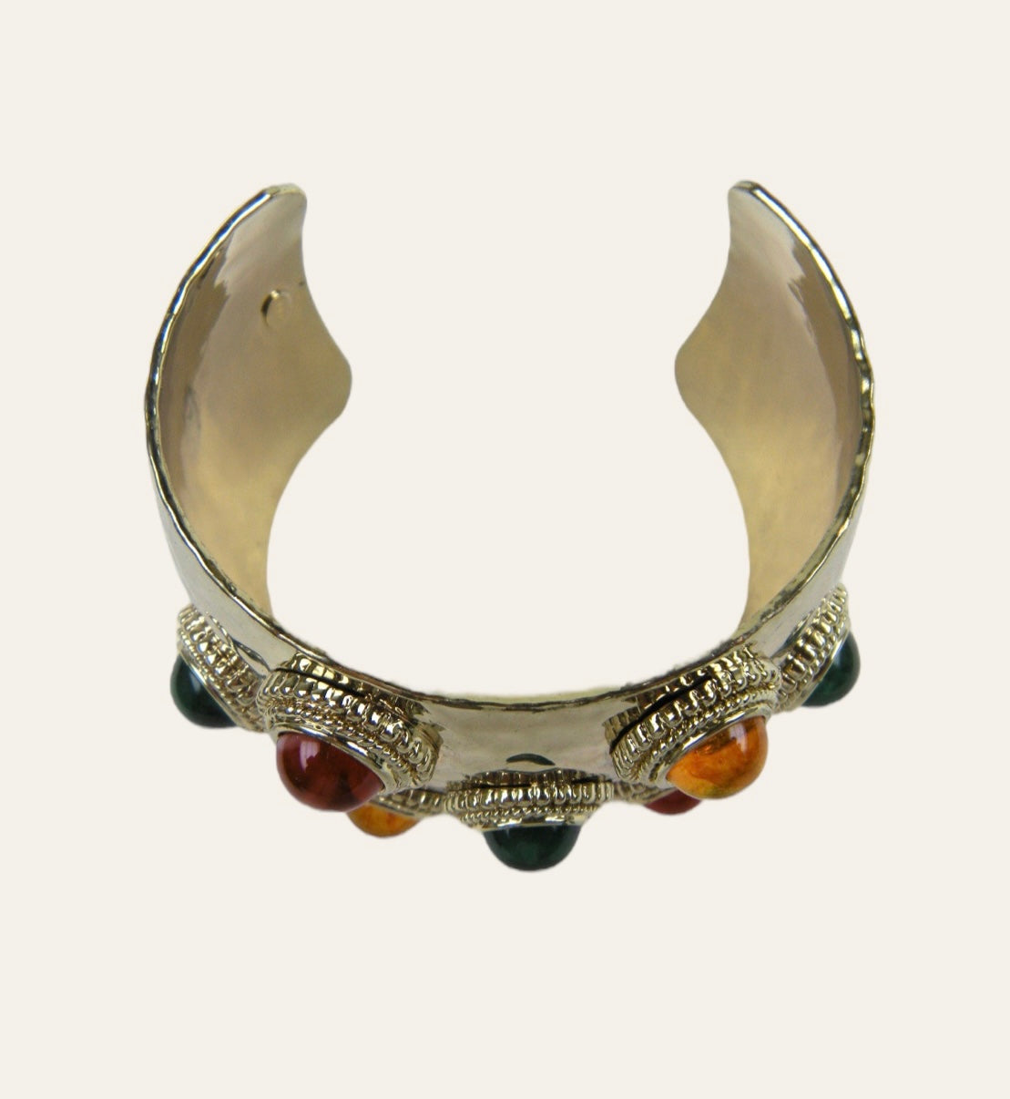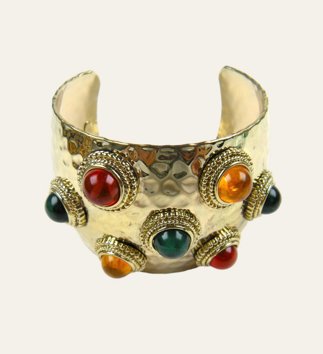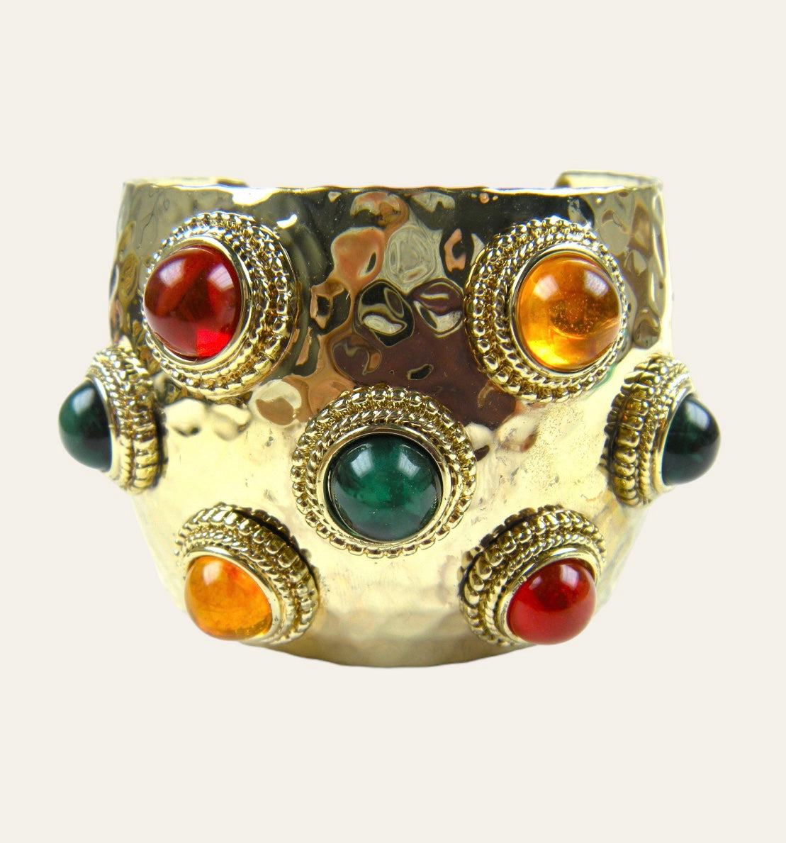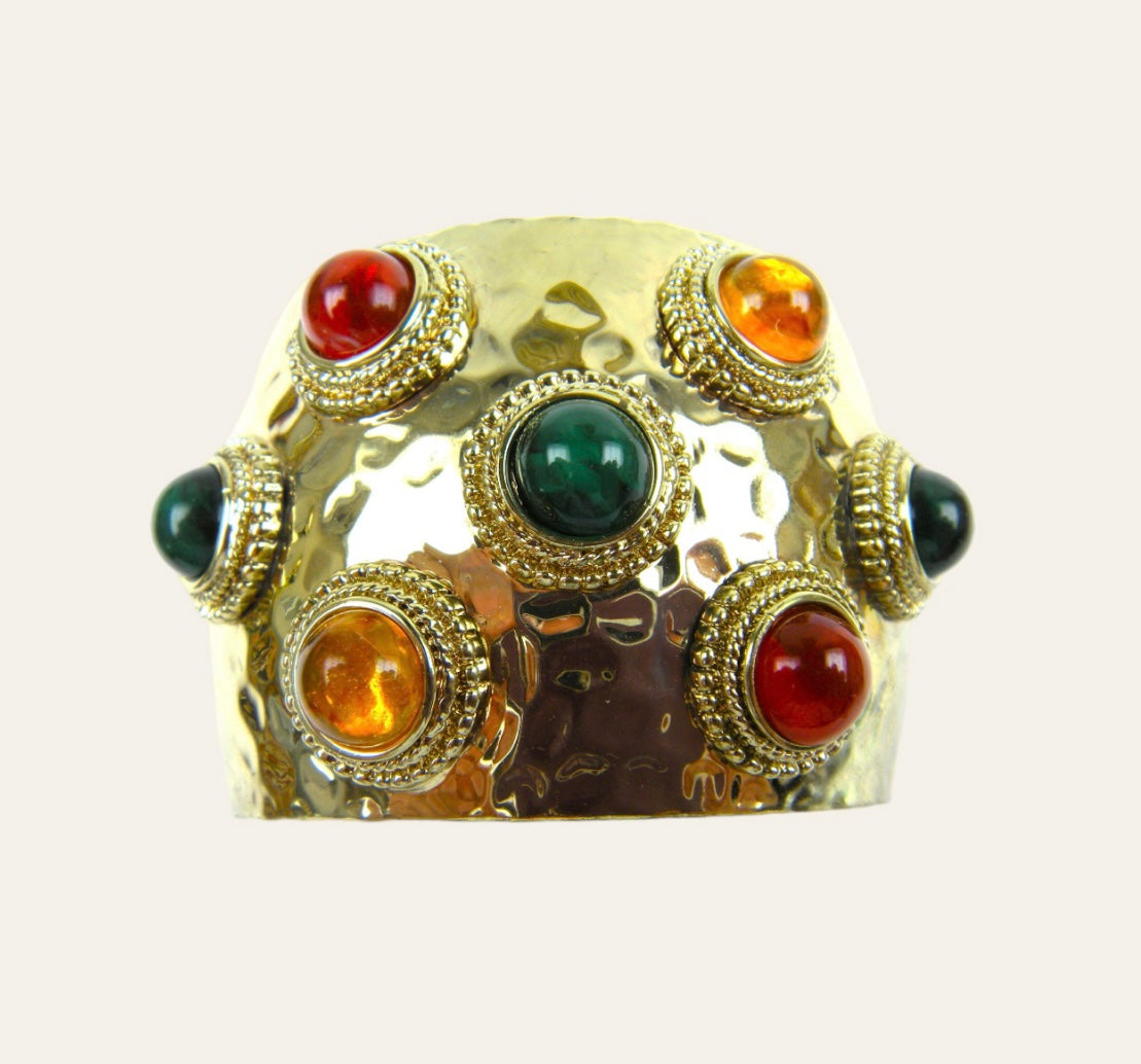 Gorgeous unsigned hammered bangle featuring jewel tone cabochons in gold plated setting.