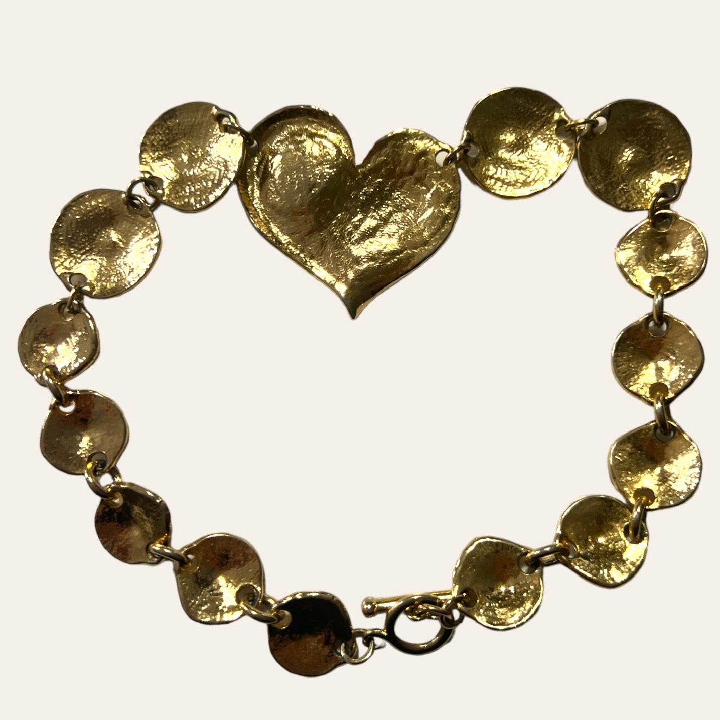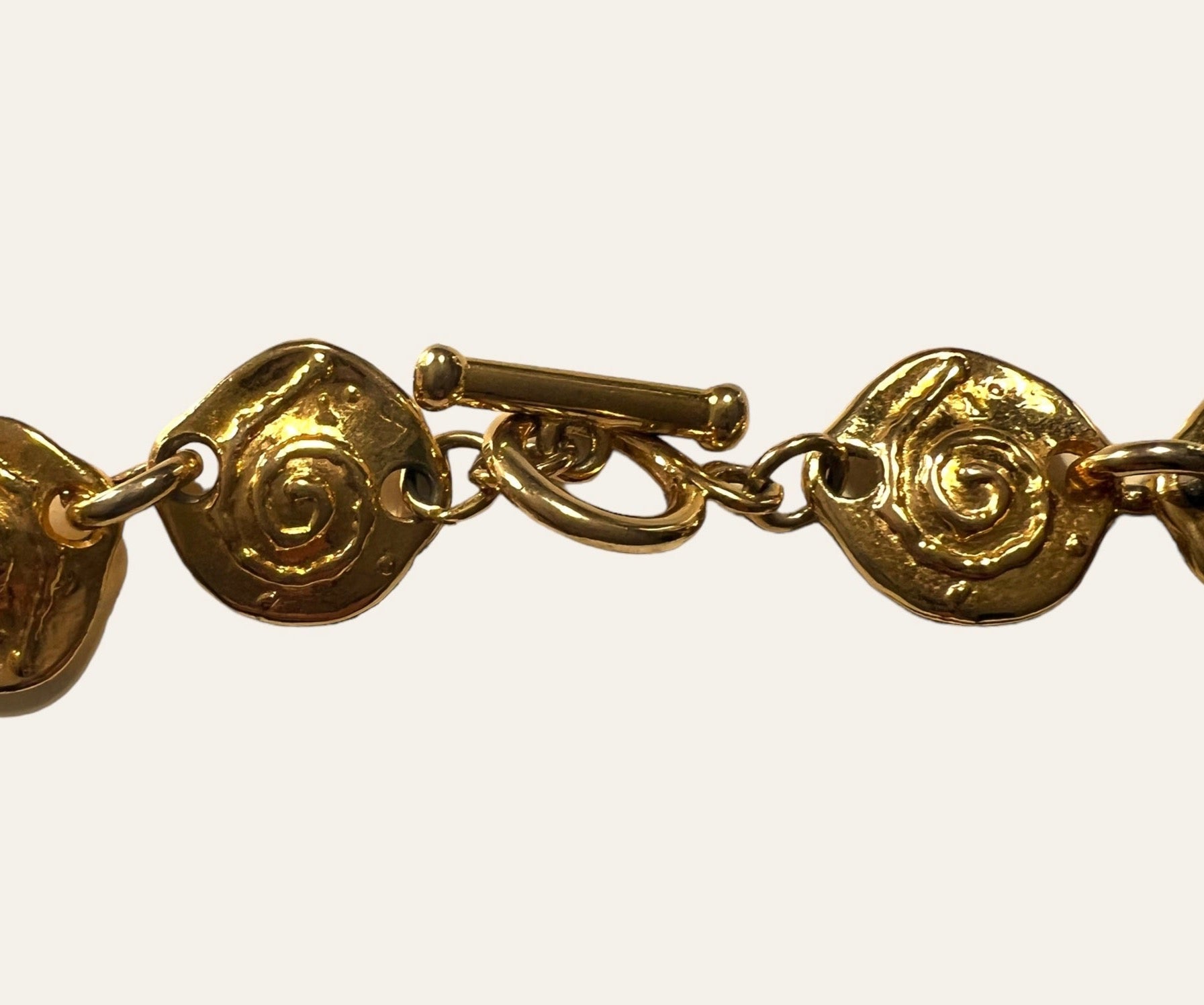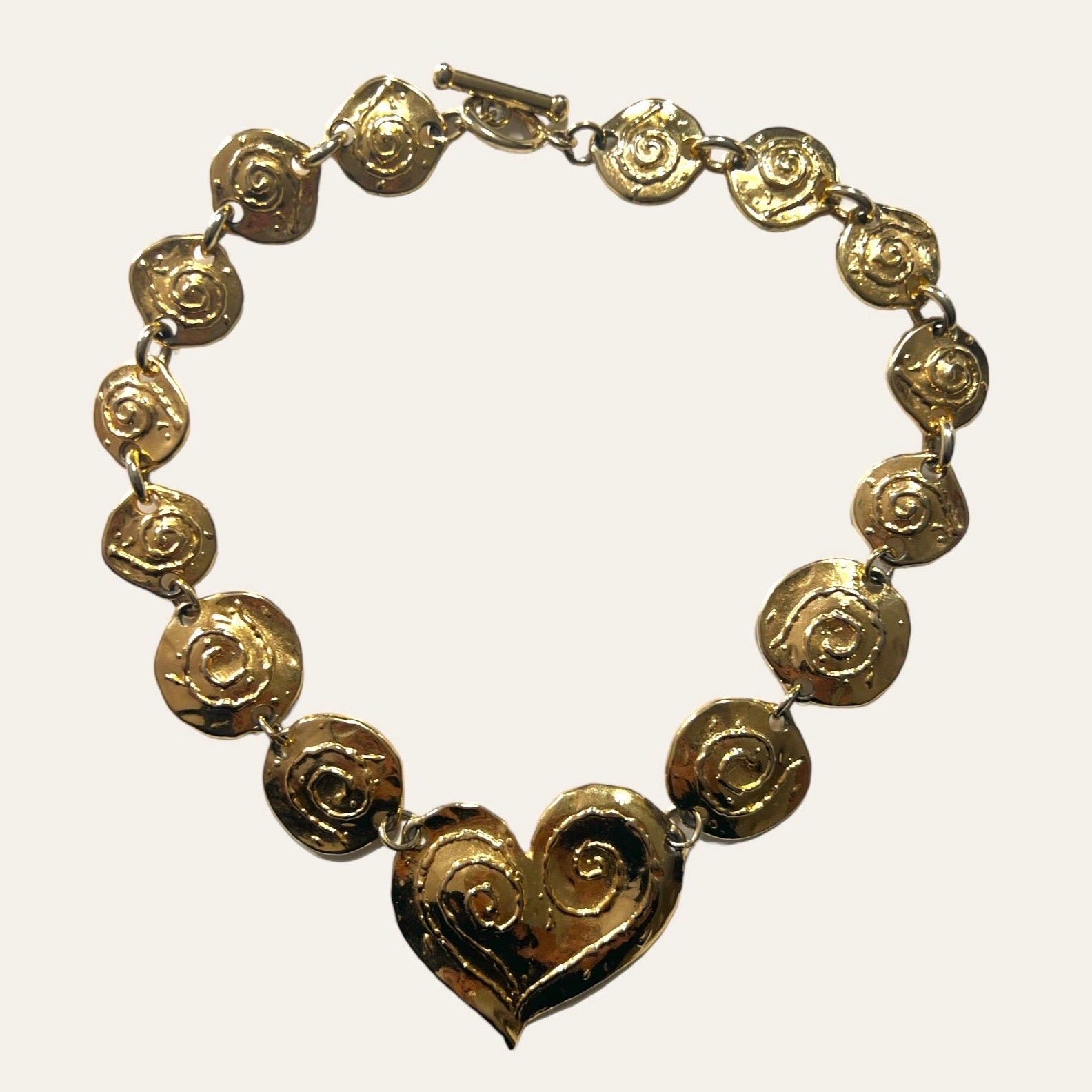 Vintage hammered shiny gold tone heart collar necklace with spirals motifs on circular links as well as the large heart pendant, the main character of this beautiful piece <3 Pictures don't do justice!